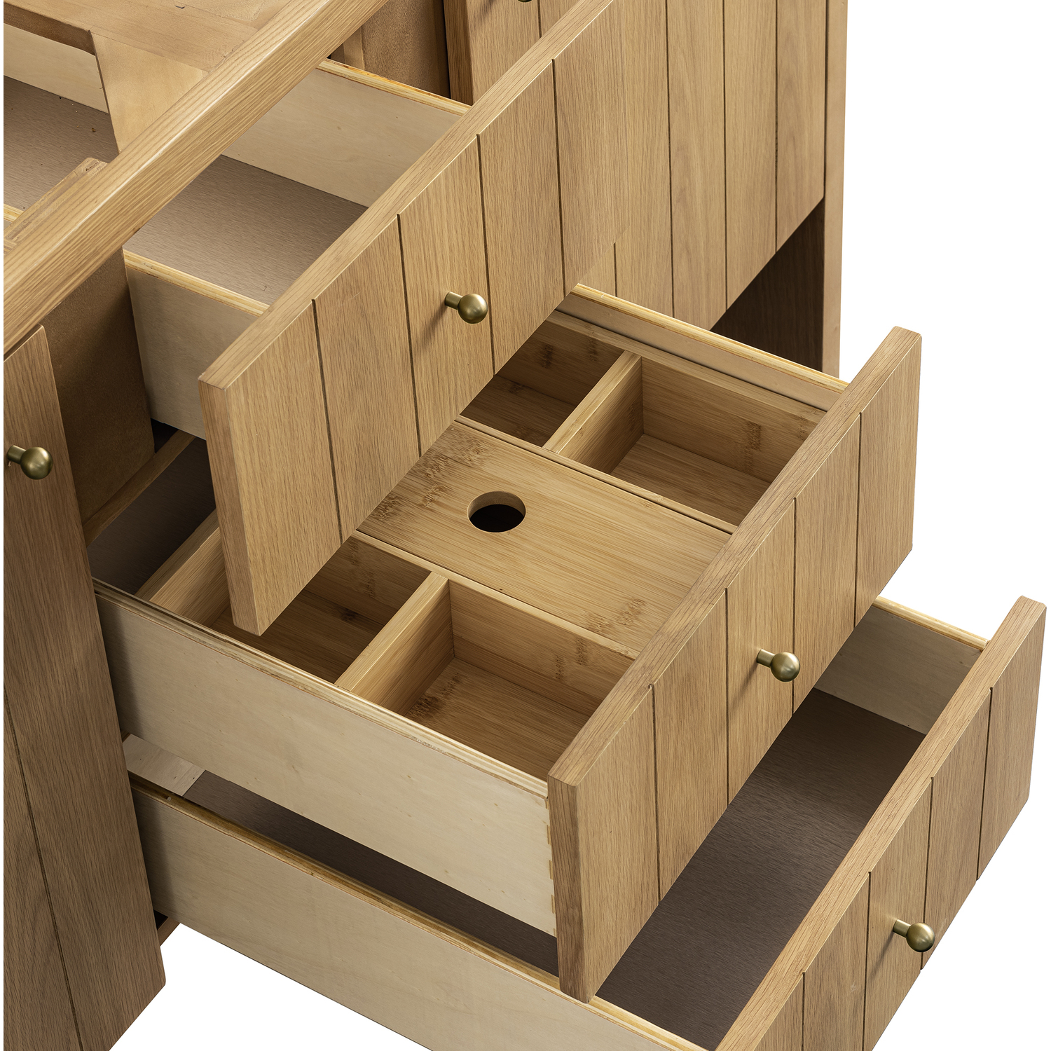 The cathedral grain White Oak veneers and modern panel detailing on the doors and return panels give the Hudson collection the look of fine furnishings that is unexpected yet welcome for the bathroom space. The 60" Hudson Double Vanity features three geneThis cabinet is constructed with ash solids and Flat Cut White Oak veneers over a plywood core and is sealed inside and outside with our premium moisture and UV resistant coatings.Two door cabinet with interior, adjustable height shelves and four drawers. One is interior drawer.Includes one removable Bamboo drawer organizer tray,Includes cabinet only. Choose from any of our 3 CM top options (sold separately)Plywood drawer boxes feature English Dovetail joinery and our signature brushed aluminum laminate drawer liners for easy cleaningDual Power and USB portsDecorative knobs in Champagne BrassSoft-close, undermount drawer glides and soft-close door hingesA sophisticated pairing of Mid-Century modern and Farmhouse styles, the Hudson collection stands out with a sleek paneled design. The cathedral woodgrain is accented with Champagne Brass knobs. Housing ample storage, this collection perfectly balances pra1 year warranty against manufacturer's defects. We will repair or replace any defective product, if the product is defective in material or workmanship at our discretion. No warranty is expressed or implied regarding damages resulting from consumer misuse.