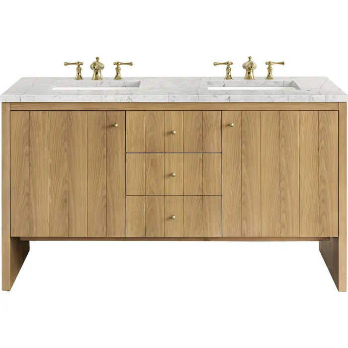 The Hudson 60" Double Bathroom Vanity by James Martin Vanities combines modern luxury with exceptional functionality. Its cathedral grain Flat Cut Ash veneers and refined panel detailing on the doors and drawer fronts evoke the look of fine furnishings, bringing a touch of unexpected elegance to your bathroom space. This spacious vanity is designed for superior organization with three generous drawers and a removable bamboo drawer organizer for added convenience. Featuring two cabinet doors, the right side opens to reveal a convenient USB/120V power outlet, while the left opens to an additional hidden drawer, providing discreet storage. The look is completed by an elegant Eternal Jasmine Pearl Silestone® top, providing a stunning finishing touch to your bathroom design. This unit is enabled with FreePower wireless charging; featuring a single-device charger seamlessly embedded into the countertop, indicated by a light-up halo in between the sinks. Designed for modern living, FreePower offers convenient, integrated, wireless charging when and where you need it.FreePower Wireless Charging; single-device unit in between sinksTwo-door cabinet, each opening to an internal shelf, with four full-extension drawers (one internal)Drawer boxes feature English Dovetail joinery with premium, soft-close undermount drawer glides and doors feature soft-close, adjustable door hingesCabinet features a multi-stage premium finish coat to offer UV and moisture resistanceLight Natural Oak finish with Champagne Brass hardwareCountertop is pre-drilled for 8" widespread faucet(s); our 3cm eased edge countertops come with white porcelain rectangular sink(s) that ship separately and include mounting brackets for easy installationIntegrated 120V outlet with USB portsDrawers lined with our signature brushed aluminum laminate for easy cleaningBamboo drawer organizer includedMatching stone backsplash available as add-on purchaseFreestanding VanityFaucet sold separatelyCombining the timeless allure of Mid-Century Modern with the rustic charm of Farmhouse design, the Hudson Collection by James Martin Vanities captivates with its sleek paneled design. Featuring warm cathedral woodgrain adorned with Champagne Brass knobs and housing ample storage, this collection effortlessly balances practicality with sophisticated detailing.1 year warranty against manufacturer's defects. We will repair or replace any defective product, if the product is defective in material or workmanship at our discretion. No warranty is expressed or implied regarding damages resulting from consumer misuse.