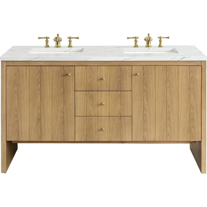 The Hudson 60" Double Bathroom Vanity by James Martin Vanities combines modern luxury with exceptional functionality. Its cathedral grain Flat Cut Ash veneers and refined panel detailing on the doors and drawer fronts evoke the look of fine furnishings, bringing a touch of unexpected elegance to your bathroom space. This spacious vanity is designed for superior organization with three generous drawers and a removable bamboo drawer organizer for added convenience. Featuring two cabinet doors, the right side opens to reveal a convenient USB/120V power outlet, while the left opens to an additional hidden drawer, providing discreet storage. The look is completed by a Ethereal Noctis Silestone® top, providing a stunning finishing touch to your bathroom design. This unit is enabled with FreePower wireless charging; featuring a single-device charger seamlessly embedded into the countertop, indicated by a light-up halo in between the sinks. Designed for modern living, FreePower offers convenient, integrated, wireless charging when and where you need it.FreePower Wireless Charging; single-device unit in between sinksTwo-door cabinet, each opening to an internal shelf, with four full-extension drawers (one internal)Drawer boxes feature English Dovetail joinery with premium, soft-close undermount drawer glides and doors feature soft-close, adjustable door hingesCabinet features a multi-stage premium finish coat to offer UV and moisture resistanceLight Natural Oak finish with Champagne Brass hardwareCountertop is pre-drilled for 8" widespread faucet(s); our 3cm eased edge countertops come with white porcelain rectangular sink(s) that ship separately and include mounting brackets for easy installationIntegrated 120V outlet with USB portsDrawers lined with our signature brushed aluminum laminate for easy cleaningBamboo drawer organizer includedMatching stone backsplash available as add-on purchaseFreestanding VanityFaucet sold separatelyCombining the timeless allure of Mid-Century Modern with the rustic charm of Farmhouse design, the Hudson Collection by James Martin Vanities captivates with its sleek paneled design. Featuring warm cathedral woodgrain adorned with Champagne Brass knobs and housing ample storage, this collection effortlessly balances practicality with sophisticated detailing.1 year warranty against manufacturer's defects. We will repair or replace any defective product, if the product is defective in material or workmanship at our discretion. No warranty is expressed or implied regarding damages resulting from consumer misuse.