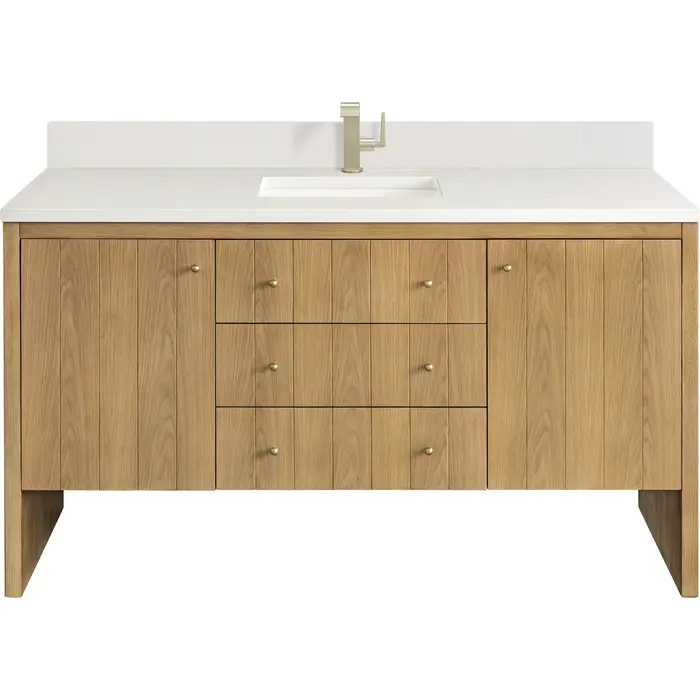 The cathedral grain Flat Cut Ash veneers and modern panel detailing on the doors and return panels give the Hudson collection the look of fine furnishings that is unexpected yet welcome for the bathroom space. The 60" Hudson Single Vanity features two generous drawers, one tip-out style drawer, and one removable bamboo storage organizer tray, allowing for optimum organization. The right side door reveals a convenient dual-power USB outlet, while the left conceals an additional drawer. A classic, crisp 3 CM White Zeus Silestone Top and backsplash with undermount sink perfectly complements the finish.Vanity set includes a 3cm eased edge White Zeus Silestone top with matching backsplash, a white porcelain rectangular sink and mounting brackets for easy installation. Top is pre-drilled for single hole faucet. Faucet not included.Two door cabinet with two interior, adjustable height shelves and four drawers, the top row drawer is tip-out style. One is interior drawer.Constructed with Ash solids and Flat Cut Ash veneers over a plywood core and is sealed inside and outside with our premium moisture and UV resistant coatings.Drawer boxes are constructed using English Dovetail joinery, feature soft-close undermount glides and a Brushed Aluminum laminate drawer bottom.Satin Nickel hardwareIncludes one removable Bamboo drawer organizer trayMatching White Zeus 3cm Silestone backsplash included.Faucet sold separatelyA sophisticated pairing of Mid-Century modern and Farmhouse styles, the Hudson collection stands out with a sleek paneled design. The cathedral woodgrain is accented with Champagne Brass knobs. Housing ample storage, this collection perfectly balances practicality and chic detailing.1 year warranty against manufacturer's defects. We will repair or replace any defective product, if the product is defective in material or workmanship at our discretion. No warranty is expressed or implied regarding damages resulting from consumer misuse.