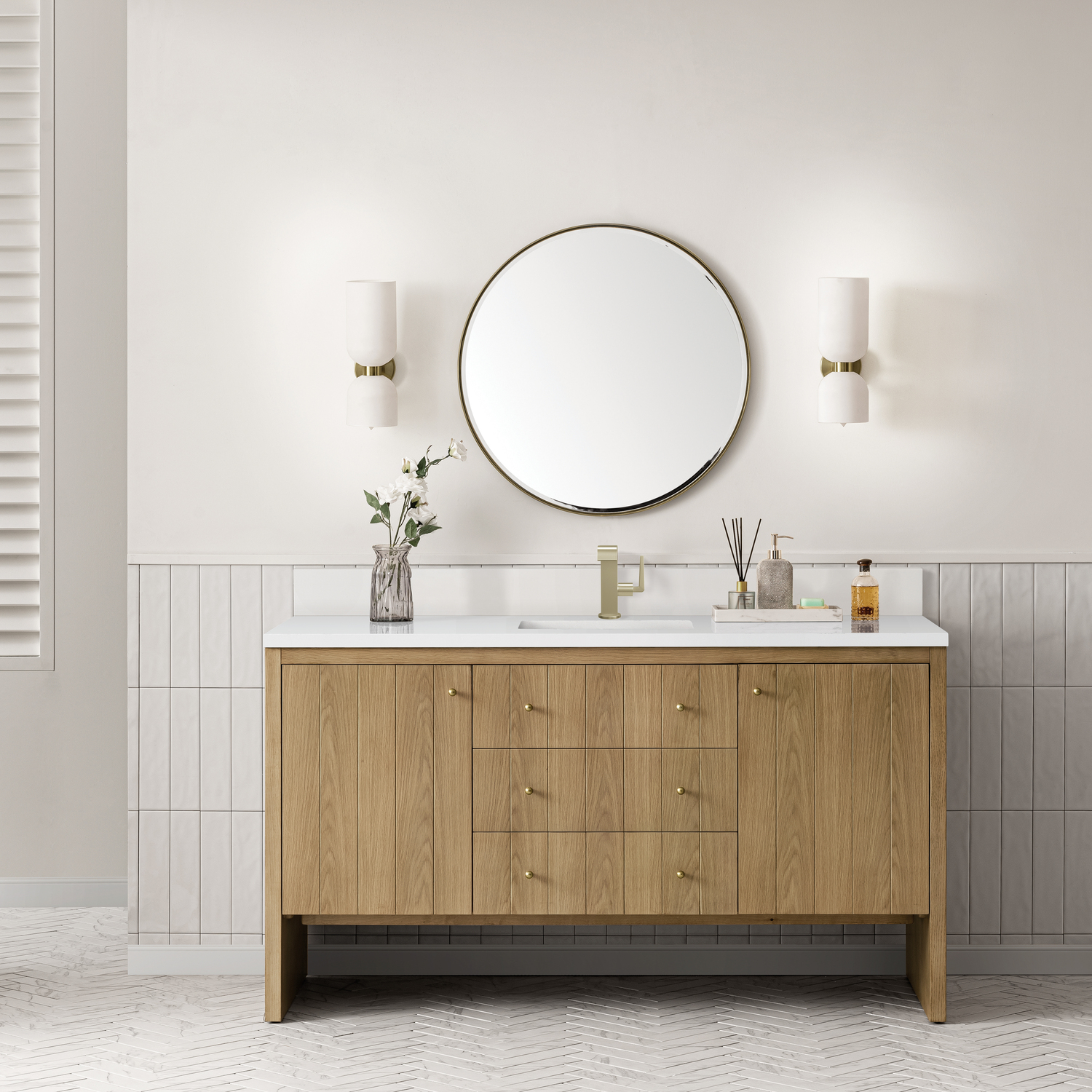 James Martin Hudson 60 inch Single Vanity, Light Natural Oak w/ Single Hole 3 CM White Zeus Top & Backsplash, 840108976841, 435-V60S-LNO-1WZ