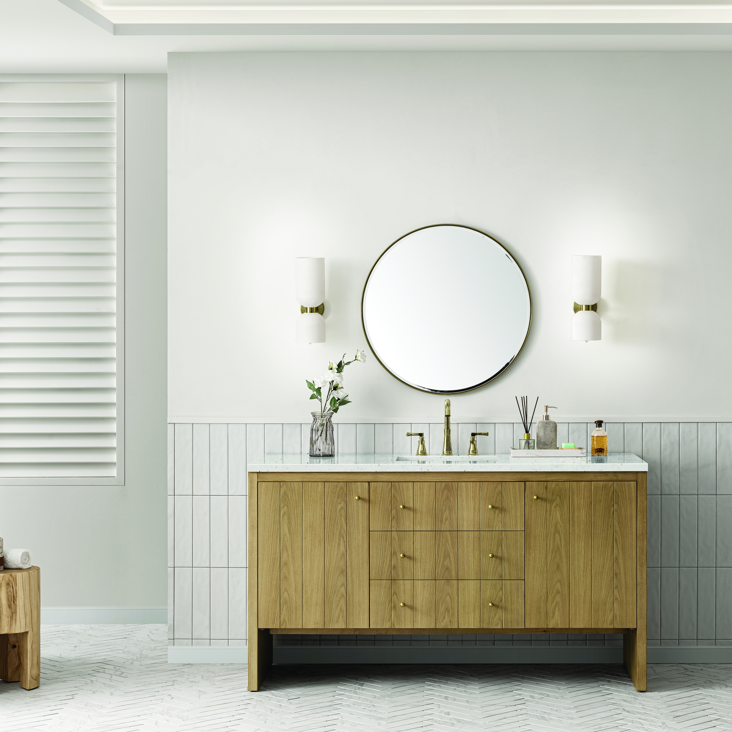 The cathedral grain Flat Cut Ash veneers and modern panel detailing on the doors and return panels give the Hudson collection the look of fine furnishings that is unexpected yet welcome for the bathroom space. The 60" Hudson Single Vanity features two generous drawers, one tip-out style drawer, and one removable bamboo storage organizer tray, allowing for optimum organization. The right side door reveals a convenient dual-power USB outlet, while the left conceals an additional drawer. The Lime Delight Silestone top lends warm, textured beige tones to perfectly complement the Light Natural Oak finish on the vanity.Vanity set includes a 3cm eased edge Limestone Delight Silestone top. Includes a white porcelain rectangular undermount sink that ships separately and mounting brackets for easy installation. Top is pre-drilled for 8" widespread faucet. Faucet not includeTwo door cabinet with two interior, adjustable height shelves and four drawers, the top row drawer is tip-out style. One is interior drawer.Constructed with Ash solids and Flat Cut Ash veneers over a plywood core and is sealed inside and outside with our premium moisture and UV resistant coatings.Drawer boxes are constructed using English Dovetail joinery, feature soft-close undermount glides and a Brushed Aluminum laminate drawer bottom.Satin Nickel hardwareIncludes one removable Bamboo drawer organizer trayFaucet sold separatelyCountertop is pre-drilled for one 3-hole 8" spreadA sophisticated pairing of Mid-Century modern and Farmhouse styles, the Hudson collection stands out with a sleek paneled design. The cathedral woodgrain is accented with Champagne Brass knobs. Housing ample storage, this collection perfectly balances practicality and chic detailing.1 year warranty against manufacturer's defects. We will repair or replace any defective product, if the product is defective in material or workmanship at our discretion. No warranty is expressed or implied regarding damages resulting from consumer misuse.