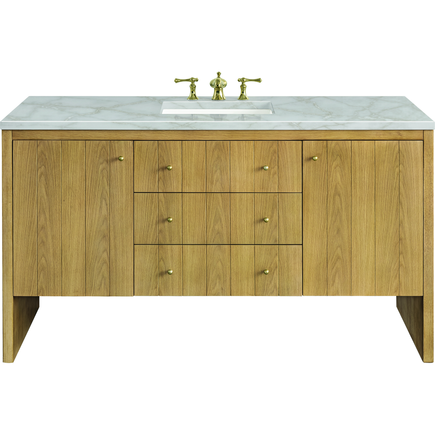 The Hudson 60" Single Vanity by James Martin Vanities brings the sophistication of fine furniture to your bathroom with its cathedral grain Flat Cut Ash veneers and sleek modern panel detailing on the door and drawer fronts. This thoughtfully designed vanity offers ample storage with two standard full-extension drawers, a convenient top-row tip-out drawer, and a removable bamboo drawer organizer. The right-side door opens to reveal a 120V power outlet with USB ports for easy charging, while the left-side door conceals an additional interior drawer. The look is completed by an elegant Victorian Silver Silestone® top and undermount sink. This unit is enabled with FreePower wireless charging; featuring a single-device charger seamlessly embedded into the countertop, indicated by a light-up halo to the left of the sink. Designed for modern living, FreePower offers convenient, integrated, wireless charging when and where you need it.Two single-door cabinets with interior shelves; one top-row tip-out drawer, two full-extension exterior drawers, and one interior drawerDrawer boxes feature English Dovetail joinery with premium, soft-close undermount drawer glides and doors feature soft-close, adjustable door hingesCabinet features a multi-stage premium finish coat to offer UV and moisture resistanceLight Natural Oak finish with Champagne Brass hardwareCountertop is pre-drilled for an 8" widespread faucet; our 3cm eased edge countertops come with white porcelain rectangular sink(s) that ship separately and include mounting brackets for easy installationIntegrated 120V outlet with USB portsDrawers lined with our signature brushed aluminum laminate for easy cleaningBamboo drawer organizer includedFreestanding VanityFreePower Wireless Charging; single-device unit left of sinkFaucet sold separatelyMatching stone backsplash available as add-on purchaseCombining the timeless allure of Mid-Century Modern with the rustic charm of Farmhouse design, the Hudson Collection by James Martin Vanities captivates with its sleek paneled design. Featuring warm cathedral woodgrain adorned with Champagne Brass knobs and housing ample storage, this collection effortlessly balances practicality with sophisticated detailing.1 year warranty against manufacturer's defects. We will repair or replace any defective product, if the product is defective in material or workmanship at our discretion. No warranty is expressed or implied regarding damages resulting from consumer misuse.