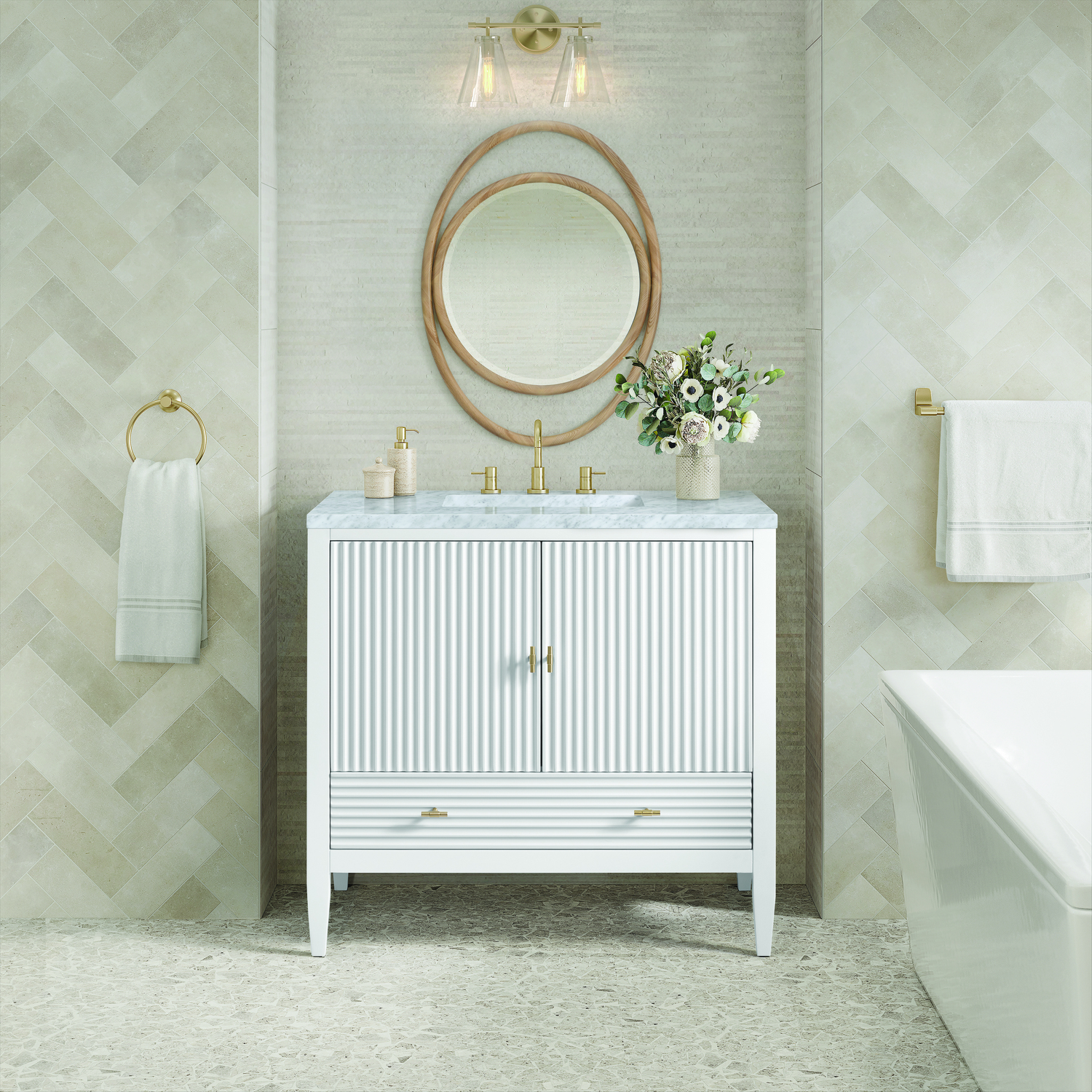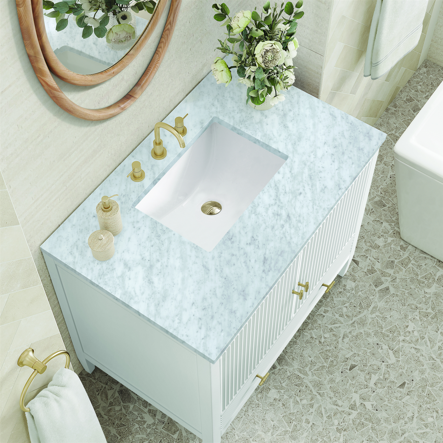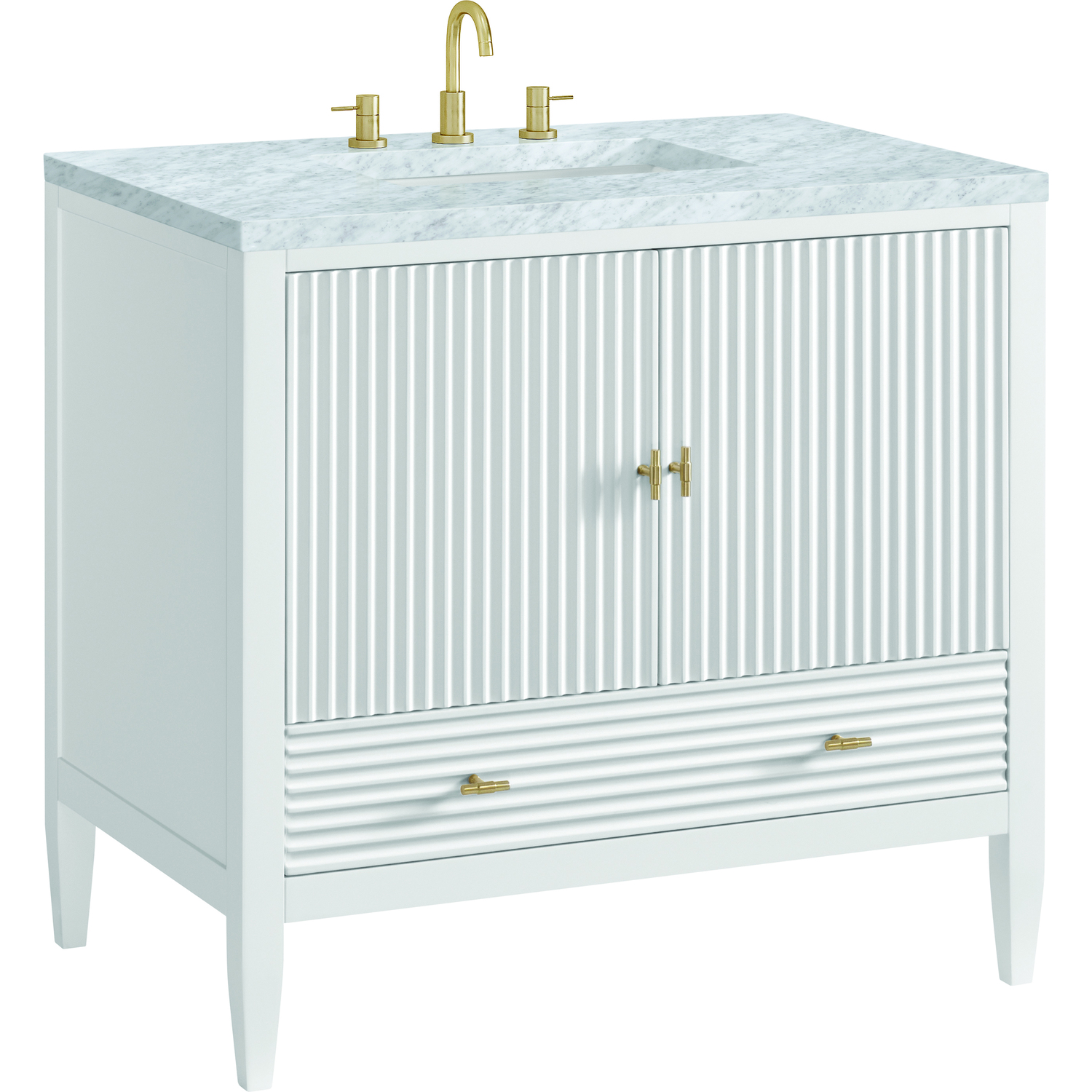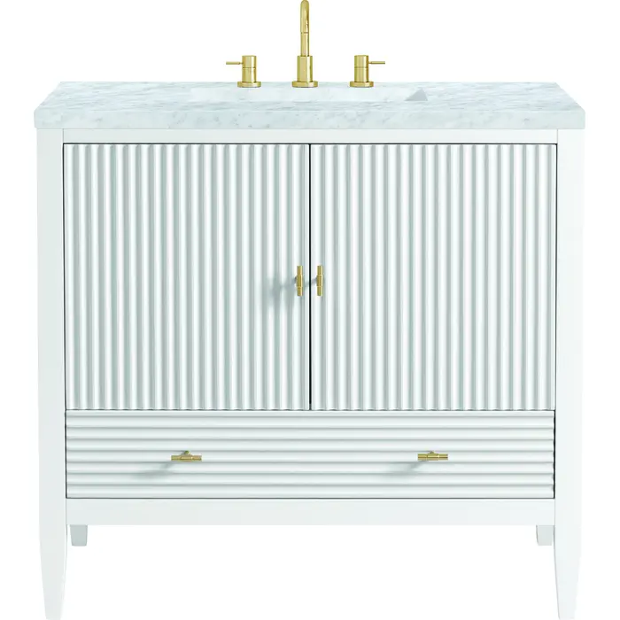 The 36" Myrrin Single Vanity features a minimalistic silhouette with fluted details, resulting in a blend of classical elegance and contemporary design. The deeply fluted panels run perpendicular on the doors and drawers, adding sophistication and visual interest to the design. Toggle-style knobs in Champagne Brass provide a luxe accent to the rich Bright White finish. The two-door cabinet opens to a spacious interior with a single shelf and a convenient USB/Electric power outlet. A single, lower-level drawer lends additional storage. Completing this vanity, are the treasured, neutral tones and textures of the Carrara marble vanity top display an white background with delicate grey veining.Vanity set includes a 3cm eased edge Carrara Marble top. Includes white porcelain rectangular undermount sink that ships separately and mounting brackets for easy installation. Top is pre-drilled for 8" widespread faucet. Faucet not included.Constructed with a solid wood frame and plywood panelsOne 120-volt UL rated electric outlet with USB ports and bamboo organizer includedIncludes two soft-close doors concealing an open cabinet space. Also features one soft-close lower drawer with undermount glides and an installed divider.Toggle style door pulls in Champagne Brass finish.The drawer boxes feature English Dovetail joinery, and our signature brushed aluminum laminate drawer liners for easy cleaning.Includes one removable Bamboo drawer organizer.Cabinets are sealed with a premium finish for superior moisture and UV resistance.The deeply fluted panels of the Myrrin collection, framed in a sleek, minimalistic silhouette, bring an harmonious blend of classical elegance and contemporary design. The geometric play on the contrasting panels not only adds visual interest but also opens to reveal ample storage and organization. Offered in 4 sizes and 3 choices of finishes, each is complemented by Champagne Brass toggle-style knobs for a luxurious finishing touch.1 year warranty against manufacturer's defects. We will repair or replace any defective product, if the product is defective in material or workmanship at our discretion. No warranty is expressed or implied regarding damages resulting from consumer misuse.