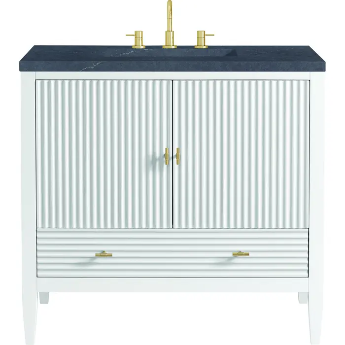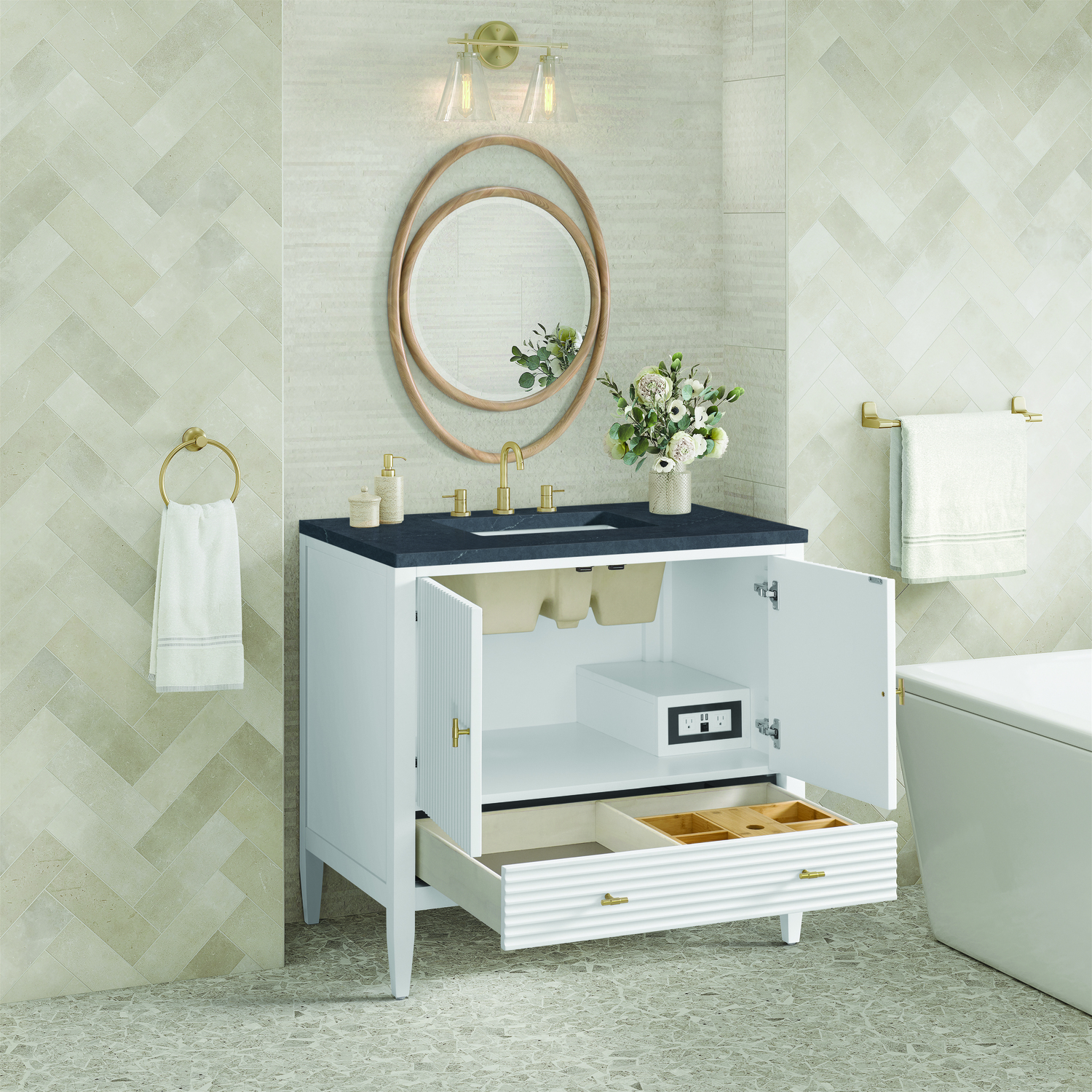 The 36" Myrrin Single Vanity features a minimalistic silhouette with fluted details, resulting in a blend of classical elegance and contemporary design. The deeply fluted panels run perpendicular on the doors and drawers, adding sophistication and visual interest to the design. Toggle-style knobs in Champagne Brass provide a luxe accent to the rich Bright White finish. The two-door cabinet opens to a spacious interior with a single shelf and a convenient USB/Electric power outlet. A single, lower-level drawer lends additional storage. Completing this piece is a distinguished top, characterized by depth and a sense of movement with a suede finish. The Charcoal Soapstone Silestone top by Cosentino has the new n-boost technology, which helps prevent the adhesion of liquids, enhances shine, and intensifies the color of this top.Vanity set includes a 3cm eased edge Charcoal Soapstone Silestone top, a white porcelain rectangular sink and mounting brackets for easy installation. Top is pre-drilled for an 8" widespread faucet. Faucet not included.Constructed with a solid wood frame and plywood panelsOne 120-volt UL rated electric outlet with USB ports and bamboo organizer includedIncludes two soft-close doors concealing an open cabinet space. Also features one soft-close lower drawer with undermount glides and an installed divider.Toggle style door pulls in Champagne Brass finish.The drawer boxes feature English Dovetail joinery, and our signature brushed aluminum laminate drawer liners for easy cleaning.Includes one removable Bamboo drawer organizer.Cabinets are sealed with a premium finish for superior moisture and UV resistance.The deeply fluted panels of the Myrrin collection, framed in a sleek, minimalistic silhouette, bring an harmonious blend of classical elegance and contemporary design. The geometric play on the contrasting panels not only adds visual interest but also opens to reveal ample storage and organization. Offered in 4 sizes and 3 choices of finishes, each is complemented by Champagne Brass toggle-style knobs for a luxurious finishing touch.1 year warranty against manufacturer's defects. We will repair or replace any defective product, if the product is defective in material or workmanship at our discretion. No warranty is expressed or implied regarding damages resulting from consumer misuse.