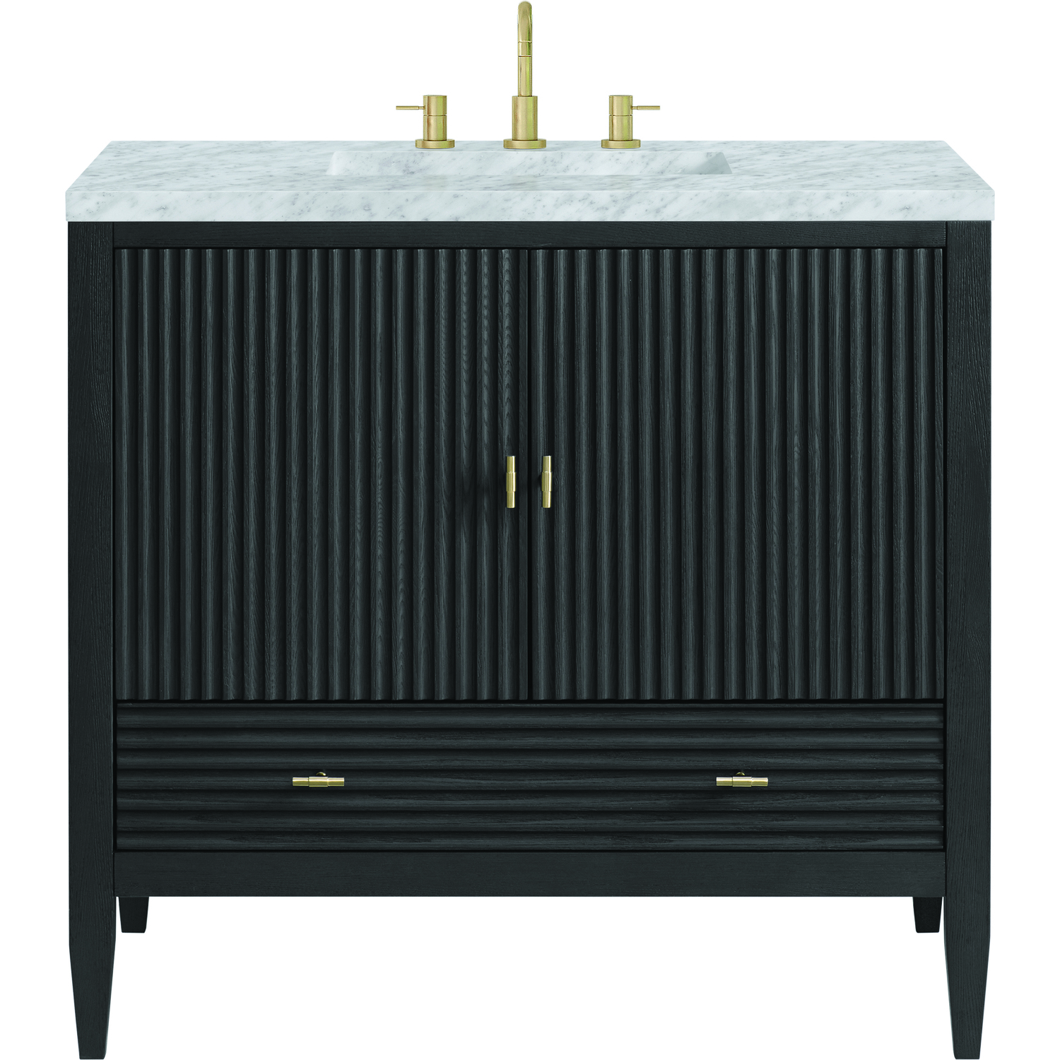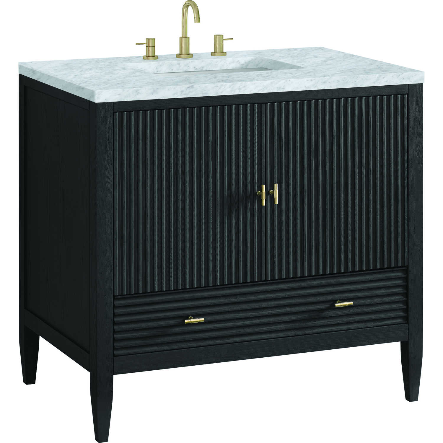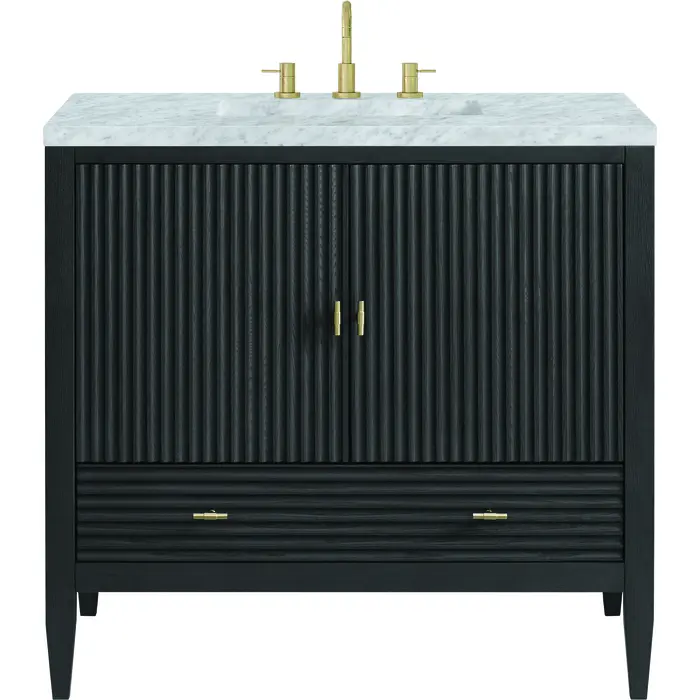 The 36" Myrrin Single Vanity features a minimalistic silhouette with fluted details, resulting in a blend of classical elegance and contemporary design. The deeply fluted panels run perpendicular on the doors and drawers, adding sophistication and visual interest to the design. Toggle-style knobs in Champagne Brass provide a luxe accent to the sophisticated Carbon Oak finish. The two-door cabinet opens to a spacious interior with a single shelf and a convenient USB/Electric power outlet. A single, lower-level drawer lends additional storage. Completing this vanity, are the treasured, neutral tones and textures of the Carrara marble vanity top display an white background with delicate grey veining.Vanity set includes a 3cm eased edge Carrara Marble top. Includes white porcelain rectangular undermount sink that ships separately and mounting brackets for easy installation. Top is pre-drilled for 8" widespread faucet. Faucet not included.Constructed with a solid Ash wood frame and Ash veneers over plywood panels and sealed with our premium moisture and UV resistant coatingsOne 120-volt UL rated electric outlet with USB ports and bamboo organizer includedIncludes two soft-close doors concealing an open cabinet space. Also features one soft-close lower drawer with undermount glides and an installed divider.Toggle style door pulls in Champagne Brass finish.The drawer boxes feature English Dovetail joinery, and our signature brushed aluminum laminate drawer liners for easy cleaning.Includes one removable Bamboo drawer organizer.Cabinets are sealed with a premium finish for superior moisture and UV resistance.The deeply fluted panels of the Myrrin collection, framed in a sleek, minimalistic silhouette, bring an harmonious blend of classical elegance and contemporary design. The geometric play on the contrasting panels not only adds visual interest but also opens to reveal ample storage and organization. Offered in 4 sizes and 3 choices of finishes, each is complemented by Champagne Brass toggle-style knobs for a luxurious finishing touch.1 year warranty against manufacturer's defects. We will repair or replace any defective product, if the product is defective in material or workmanship at our discretion. No warranty is expressed or implied regarding damages resulting from consumer misuse.