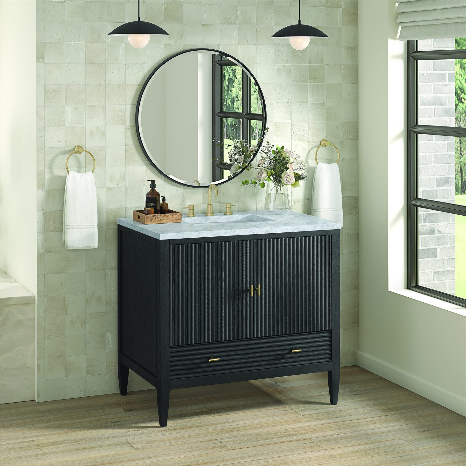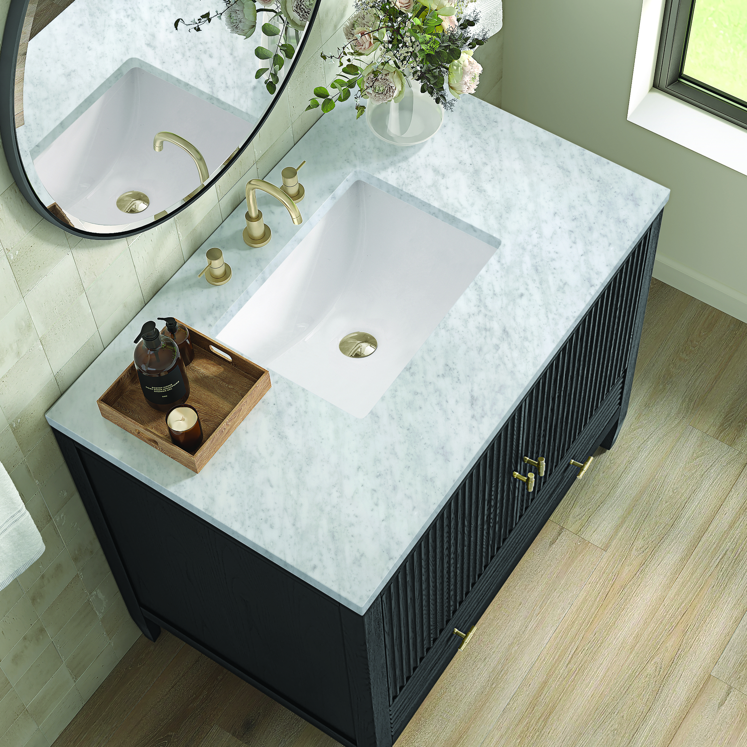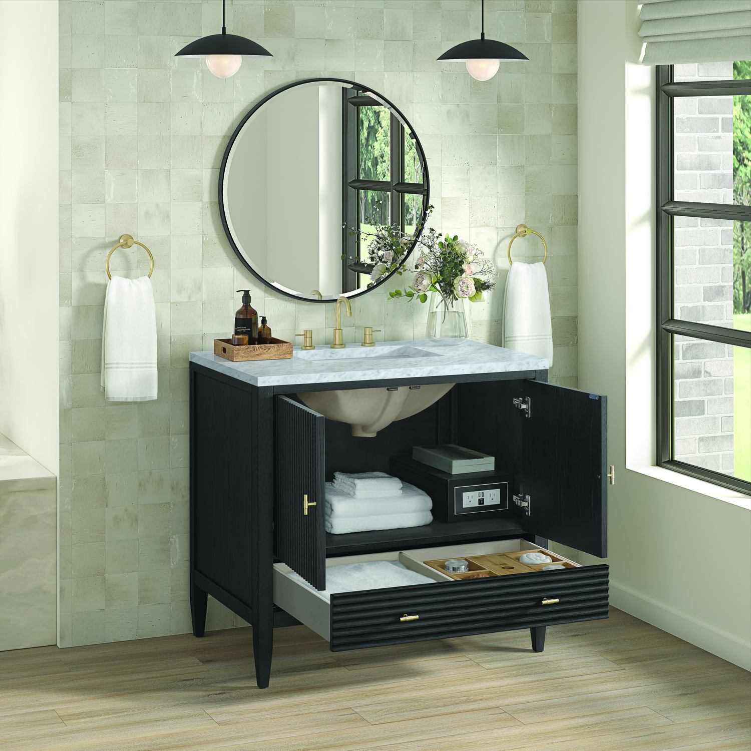 The 36" Myrrin Single Vanity features a minimalistic silhouette with fluted details, resulting in a blend of classical elegance and contemporary design. The deeply fluted panels run perpendicular on the doors and drawers, adding sophistication and visual interest to the design. Toggle-style knobs in Champagne Brass provide a luxe accent to the sophisticated Carbon Oak finish. The two-door cabinet opens to a spacious interior with a single shelf and a convenient USB/Electric power outlet. A single, lower-level drawer lends additional storage. Completing this vanity, are the treasured, neutral tones and textures of the Carrara marble vanity top display an white background with delicate grey veining.Vanity set includes a 3cm eased edge Carrara Marble top. Includes white porcelain rectangular undermount sink that ships separately and mounting brackets for easy installation. Top is pre-drilled for 8" widespread faucet. Faucet not included.Constructed with a solid Ash wood frame and Ash veneers over plywood panels and sealed with our premium moisture and UV resistant coatingsOne 120-volt UL rated electric outlet with USB ports and bamboo organizer includedIncludes two soft-close doors concealing an open cabinet space. Also features one soft-close lower drawer with undermount glides and an installed divider.Toggle style door pulls in Champagne Brass finish.The drawer boxes feature English Dovetail joinery, and our signature brushed aluminum laminate drawer liners for easy cleaning.Includes one removable Bamboo drawer organizer.Cabinets are sealed with a premium finish for superior moisture and UV resistance.The deeply fluted panels of the Myrrin collection, framed in a sleek, minimalistic silhouette, bring an harmonious blend of classical elegance and contemporary design. The geometric play on the contrasting panels not only adds visual interest but also opens to reveal ample storage and organization. Offered in 4 sizes and 3 choices of finishes, each is complemented by Champagne Brass toggle-style knobs for a luxurious finishing touch.1 year warranty against manufacturer's defects. We will repair or replace any defective product, if the product is defective in material or workmanship at our discretion. No warranty is expressed or implied regarding damages resulting from consumer misuse.