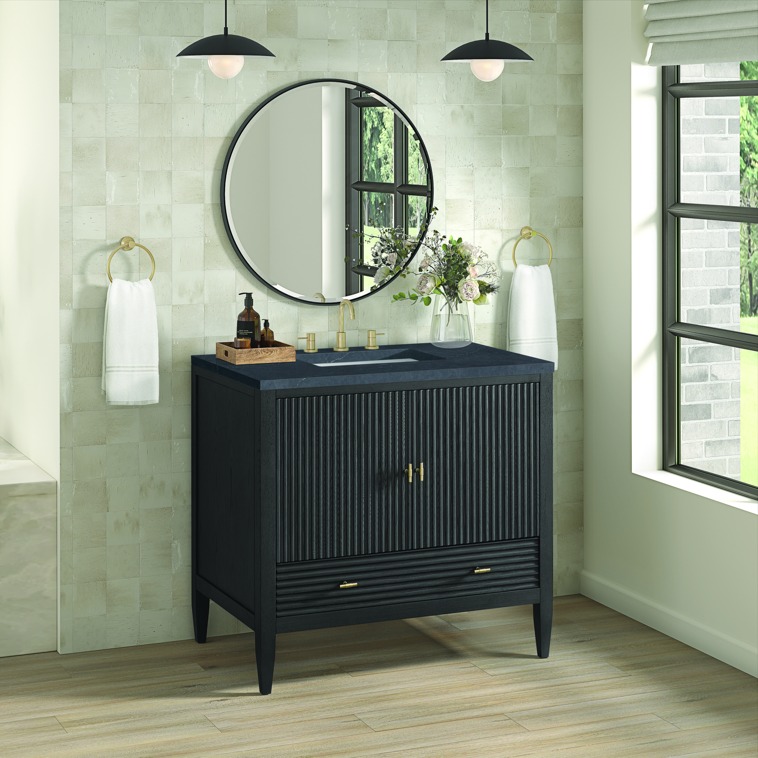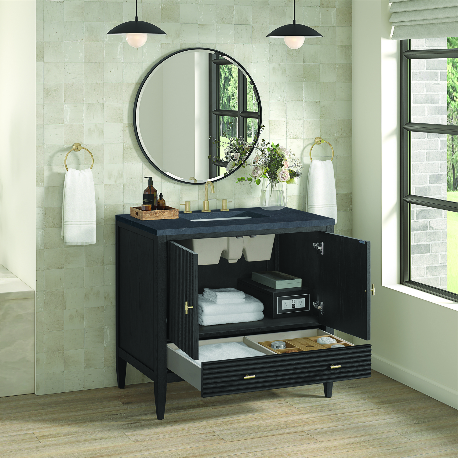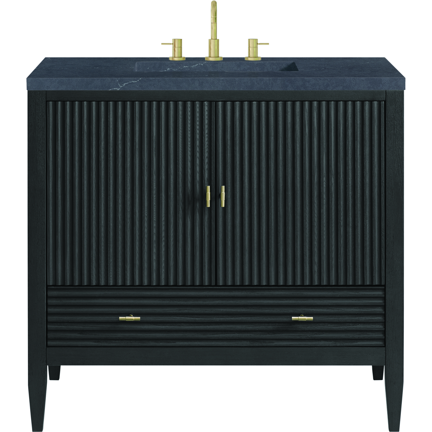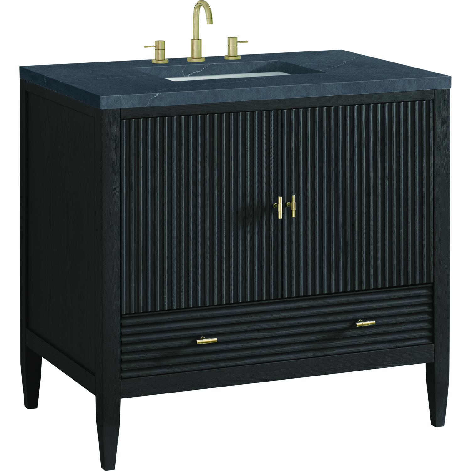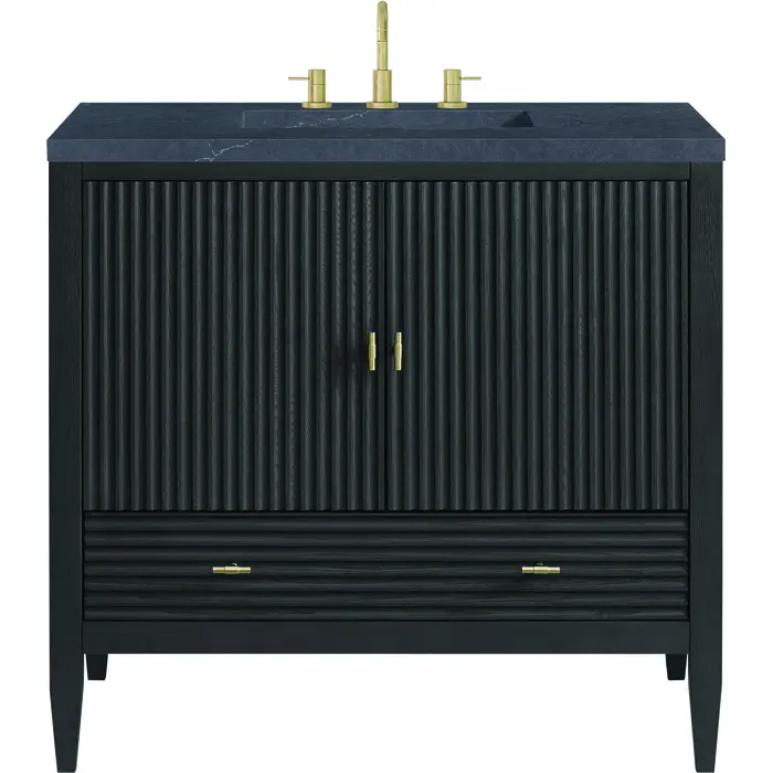 The 36" Myrrin Single Vanity features a minimalistic silhouette with fluted details, resulting in a blend of classical elegance and contemporary design. The deeply fluted panels run perpendicular on the doors and drawers, adding sophistication and visual interest to the design. Toggle-style knobs in Champagne Brass provide a luxe accent to the sophisticated Carbon Oak finish. The two-door cabinet opens to a spacious interior with a single shelf and a convenient USB/Electric power outlet. A single, lower-level drawer lends additional storage. Completing this piece is a distinguished top, characterized by depth and a sense of movement with a suede finish. The Charcoal Soapstone Silestone top is a timeless statement to complete the look of your vanity.Vanity set includes a 3cm eased edge Charcoal Soapstone Silestone top, a white porcelain rectangular sink and mounting brackets for easy installation. Top is pre-drilled for an 8" widespread faucet. Faucet not included.Constructed with a solid Ash wood frame and Ash veneers over plywood panels and sealed with our premium moisture and UV resistant coatingsOne 120-volt UL rated electric outlet with USB ports and bamboo organizer includedIncludes two soft-close doors concealing an open cabinet space. Also features one soft-close lower drawer with undermount glides and an installed divider.Toggle style door pulls in Champagne Brass finish.The drawer boxes feature English Dovetail joinery, and our signature brushed aluminum laminate drawer liners for easy cleaning.Includes one removable Bamboo drawer organizer.Cabinets are sealed with a premium finish for superior moisture and UV resistance.The deeply fluted panels of the Myrrin collection, framed in a sleek, minimalistic silhouette, bring an harmonious blend of classical elegance and contemporary design. The geometric play on the contrasting panels not only adds visual interest but also opens to reveal ample storage and organization. Offered in 4 sizes and 3 choices of finishes, each is complemented by Champagne Brass toggle-style knobs for a luxurious finishing touch.1 year warranty against manufacturer's defects. We will repair or replace any defective product, if the product is defective in material or workmanship at our discretion. No warranty is expressed or implied regarding damages resulting from consumer misuse.