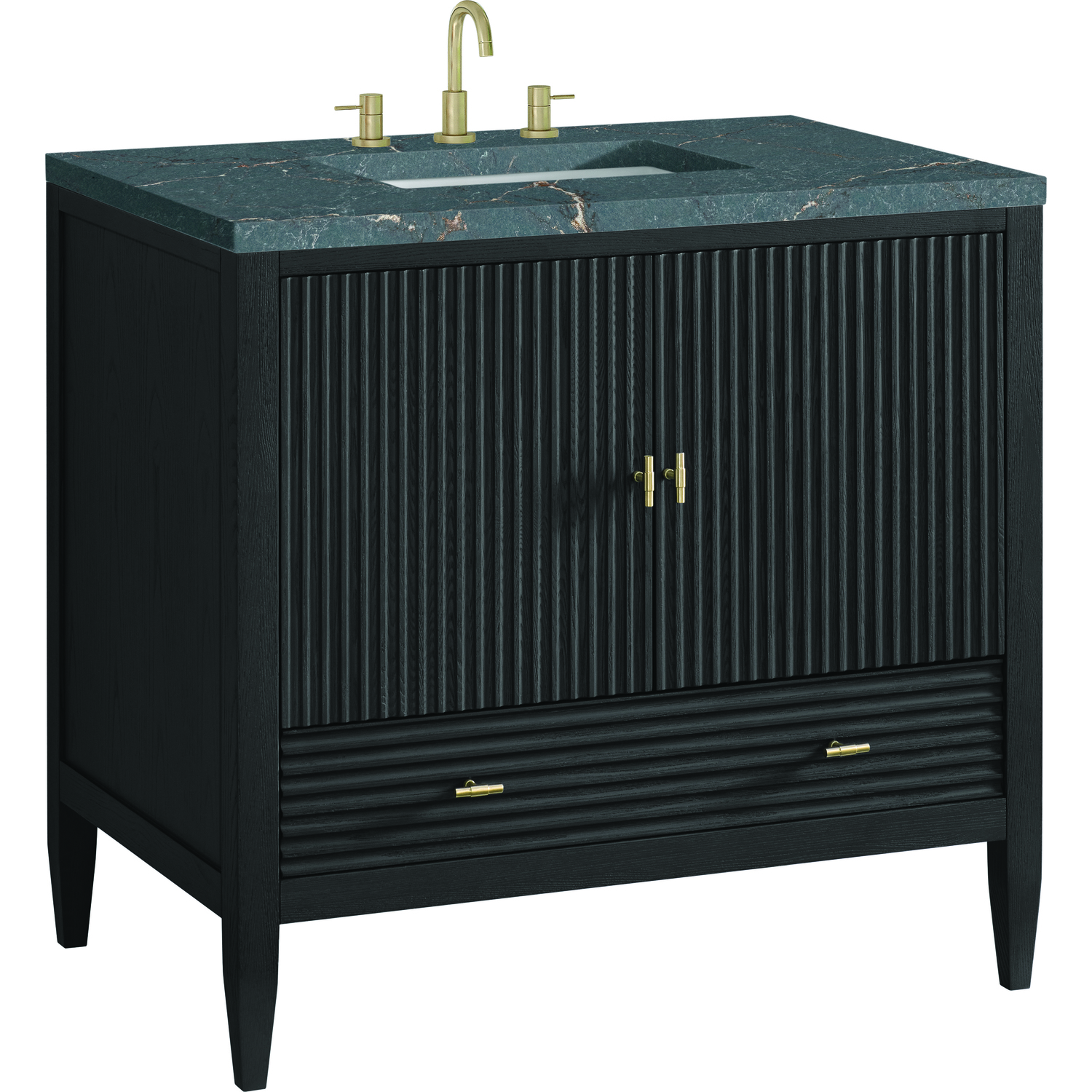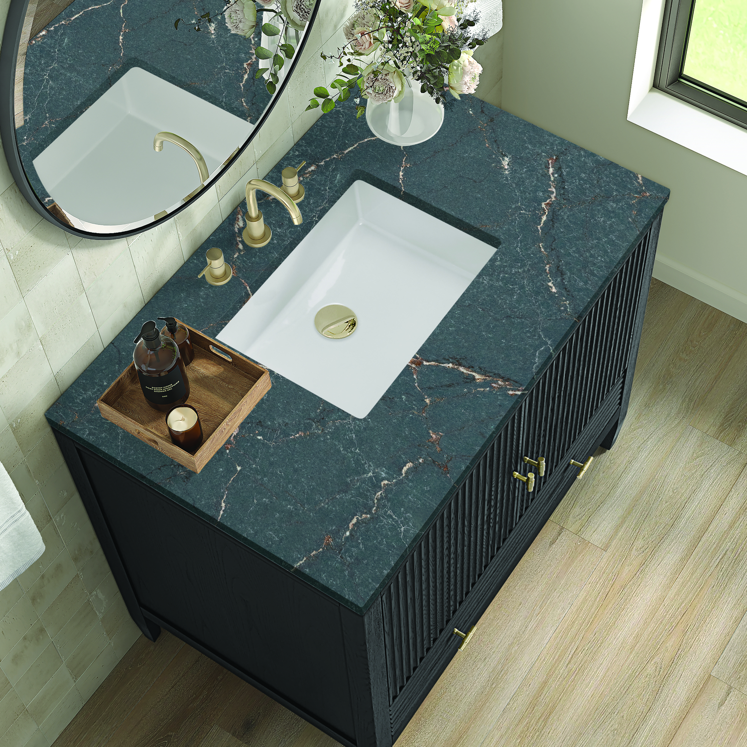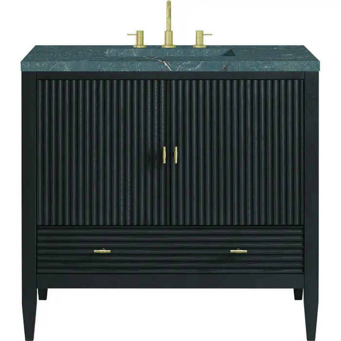 The 36" Myrrin Single Vanity features a minimalistic silhouette with fluted details, resulting in a blend of classical elegance and contemporary design. The deeply fluted panels run perpendicular on the doors and drawers, adding sophistication and visual interest to the design. Toggle-style knobs in Champagne Brass provide a luxe accent to the sophisticated Carbon Oak finish. The two-door cabinet opens to a spacious interior with a single shelf and a convenient USB/Electric power outlet. A single, lower-level drawer lends additional storage. The finish and hardware accents are enhanced by the Parisien Blue Silestone top, offering a deep bluish hue with broad and intricate neutral veins highlighted by fine coppery accents.Vanity set includes a 3cm eased edge Parisien Blue Silestone top, which includes one white porcelain rectangular undermount sink that ships separately, as well as mounting brackets for easy installation. The top is pre-drilled for an 8" widespread faucet.Constructed with a solid Ash wood frame and Ash veneers over plywood panels and sealed with our premium moisture and UV resistant coatingsOne 120-volt UL rated electric outlet with USB ports and bamboo organizer includedIncludes two soft-close doors concealing an open cabinet space. Also features one soft-close lower drawer with undermount glides and an installed divider.Toggle style door pulls in Champagne Brass finish.The drawer boxes feature English Dovetail joinery, and our signature brushed aluminum laminate drawer liners for easy cleaning.Includes one removable Bamboo drawer organizer.Cabinets are sealed with a premium finish for superior moisture and UV resistance.The deeply fluted panels of the Myrrin collection, framed in a sleek, minimalistic silhouette, bring an harmonious blend of classical elegance and contemporary design. The geometric play on the contrasting panels not only adds visual interest but also opens to reveal ample storage and organization. Offered in 4 sizes and 3 choices of finishes, each is complemented by Champagne Brass toggle-style knobs for a luxurious finishing touch.1 year warranty against manufacturer's defects. We will repair or replace any defective product, if the product is defective in material or workmanship at our discretion. No warranty is expressed or implied regarding damages resulting from consumer misuse.