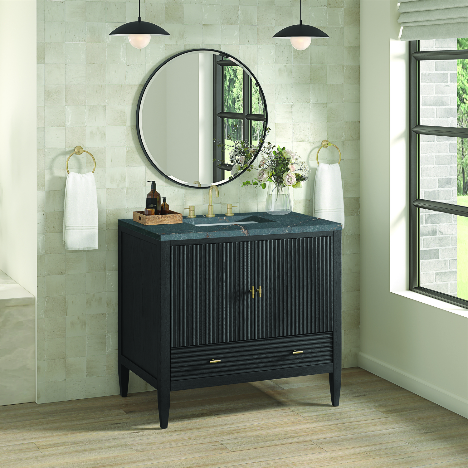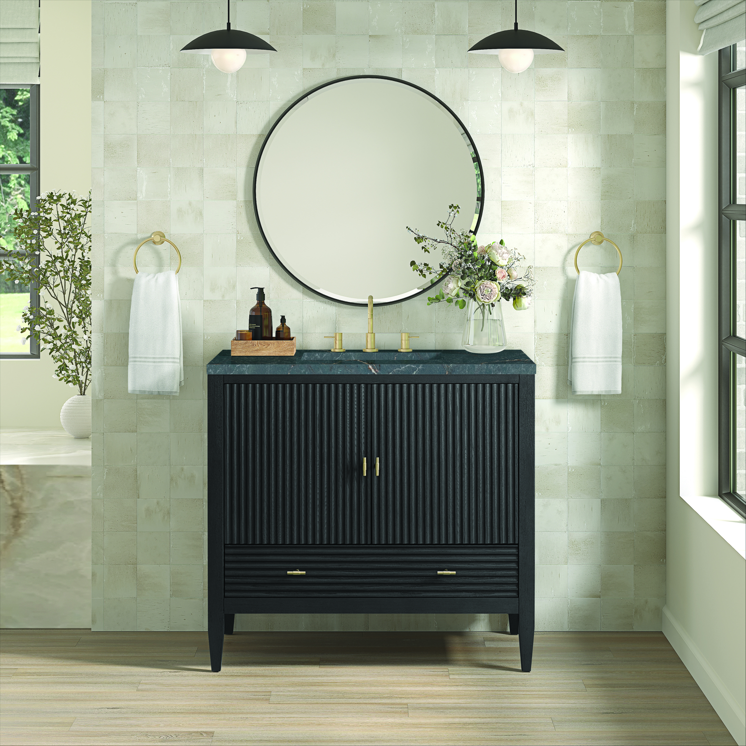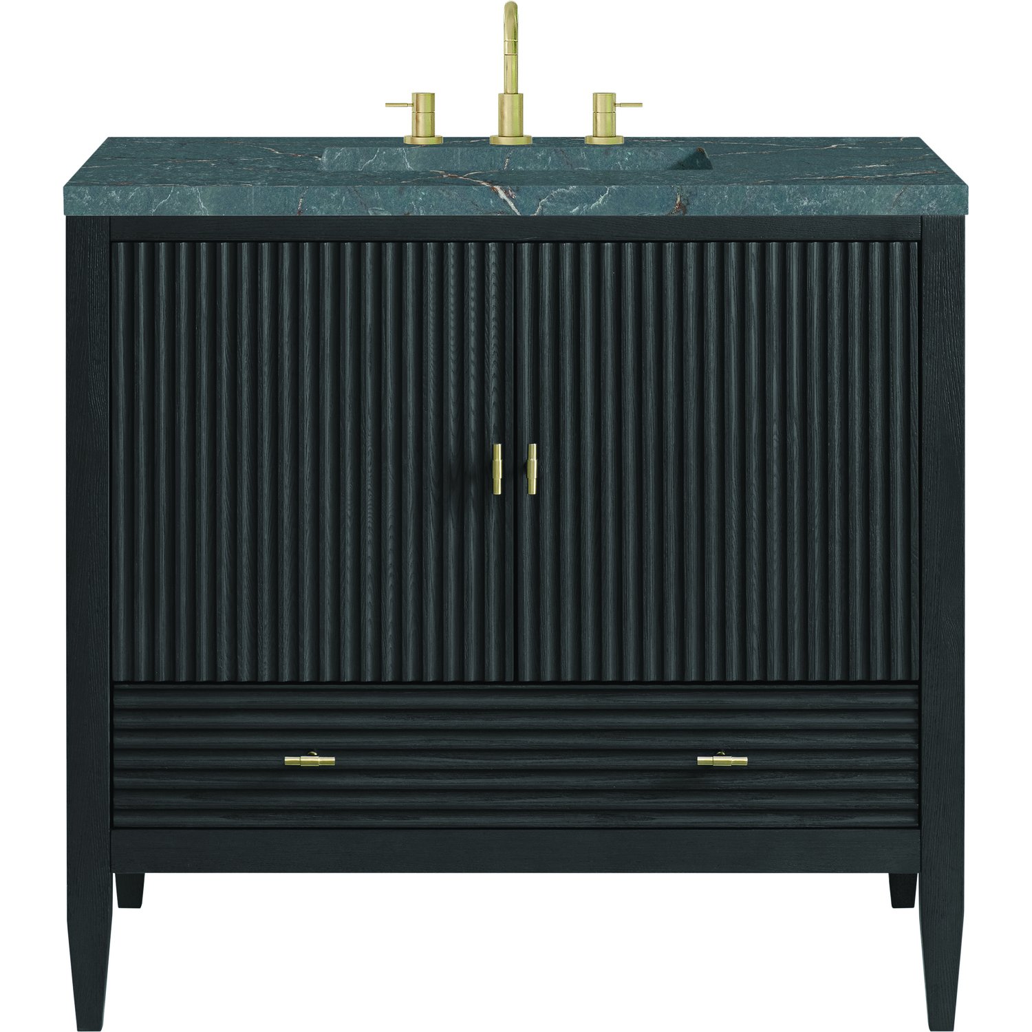 The 36" Myrrin Single Vanity features a minimalistic silhouette with fluted details, resulting in a blend of classical elegance and contemporary design. The deeply fluted panels run perpendicular on the doors and drawers, adding sophistication and visual interest to the design. Toggle-style knobs in Champagne Brass provide a luxe accent to the sophisticated Carbon Oak finish. The two-door cabinet opens to a spacious interior with a single shelf and a convenient USB/Electric power outlet. A single, lower-level drawer lends additional storage. The finish and hardware accents are enhanced by the Parisien Blue Silestone top, offering a deep bluish hue with broad and intricate neutral veins highlighted by fine coppery accents.Vanity set includes a 3cm eased edge Parisien Blue Silestone top, which includes one white porcelain rectangular undermount sink that ships separately, as well as mounting brackets for easy installation. The top is pre-drilled for an 8" widespread faucet.Constructed with a solid Ash wood frame and Ash veneers over plywood panels and sealed with our premium moisture and UV resistant coatingsOne 120-volt UL rated electric outlet with USB ports and bamboo organizer includedIncludes two soft-close doors concealing an open cabinet space. Also features one soft-close lower drawer with undermount glides and an installed divider.Toggle style door pulls in Champagne Brass finish.The drawer boxes feature English Dovetail joinery, and our signature brushed aluminum laminate drawer liners for easy cleaning.Includes one removable Bamboo drawer organizer.Cabinets are sealed with a premium finish for superior moisture and UV resistance.The deeply fluted panels of the Myrrin collection, framed in a sleek, minimalistic silhouette, bring an harmonious blend of classical elegance and contemporary design. The geometric play on the contrasting panels not only adds visual interest but also opens to reveal ample storage and organization. Offered in 4 sizes and 3 choices of finishes, each is complemented by Champagne Brass toggle-style knobs for a luxurious finishing touch.1 year warranty against manufacturer's defects. We will repair or replace any defective product, if the product is defective in material or workmanship at our discretion. No warranty is expressed or implied regarding damages resulting from consumer misuse.