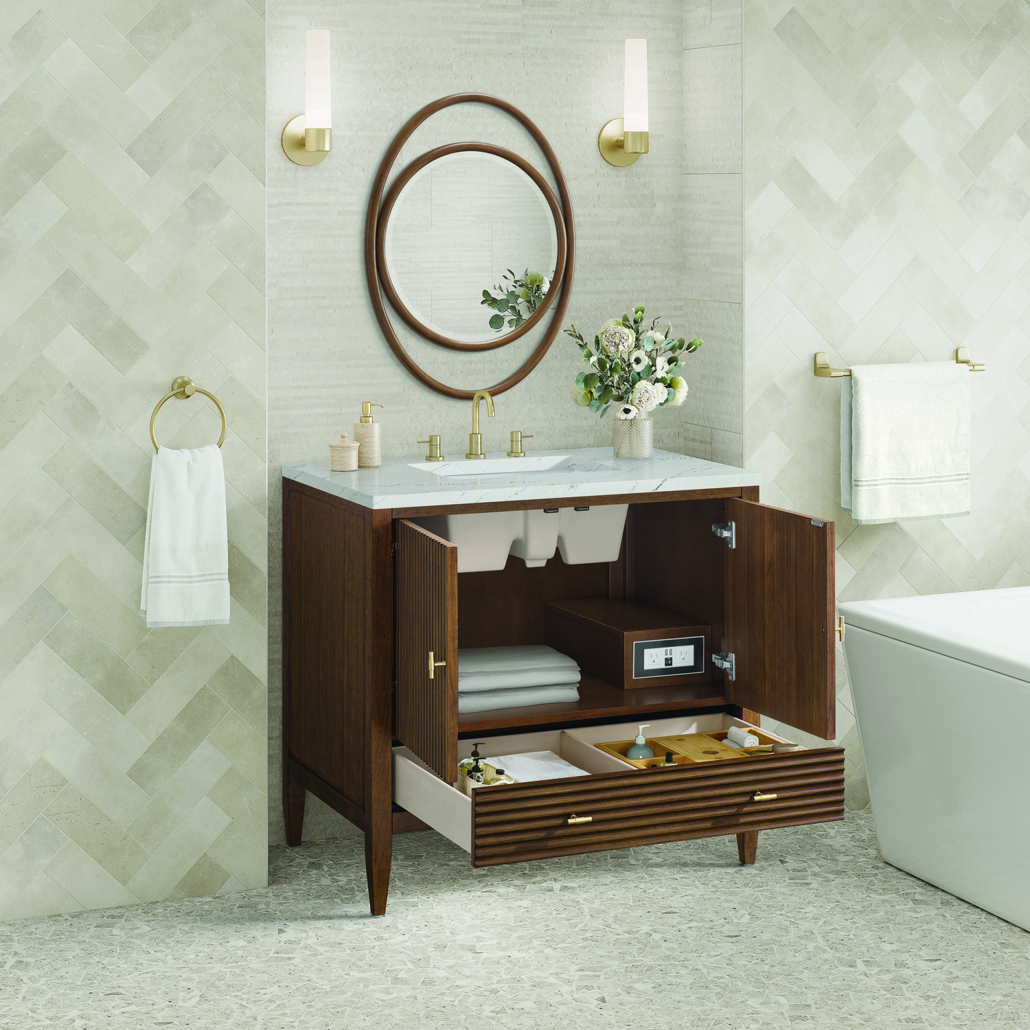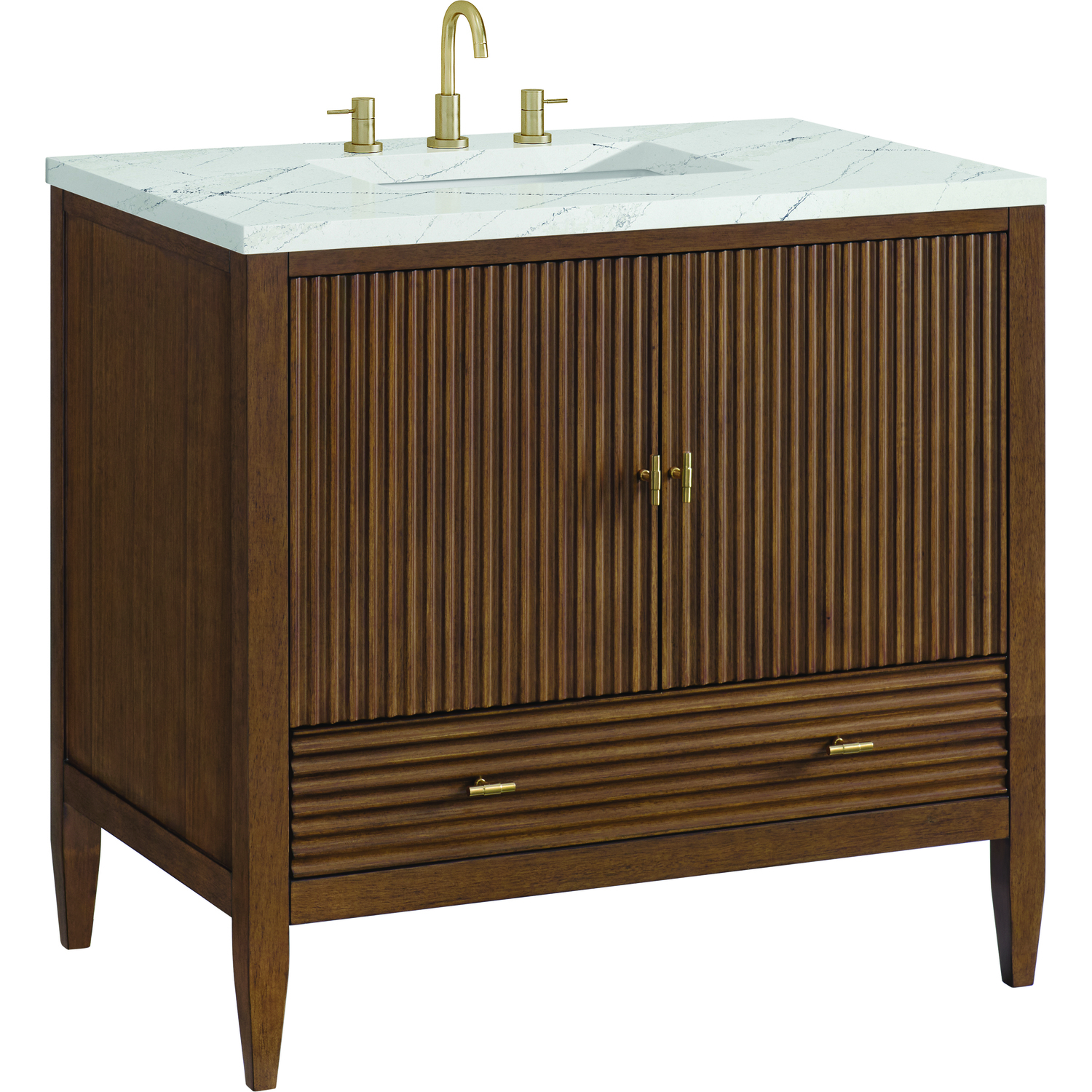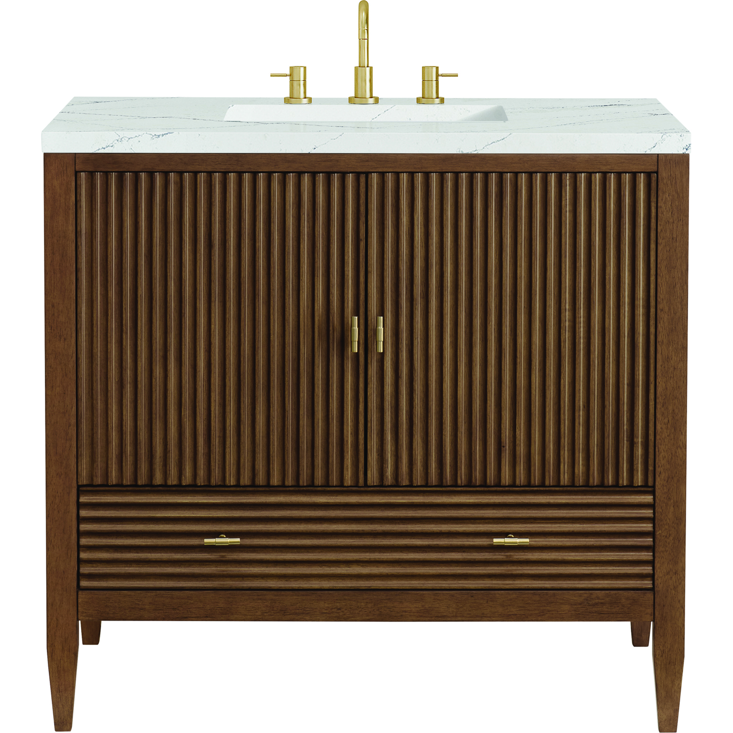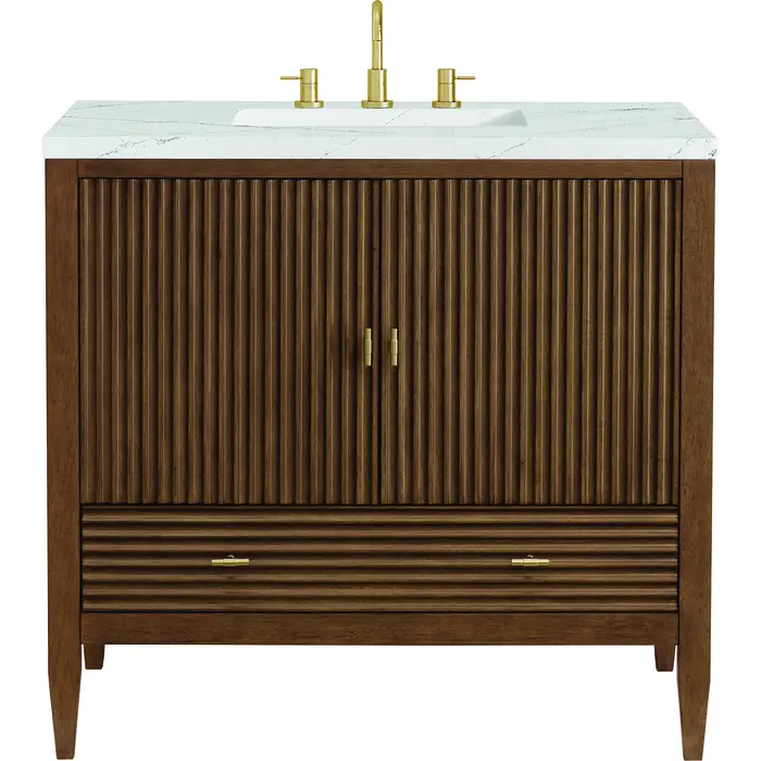 The 36" Myrrin Single Vanity features a minimalistic silhouette with fluted details, resulting in a blend of classical elegance and contemporary design. The deeply fluted panels run perpendicular on the doors and drawers, adding sophistication and visual interest to the design. Toggle-style knobs in Champagne Brass provide a luxe accent to the rich Mid-Century Walnut finish. The two-door cabinet opens to a spacious interior with a single shelf and a convenient USB/Electric power outlet. A single, lower-level drawer lends additional storage. The addition of an Ethereal Noctis Silestone top by Cosentino with undermount rectangular sink completes this timeless bathroom centerpiece with its modern, intricate black and gray nuances which add contrast and elegance to the white background.Vanity set includes a 3cm eased edge Ethereal Noctis Silestone top, a white porcelain rectangular sink and mounting brackets for easy installation. Top is pre-drilled for an 8" widespread faucet. Faucet not included.Constructed with a solid wood frame with Walnut veneers over plywood and sealed with our premium moisture and UV resistant finishesOne 120-volt UL rated electric outlet with USB ports and bamboo organizer includedIncludes two soft-close doors concealing an open cabinet space. Also features one soft-close lower drawer with undermount glides and an installed divider.Toggle style door pulls in Champagne Brass finish.The drawer boxes feature English Dovetail joinery, and our signature brushed aluminum laminate drawer liners for easy cleaning.Includes one removable Bamboo drawer organizer.Cabinets are sealed with a premium finish for superior moisture and UV resistance.The deeply fluted panels of the Myrrin collection, framed in a sleek, minimalistic silhouette, bring an harmonious blend of classical elegance and contemporary design. The geometric play on the contrasting panels not only adds visual interest but also opens to reveal ample storage and organization. Offered in 4 sizes and 3 choices of finishes, each is complemented by Champagne Brass toggle-style knobs for a luxurious finishing touch.1 year warranty against manufacturer's defects. We will repair or replace any defective product, if the product is defective in material or workmanship at our discretion. No warranty is expressed or implied regarding damages resulting from consumer misuse.