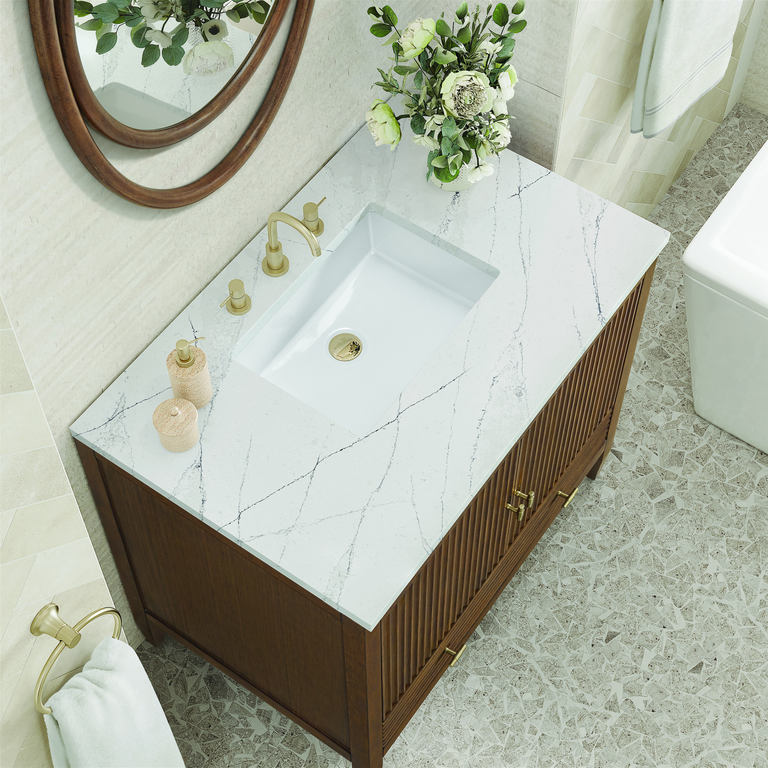 James Martin Myrrin 36 inch Vanity, Mid Century Walnut w/ 3 CM Ethereal Noctis Quartz Top, 840108973598, 485-V36-WLT-3ENC