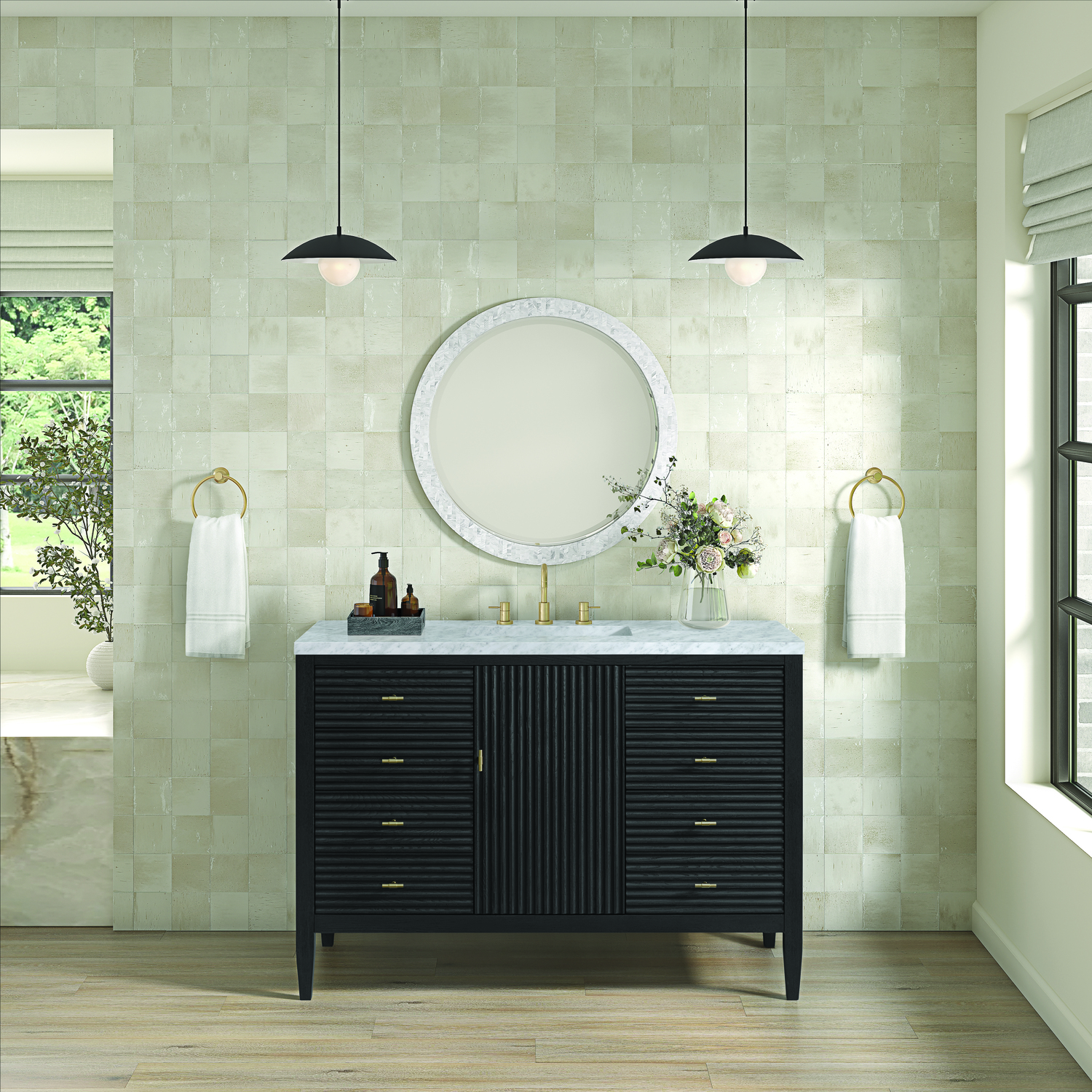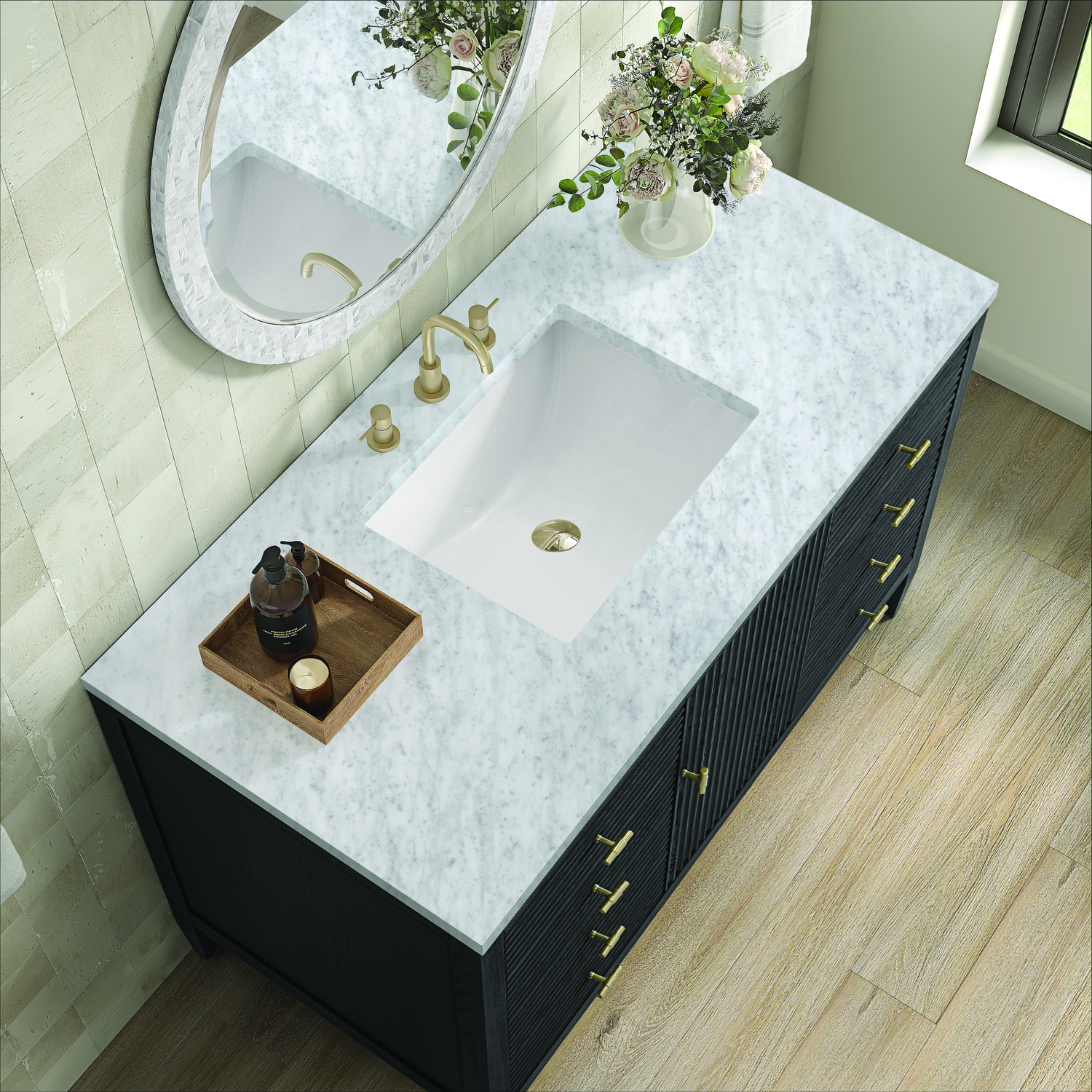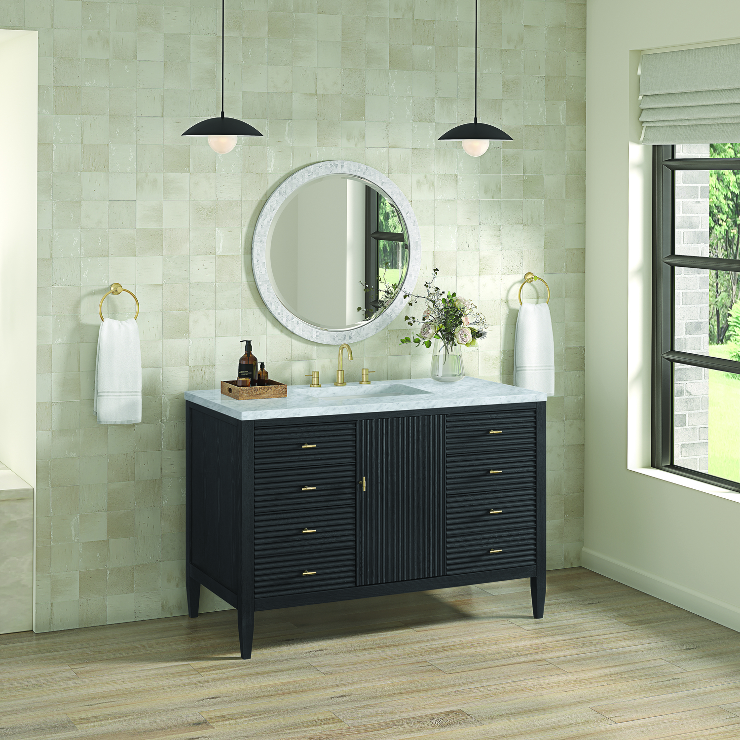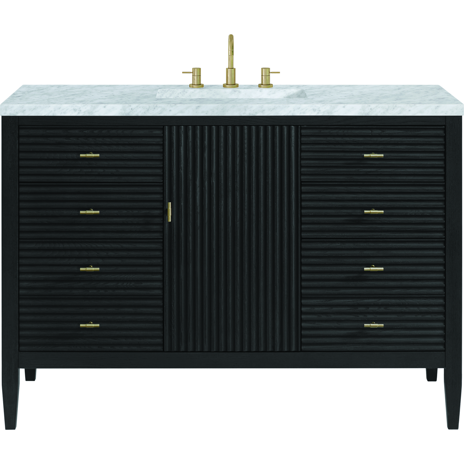 The 48" Myrrin Single Vanity features a minimalistic silhouette with fluted details, resulting in a blend of classical elegance and contemporary design. The deeply fluted panels run perpendicular on the doors and drawers, adding sophistication and visual interest to the design. Toggle-style knobs in Champagne Brass provide a luxe accent to the sophisticated Carbon Oak finish. The single-door cabinet opens to a spacious interior with a single shelf and a convenient USB/Electric power outlet. Six drawers lend additional storage. Completing this vanity, are the treasured, neutral tones and textures of the Carrara marble vanity top display an white background with delicate grey veining.Vanity set includes a 3cm eased edge Carrara Marble top. Includes white porcelain rectangular undermount sink that ships separately and mounting brackets for easy installation. Top is pre-drilled for 8" widespread faucet. Faucet not included.Constructed with a solid Ash wood frame and Ash veneers over plywood panels and sealed with our premium moisture and UV resistant coatingsOne 120-volt UL rated electric outlet with USB ports and bamboo organizer includedIncludes one soft-close door that opens to an interior shelf and three full-extension drawers that feature soft-close undermount glides.Toggle style door pulls in Champagne Brass finishThe drawer boxes feature English Dovetail joinery, and our signature brushed aluminum laminate drawer liners for easy cleaning.Includes one removable Bamboo drawer organizer.Cabinets are sealed with a premium finish for superior moisture and UV resistance.The deeply fluted panels of the Myrrin collection, framed in a sleek, minimalistic silhouette, bring an harmonious blend of classical elegance and contemporary design. The geometric play on the contrasting panels not only adds visual interest but also opens to reveal ample storage and organization. Offered in 4 sizes and 3 choices of finishes, each is complemented by Champagne Brass toggle-style knobs for a luxurious finishing touch.1 year warranty against manufacturer's defects. We will repair or replace any defective product, if the product is defective in material or workmanship at our discretion. No warranty is expressed or implied regarding damages resulting from consumer misuse.