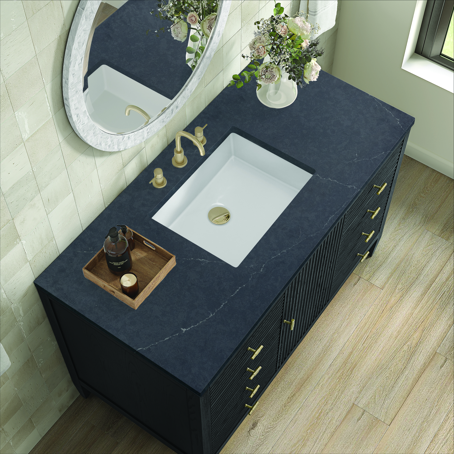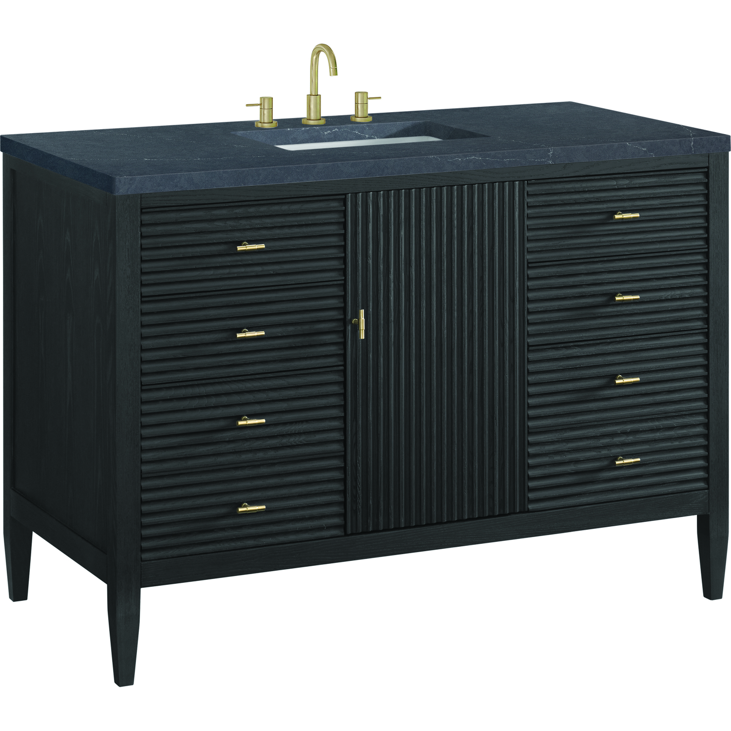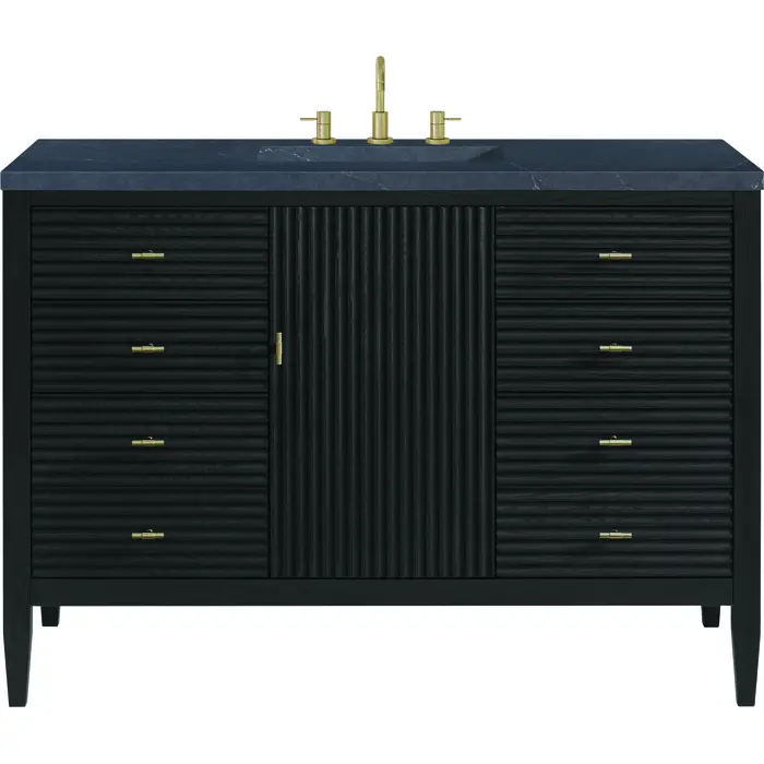 The 48" Myrrin Single Vanity features a minimalistic silhouette with fluted details, resulting in a blend of classical elegance and contemporary design. The deeply fluted panels run perpendicular on the doors and drawers, adding sophistication and visual interest to the design. Toggle-style knobs in Champagne Brass provide a luxe accent to the sophisticated Carbon Oak finish. The single-door cabinet opens to a spacious interior with a single shelf and a convenient USB/Electric power outlet. Six drawers lend additional storage. Completing this piece is a distinguished top, characterized by depth and a sense of movement with a suede finish. The Charcoal Soapstone Silestone top is a timeless statement to complete the look of your vanity.Vanity set includes a 3cm eased edge Charcoal Soapstone Silestone top, a white porcelain rectangular sink and mounting brackets for easy installation. Top is pre-drilled for an 8" widespread faucet. Faucet not included.Constructed with a solid Ash wood frame and Ash veneers over plywood panels and sealed with our premium moisture and UV resistant coatingsOne 120-volt UL rated electric outlet with USB ports and bamboo organizer includedIncludes one soft-close door that opens to an interior shelf and three full-extension drawers that feature soft-close undermount glides.Toggle style door pulls in Champagne Brass finishThe drawer boxes feature English Dovetail joinery, and our signature brushed aluminum laminate drawer liners for easy cleaning.Includes one removable Bamboo drawer organizer.Cabinets are sealed with a premium finish for superior moisture and UV resistance.The deeply fluted panels of the Myrrin collection, framed in a sleek, minimalistic silhouette, bring an harmonious blend of classical elegance and contemporary design. The geometric play on the contrasting panels not only adds visual interest but also opens to reveal ample storage and organization. Offered in 4 sizes and 3 choices of finishes, each is complemented by Champagne Brass toggle-style knobs for a luxurious finishing touch.1 year warranty against manufacturer's defects. We will repair or replace any defective product, if the product is defective in material or workmanship at our discretion. No warranty is expressed or implied regarding damages resulting from consumer misuse.