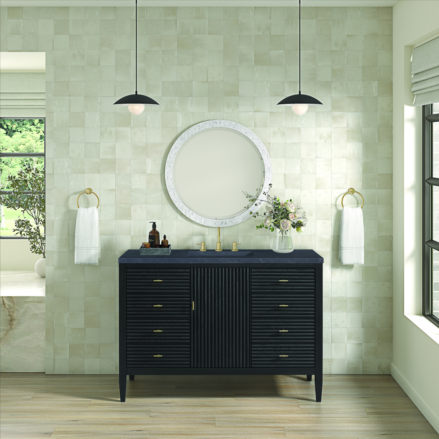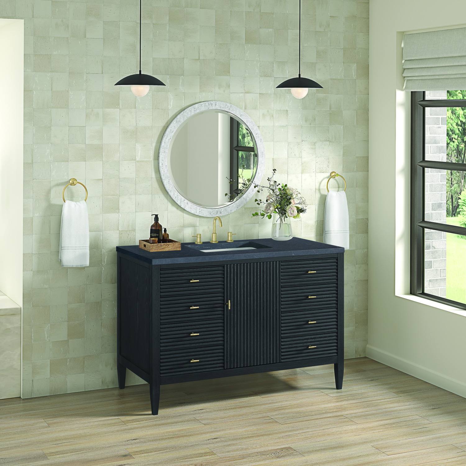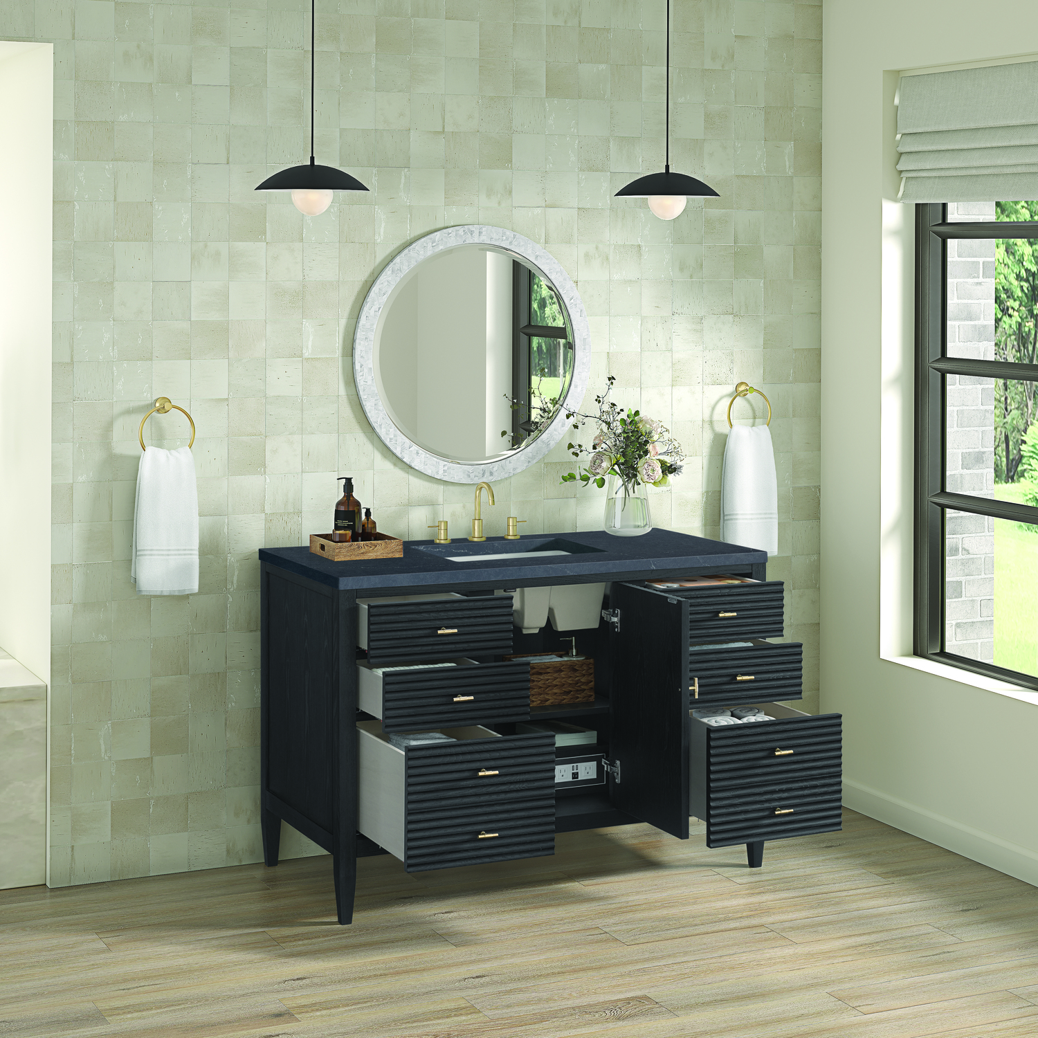The 48" Myrrin Single Vanity features a minimalistic silhouette with fluted details, resulting in a blend of classical elegance and contemporary design. The deeply fluted panels run perpendicular on the doors and drawers, adding sophistication and visual interest to the design. Toggle-style knobs in Champagne Brass provide a luxe accent to the sophisticated Carbon Oak finish. The single-door cabinet opens to a spacious interior with a single shelf and a convenient USB/Electric power outlet. Six drawers lend additional storage. Completing this piece is a distinguished top, characterized by depth and a sense of movement with a suede finish. The Charcoal Soapstone Silestone top is a timeless statement to complete the look of your vanity.Vanity set includes a 3cm eased edge Charcoal Soapstone Silestone top, a white porcelain rectangular sink and mounting brackets for easy installation. Top is pre-drilled for an 8" widespread faucet. Faucet not included.Constructed with a solid Ash wood frame and Ash veneers over plywood panels and sealed with our premium moisture and UV resistant coatingsOne 120-volt UL rated electric outlet with USB ports and bamboo organizer includedIncludes one soft-close door that opens to an interior shelf and three full-extension drawers that feature soft-close undermount glides.Toggle style door pulls in Champagne Brass finishThe drawer boxes feature English Dovetail joinery, and our signature brushed aluminum laminate drawer liners for easy cleaning.Includes one removable Bamboo drawer organizer.Cabinets are sealed with a premium finish for superior moisture and UV resistance.The deeply fluted panels of the Myrrin collection, framed in a sleek, minimalistic silhouette, bring an harmonious blend of classical elegance and contemporary design. The geometric play on the contrasting panels not only adds visual interest but also opens to reveal ample storage and organization. Offered in 4 sizes and 3 choices of finishes, each is complemented by Champagne Brass toggle-style knobs for a luxurious finishing touch.1 year warranty against manufacturer's defects. We will repair or replace any defective product, if the product is defective in material or workmanship at our discretion. No warranty is expressed or implied regarding damages resulting from consumer misuse.