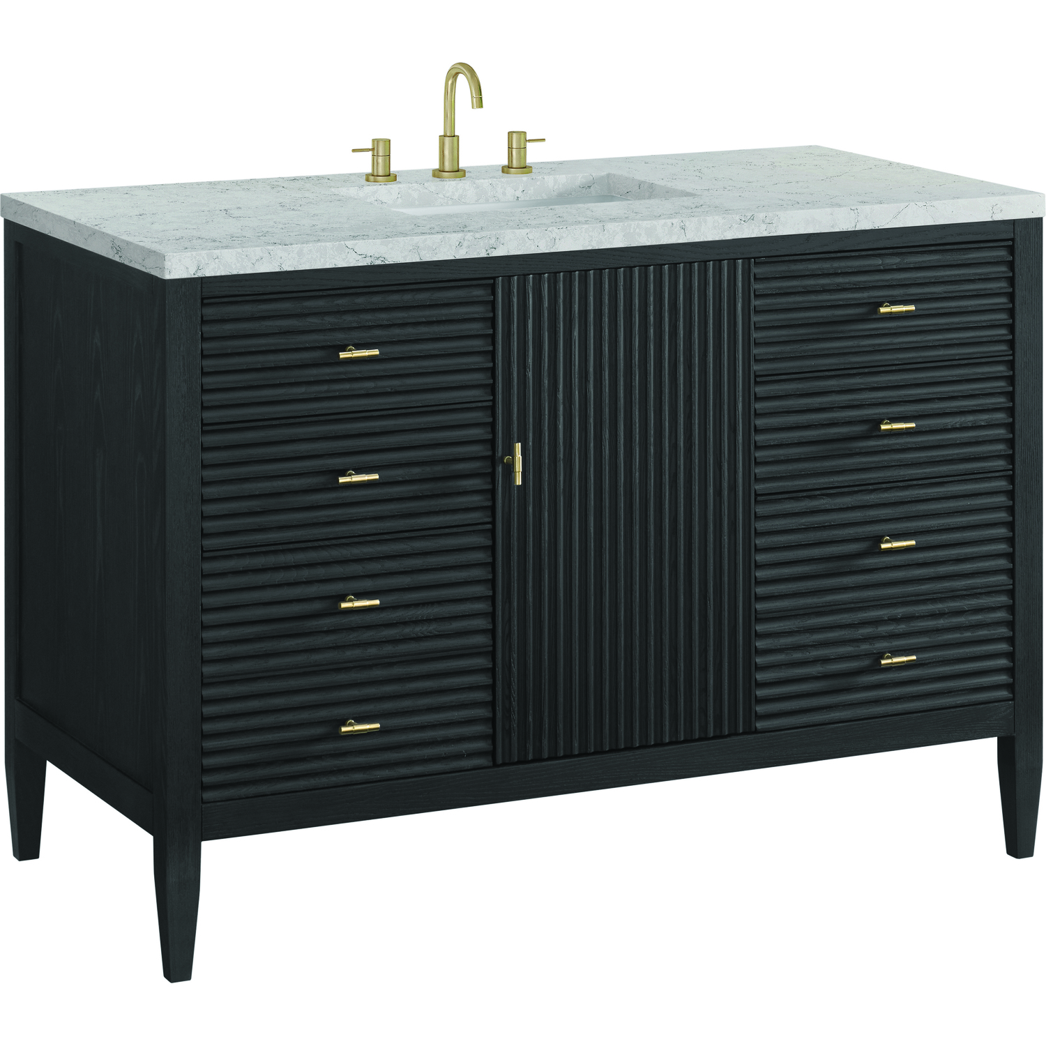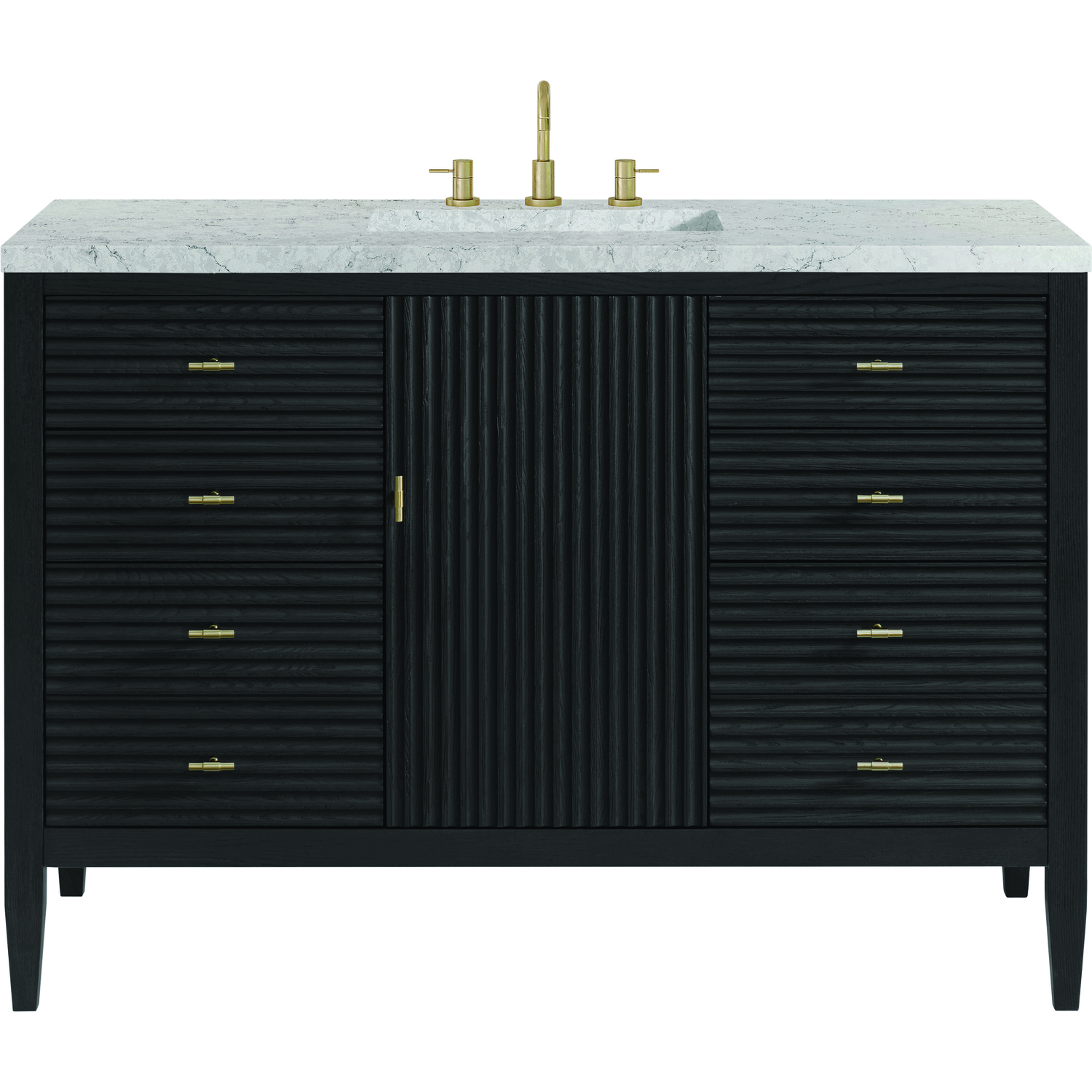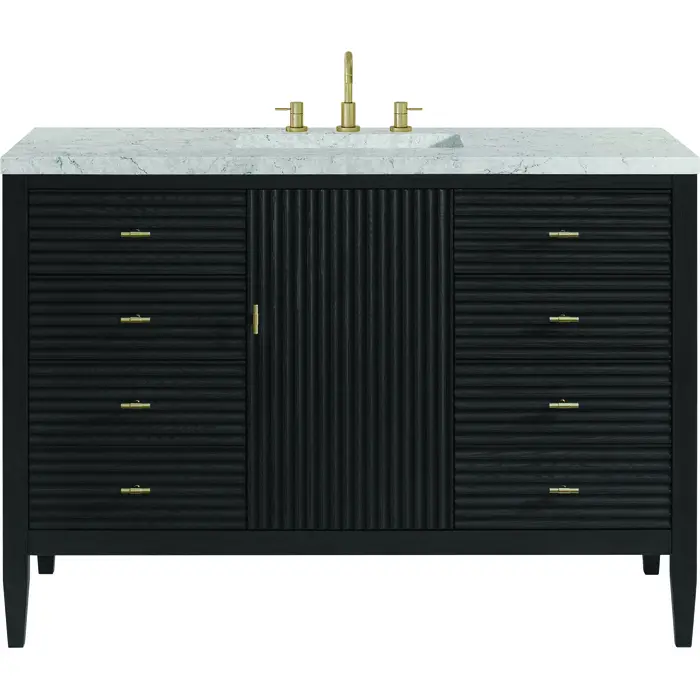 The 48" Myrrin Single Vanity features a minimalistic silhouette with fluted details, resulting in a blend of classical elegance and contemporary design. The deeply fluted panels run perpendicular on the doors and drawers, adding sophistication and visual interest to the design. Toggle-style knobs in Champagne Brass provide a luxe accent to the sophisticated Carbon Oak finish. The single-door cabinet opens to a spacious interior with a single shelf and a convenient USB/Electric power outlet. Six drawers lend additional storage. Completing the look is the Eternal Jasmine Pearl Silestone top by Cosentino, featuring an elegant white background with subtle marbleized swirls and dark blue-gray veining patterns.Vanity set includes a 3cm eased edge Eternal Jasmine Pearl Silestone top. Includes a white porcelain rectangular undermount sink that ships separately and mounting brackets for easy installation. Top is pre-drilled for 8" widespread faucet. Faucet not incConstructed with a solid Ash wood frame and Ash veneers over plywood panels and sealed with our premium moisture and UV resistant coatingsOne 120-volt UL rated electric outlet with USB ports and bamboo organizer includedIncludes one soft-close door that opens to an interior shelf and three full-extension drawers that feature soft-close undermount glides.Toggle style door pulls in Champagne Brass finishThe drawer boxes feature English Dovetail joinery, and our signature brushed aluminum laminate drawer liners for easy cleaning.Includes one removable Bamboo drawer organizer.Cabinets are sealed with a premium finish for superior moisture and UV resistance.The deeply fluted panels of the Myrrin collection, framed in a sleek, minimalistic silhouette, bring an harmonious blend of classical elegance and contemporary design. The geometric play on the contrasting panels not only adds visual interest but also opens to reveal ample storage and organization. Offered in 4 sizes and 3 choices of finishes, each is complemented by Champagne Brass toggle-style knobs for a luxurious finishing touch.1 year warranty against manufacturer's defects. We will repair or replace any defective product, if the product is defective in material or workmanship at our discretion. No warranty is expressed or implied regarding damages resulting from consumer misuse.