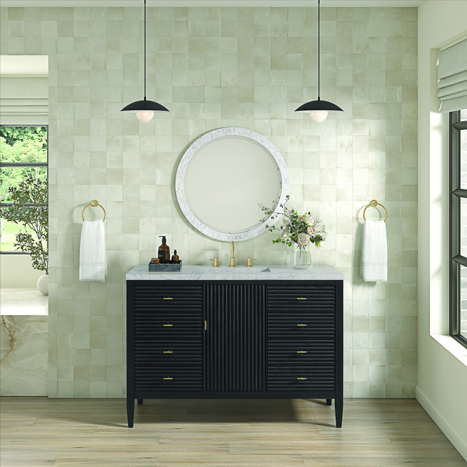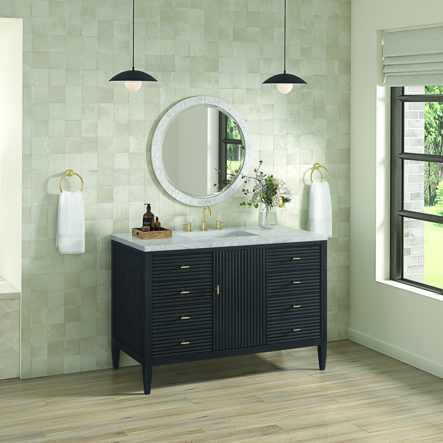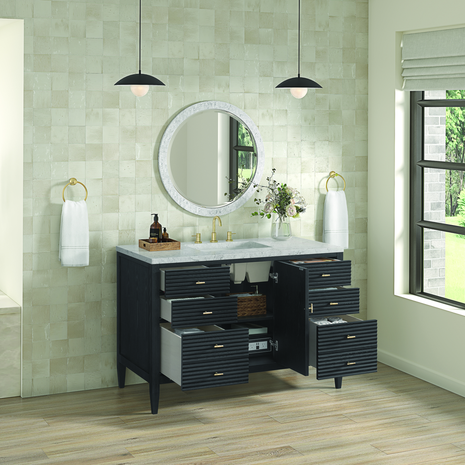 The 48" Myrrin Single Vanity features a minimalistic silhouette with fluted details, resulting in a blend of classical elegance and contemporary design. The deeply fluted panels run perpendicular on the doors and drawers, adding sophistication and visual interest to the design. Toggle-style knobs in Champagne Brass provide a luxe accent to the sophisticated Carbon Oak finish. The single-door cabinet opens to a spacious interior with a single shelf and a convenient USB/Electric power outlet. Six drawers lend additional storage. Completing the look is the Eternal Jasmine Pearl Silestone top by Cosentino, featuring an elegant white background with subtle marbleized swirls and dark blue-gray veining patterns.Vanity set includes a 3cm eased edge Eternal Jasmine Pearl Silestone top. Includes a white porcelain rectangular undermount sink that ships separately and mounting brackets for easy installation. Top is pre-drilled for 8" widespread faucet. Faucet not incConstructed with a solid Ash wood frame and Ash veneers over plywood panels and sealed with our premium moisture and UV resistant coatingsOne 120-volt UL rated electric outlet with USB ports and bamboo organizer includedIncludes one soft-close door that opens to an interior shelf and three full-extension drawers that feature soft-close undermount glides.Toggle style door pulls in Champagne Brass finishThe drawer boxes feature English Dovetail joinery, and our signature brushed aluminum laminate drawer liners for easy cleaning.Includes one removable Bamboo drawer organizer.Cabinets are sealed with a premium finish for superior moisture and UV resistance.The deeply fluted panels of the Myrrin collection, framed in a sleek, minimalistic silhouette, bring an harmonious blend of classical elegance and contemporary design. The geometric play on the contrasting panels not only adds visual interest but also opens to reveal ample storage and organization. Offered in 4 sizes and 3 choices of finishes, each is complemented by Champagne Brass toggle-style knobs for a luxurious finishing touch.1 year warranty against manufacturer's defects. We will repair or replace any defective product, if the product is defective in material or workmanship at our discretion. No warranty is expressed or implied regarding damages resulting from consumer misuse.