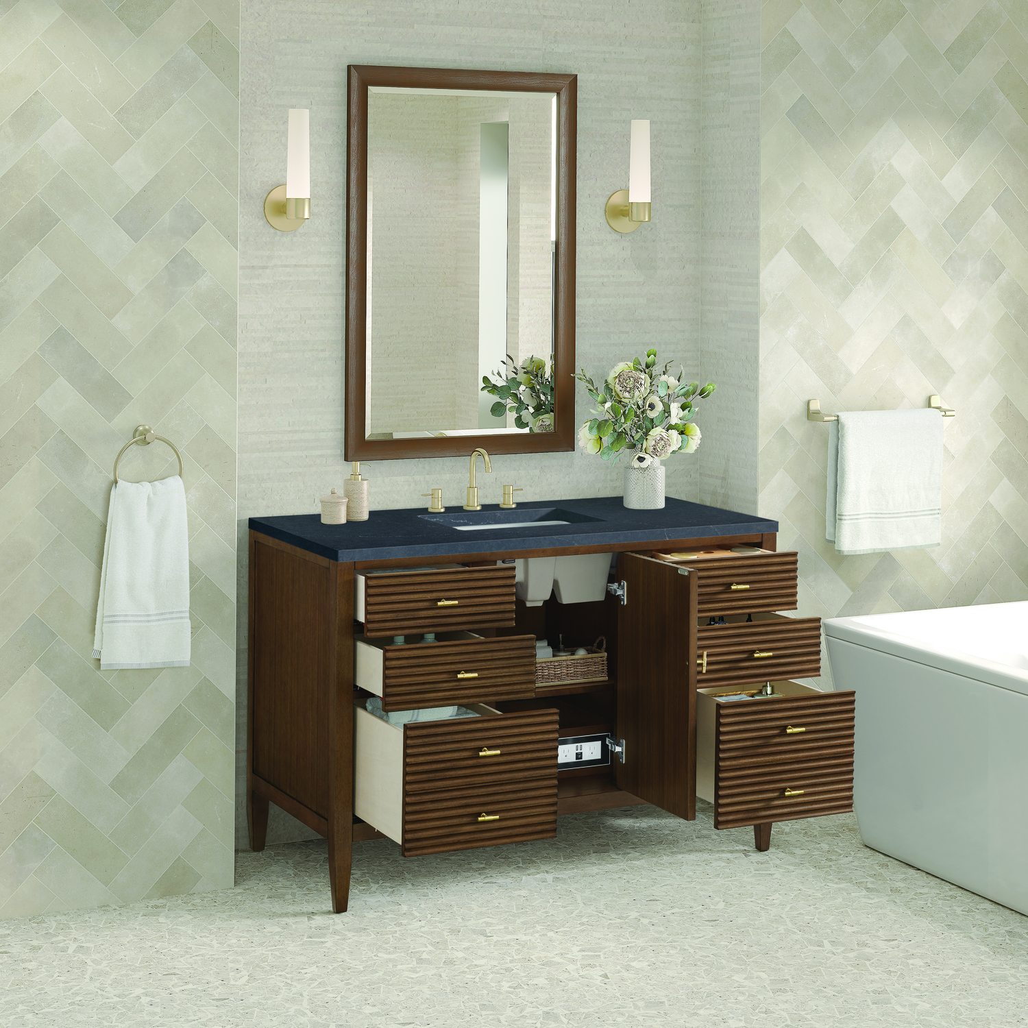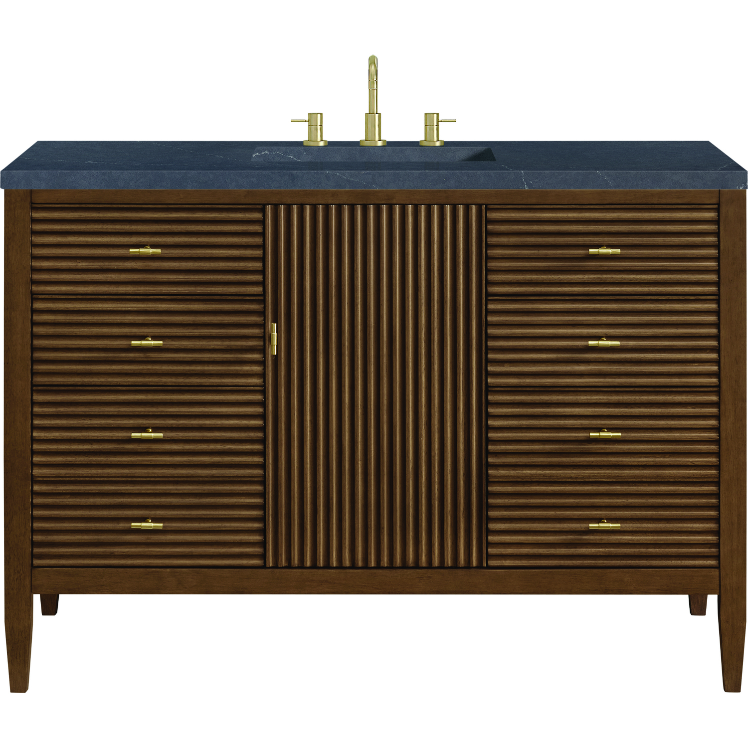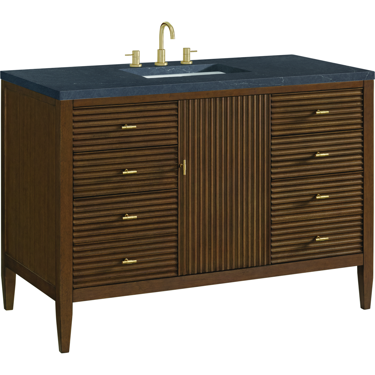 The 48" Myrrin Single Vanity features a minimalistic silhouette with fluted details, resulting in a blend of classical elegance and contemporary design. The deeply fluted panels run perpendicular on the doors and drawers, adding sophistication and visual interest to the design. Toggle-style knobs in Champagne Brass provide a luxe accent to the rich Mid-Century Walnut finish. The single-door cabinet opens to a spacious interior with a single shelf and a convenient USB/Electric power outlet. Six drawers lend additional storage. Completing this piece is a distinguished top, characterized by depth and a sense of movement with a suede finish. The Charcoal Soapstone Silestone top by Cosentino has the new n-boost technology, which helps prevent the adhesion of liquids, enhances shine, and intensifies the color of this top.Vanity set includes a 3cm eased edge Charcoal Soapstone Silestone top, a white porcelain rectangular sink and mounting brackets for easy installation. Top is pre-drilled for an 8" widespread faucet. Faucet not included.Constructed with a solid wood frame with Walnut veneers over plywood and sealed with our premium moisture and UV resistant finishesOne 120-volt UL rated electric outlet with USB ports and bamboo organizer includedIncludes one soft-close door that opens to an interior shelf and three full-extension drawers that feature soft-close undermount glides.Toggle style door pulls in Champagne Brass finishThe drawer boxes feature English Dovetail joinery, and our signature brushed aluminum laminate drawer liners for easy cleaning.Includes one removable Bamboo drawer organizer.Cabinets are sealed with a premium finish for superior moisture and UV resistance.The deeply fluted panels of the Myrrin collection, framed in a sleek, minimalistic silhouette, bring an harmonious blend of classical elegance and contemporary design. The geometric play on the contrasting panels not only adds visual interest but also opens to reveal ample storage and organization. Offered in 4 sizes and 3 choices of finishes, each is complemented by Champagne Brass toggle-style knobs for a luxurious finishing touch.1 year warranty against manufacturer's defects. We will repair or replace any defective product, if the product is defective in material or workmanship at our discretion. No warranty is expressed or implied regarding damages resulting from consumer misuse.