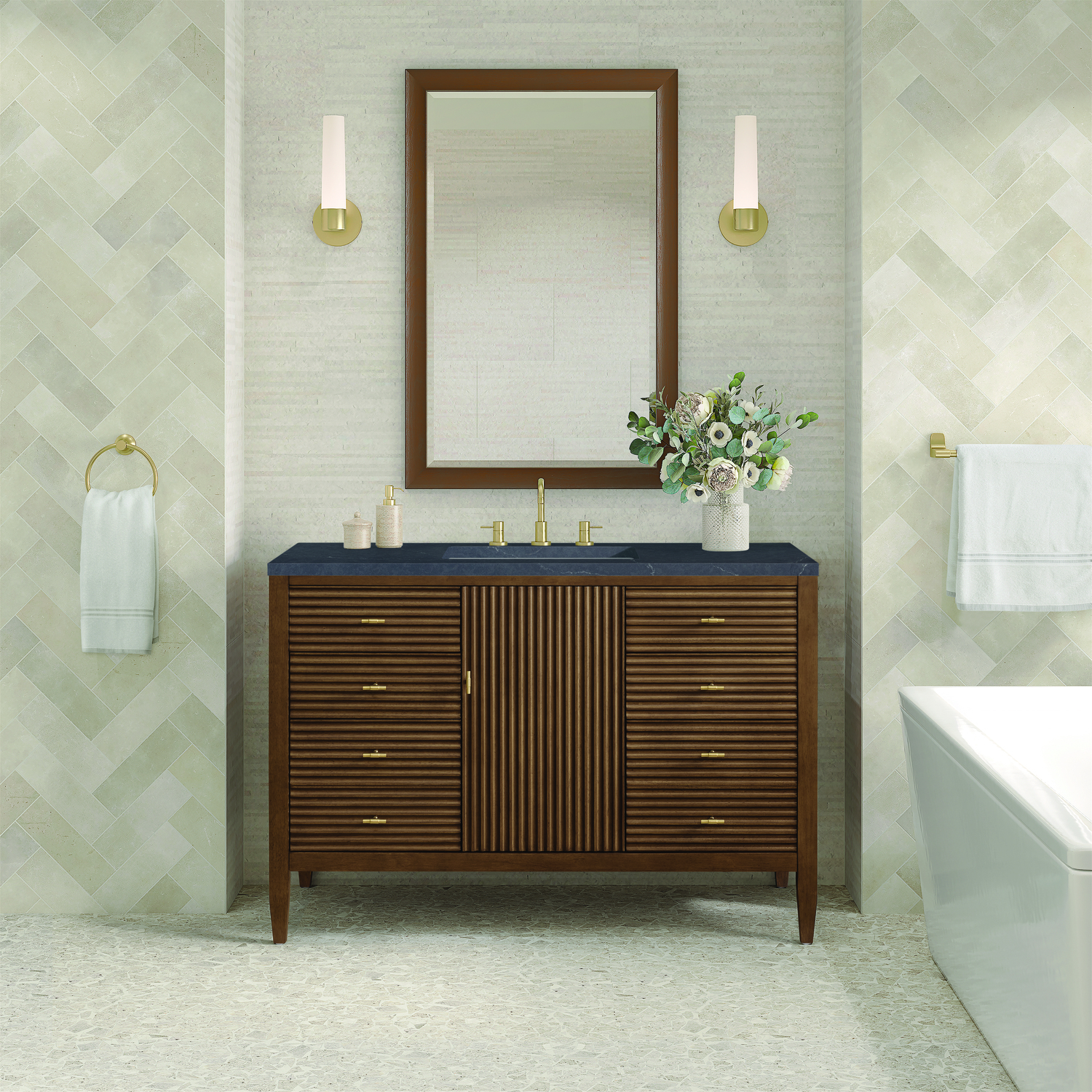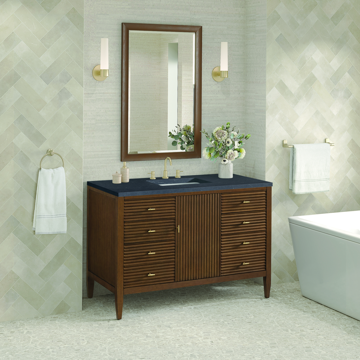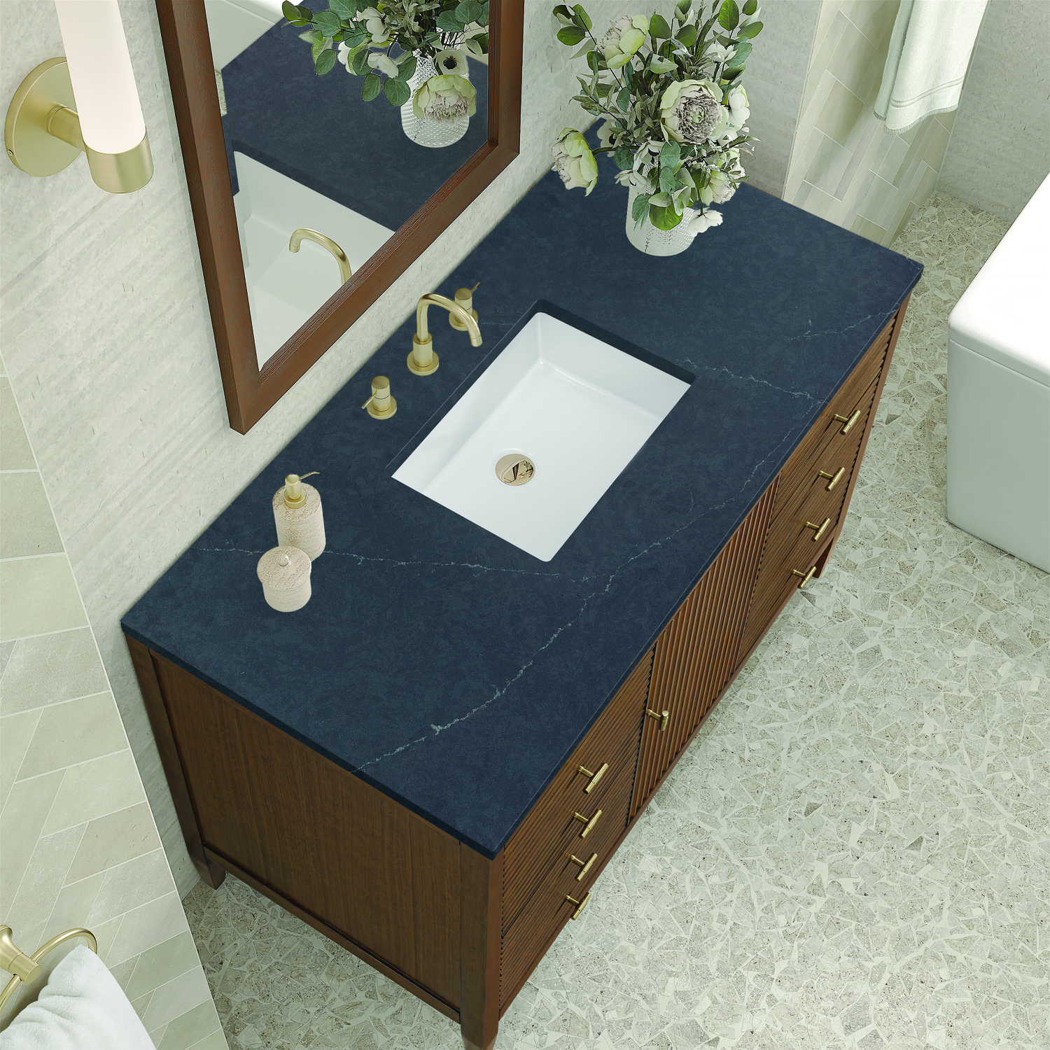The 48" Myrrin Single Vanity features a minimalistic silhouette with fluted details, resulting in a blend of classical elegance and contemporary design. The deeply fluted panels run perpendicular on the doors and drawers, adding sophistication and visual interest to the design. Toggle-style knobs in Champagne Brass provide a luxe accent to the rich Mid-Century Walnut finish. The single-door cabinet opens to a spacious interior with a single shelf and a convenient USB/Electric power outlet. Six drawers lend additional storage. Completing this piece is a distinguished top, characterized by depth and a sense of movement with a suede finish. The Charcoal Soapstone Silestone top by Cosentino has the new n-boost technology, which helps prevent the adhesion of liquids, enhances shine, and intensifies the color of this top.Vanity set includes a 3cm eased edge Charcoal Soapstone Silestone top, a white porcelain rectangular sink and mounting brackets for easy installation. Top is pre-drilled for an 8" widespread faucet. Faucet not included.Constructed with a solid wood frame with Walnut veneers over plywood and sealed with our premium moisture and UV resistant finishesOne 120-volt UL rated electric outlet with USB ports and bamboo organizer includedIncludes one soft-close door that opens to an interior shelf and three full-extension drawers that feature soft-close undermount glides.Toggle style door pulls in Champagne Brass finishThe drawer boxes feature English Dovetail joinery, and our signature brushed aluminum laminate drawer liners for easy cleaning.Includes one removable Bamboo drawer organizer.Cabinets are sealed with a premium finish for superior moisture and UV resistance.The deeply fluted panels of the Myrrin collection, framed in a sleek, minimalistic silhouette, bring an harmonious blend of classical elegance and contemporary design. The geometric play on the contrasting panels not only adds visual interest but also opens to reveal ample storage and organization. Offered in 4 sizes and 3 choices of finishes, each is complemented by Champagne Brass toggle-style knobs for a luxurious finishing touch.1 year warranty against manufacturer's defects. We will repair or replace any defective product, if the product is defective in material or workmanship at our discretion. No warranty is expressed or implied regarding damages resulting from consumer misuse.