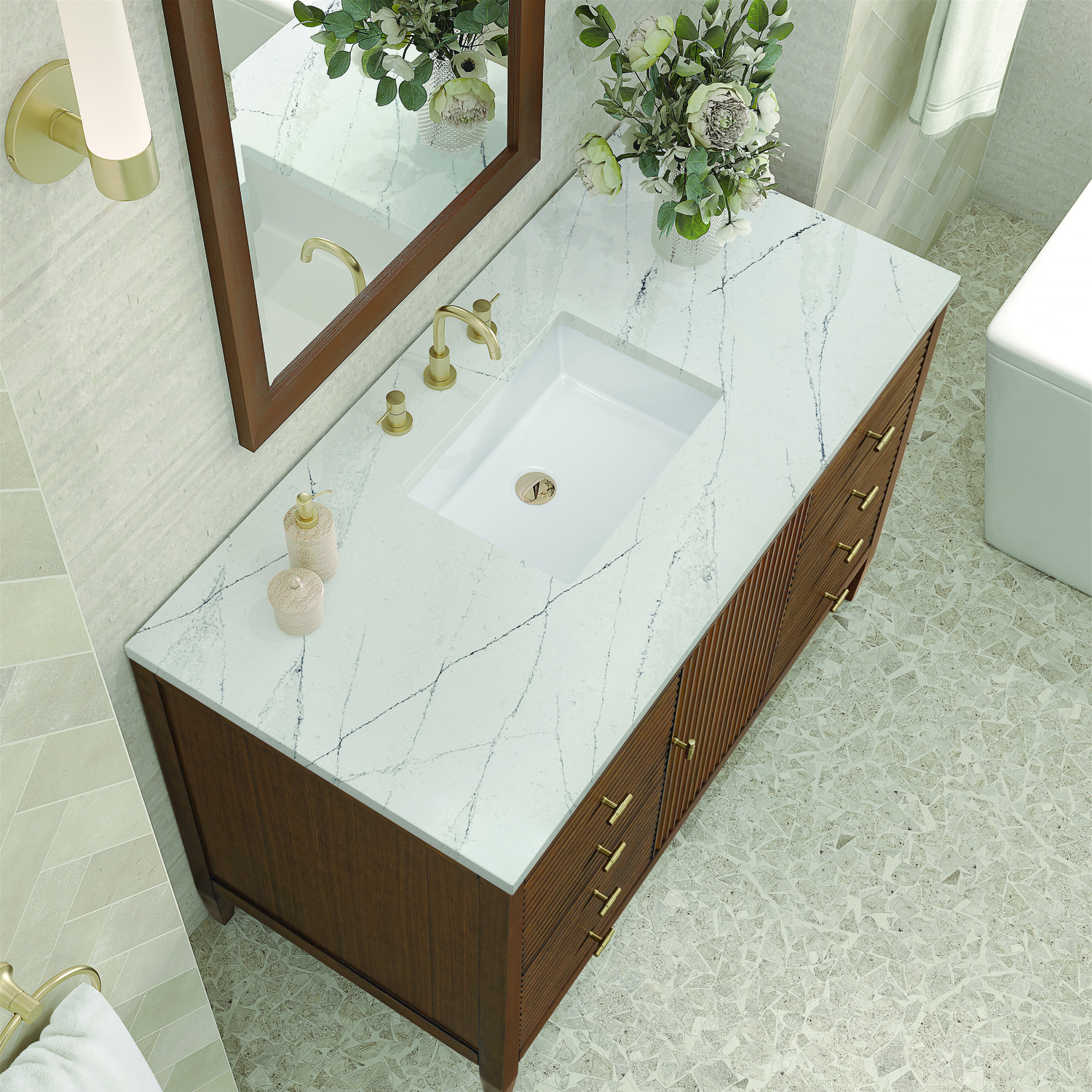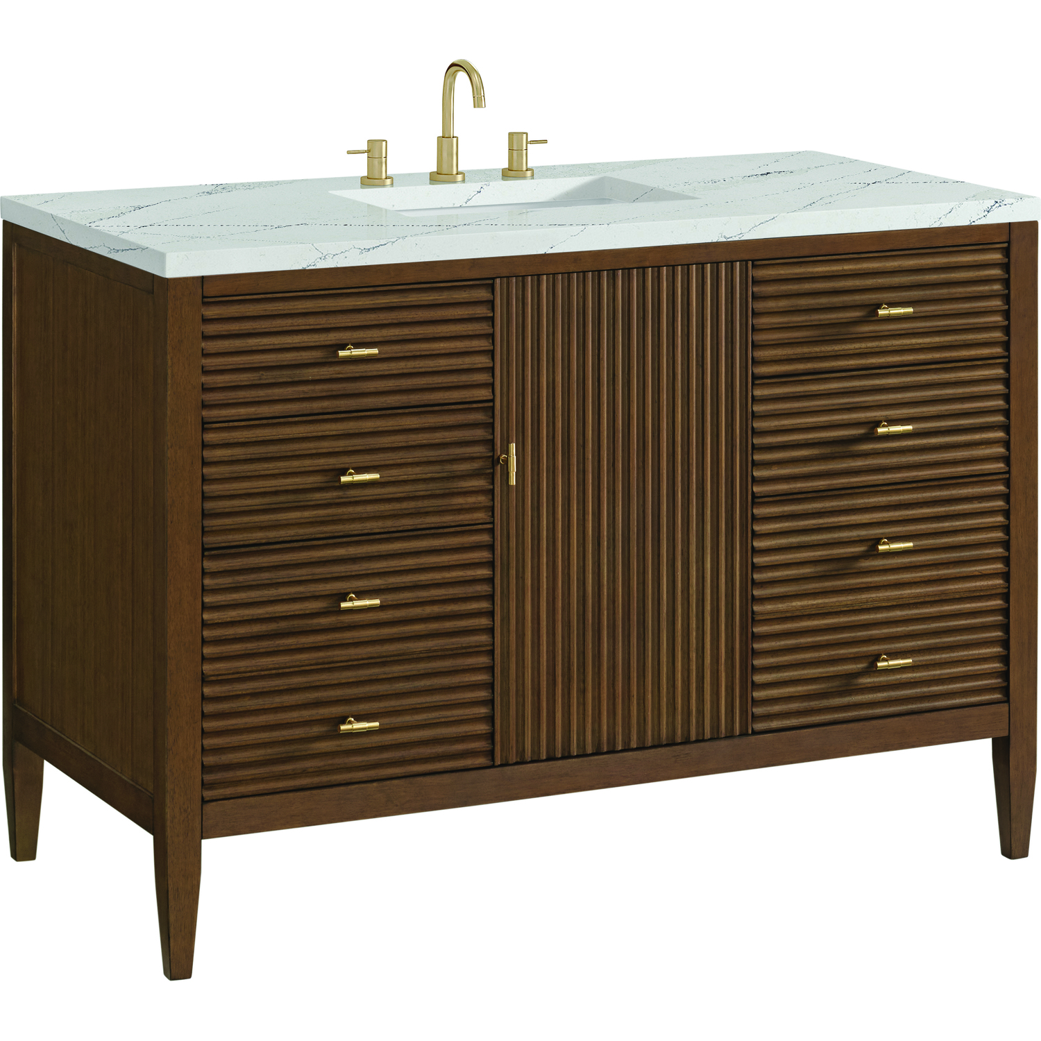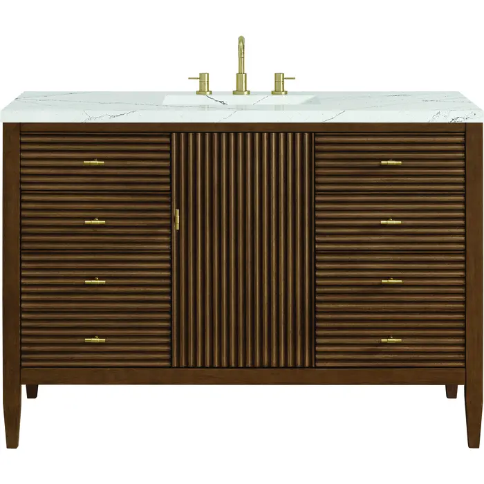 The 48" Myrrin Single Vanity features a minimalistic silhouette with fluted details, resulting in a blend of classical elegance and contemporary design. The deeply fluted panels run perpendicular on the doors and drawers, adding sophistication and visual interest to the design. Toggle-style knobs in Champagne Brass provide a luxe accent to the rich Mid-Century Walnut finish. The single-door cabinet opens to a spacious interior with a single shelf and a convenient USB/Electric power outlet. Six drawers lend additional storage. The addition of an Ethereal Noctis Silestone top by Cosentino with undermount rectangular sink completes this timeless bathroom centerpiece with its modern, intricate black and gray nuances which add contrast and elegance to the white background.Vanity set includes a 3cm eased edge Ethereal Noctis Silestone top, a white porcelain rectangular sink and mounting brackets for easy installation. Top is pre-drilled for an 8" widespread faucet. Faucet not included.Constructed with a solid wood frame with Walnut veneers over plywood and sealed with our premium moisture and UV resistant finishesOne 120-volt UL rated electric outlet with USB ports and bamboo organizer includedIncludes one soft-close door that opens to an interior shelf and three full-extension drawers that feature soft-close undermount glides.Toggle style door pulls in Champagne Brass finishThe drawer boxes feature English Dovetail joinery, and our signature brushed aluminum laminate drawer liners for easy cleaning.Includes one removable Bamboo drawer organizer.Cabinets are sealed with a premium finish for superior moisture and UV resistance.The deeply fluted panels of the Myrrin collection, framed in a sleek, minimalistic silhouette, bring an harmonious blend of classical elegance and contemporary design. The geometric play on the contrasting panels not only adds visual interest but also opens to reveal ample storage and organization. Offered in 4 sizes and 3 choices of finishes, each is complemented by Champagne Brass toggle-style knobs for a luxurious finishing touch.1 year warranty against manufacturer's defects. We will repair or replace any defective product, if the product is defective in material or workmanship at our discretion. No warranty is expressed or implied regarding damages resulting from consumer misuse.