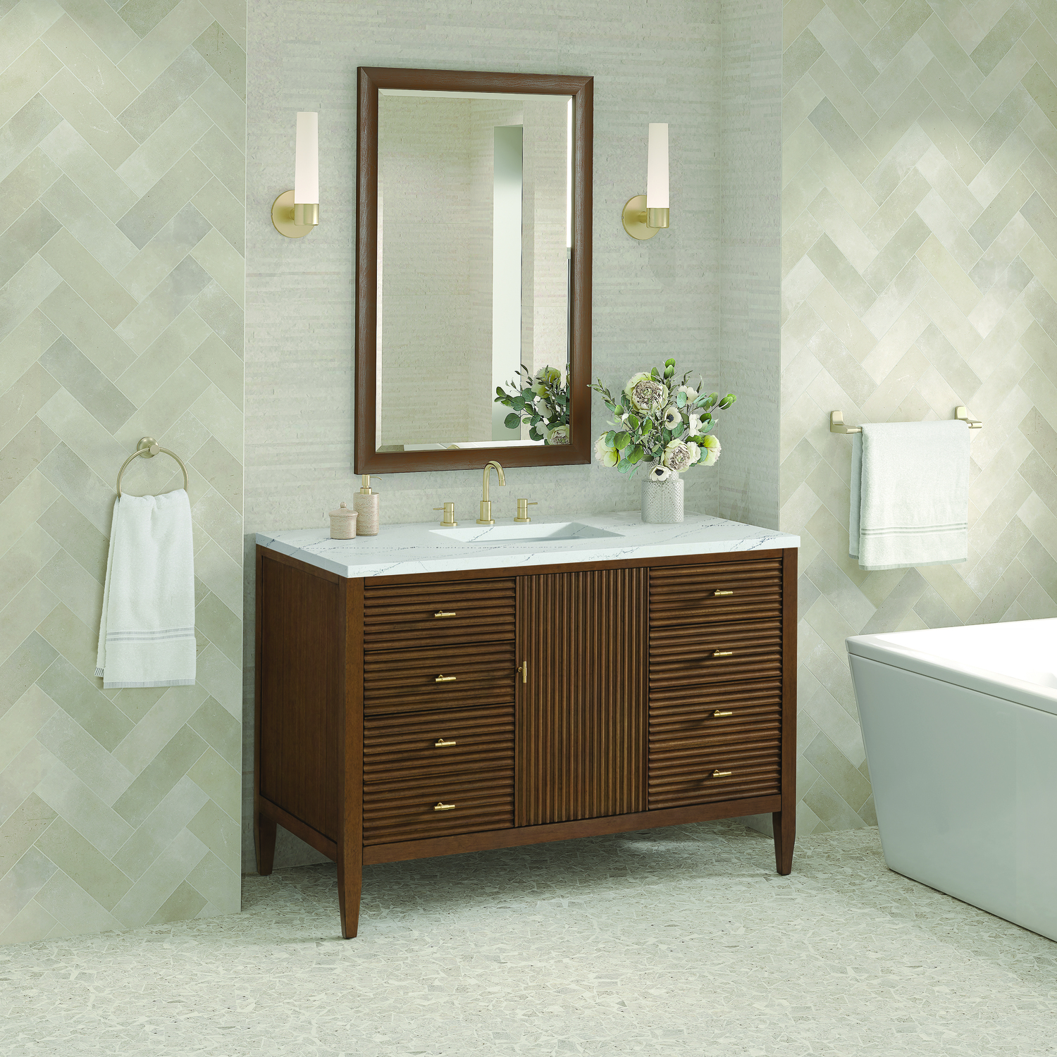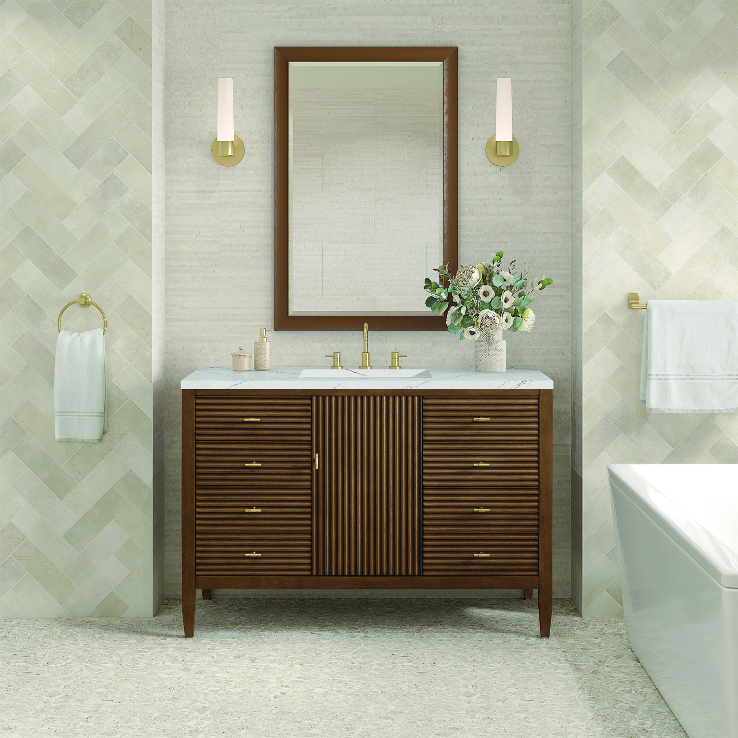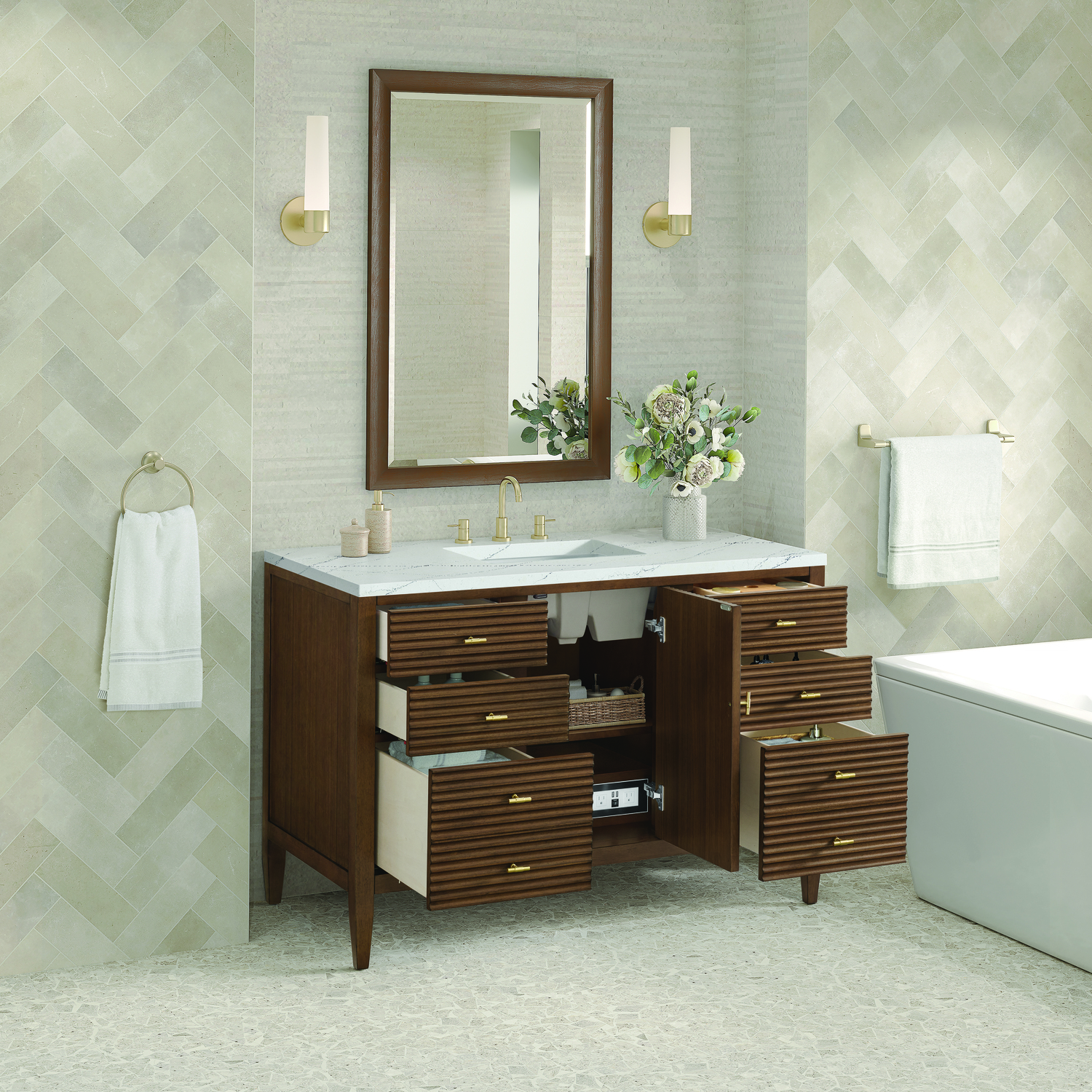 The 48" Myrrin Single Vanity features a minimalistic silhouette with fluted details, resulting in a blend of classical elegance and contemporary design. The deeply fluted panels run perpendicular on the doors and drawers, adding sophistication and visual interest to the design. Toggle-style knobs in Champagne Brass provide a luxe accent to the rich Mid-Century Walnut finish. The single-door cabinet opens to a spacious interior with a single shelf and a convenient USB/Electric power outlet. Six drawers lend additional storage. The addition of an Ethereal Noctis Silestone top by Cosentino with undermount rectangular sink completes this timeless bathroom centerpiece with its modern, intricate black and gray nuances which add contrast and elegance to the white background.Vanity set includes a 3cm eased edge Ethereal Noctis Silestone top, a white porcelain rectangular sink and mounting brackets for easy installation. Top is pre-drilled for an 8" widespread faucet. Faucet not included.Constructed with a solid wood frame with Walnut veneers over plywood and sealed with our premium moisture and UV resistant finishesOne 120-volt UL rated electric outlet with USB ports and bamboo organizer includedIncludes one soft-close door that opens to an interior shelf and three full-extension drawers that feature soft-close undermount glides.Toggle style door pulls in Champagne Brass finishThe drawer boxes feature English Dovetail joinery, and our signature brushed aluminum laminate drawer liners for easy cleaning.Includes one removable Bamboo drawer organizer.Cabinets are sealed with a premium finish for superior moisture and UV resistance.The deeply fluted panels of the Myrrin collection, framed in a sleek, minimalistic silhouette, bring an harmonious blend of classical elegance and contemporary design. The geometric play on the contrasting panels not only adds visual interest but also opens to reveal ample storage and organization. Offered in 4 sizes and 3 choices of finishes, each is complemented by Champagne Brass toggle-style knobs for a luxurious finishing touch.1 year warranty against manufacturer's defects. We will repair or replace any defective product, if the product is defective in material or workmanship at our discretion. No warranty is expressed or implied regarding damages resulting from consumer misuse.