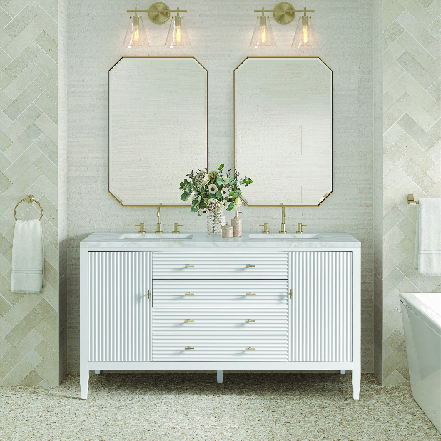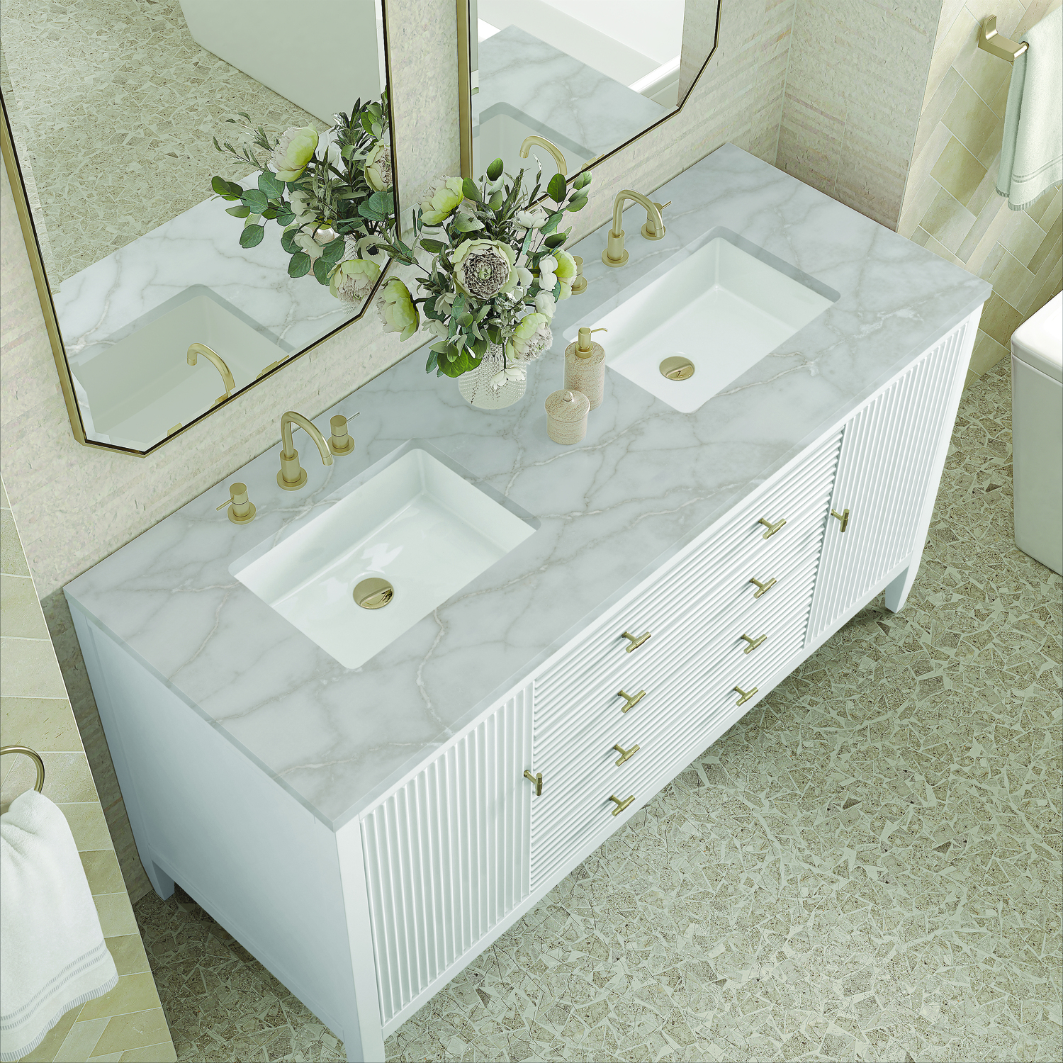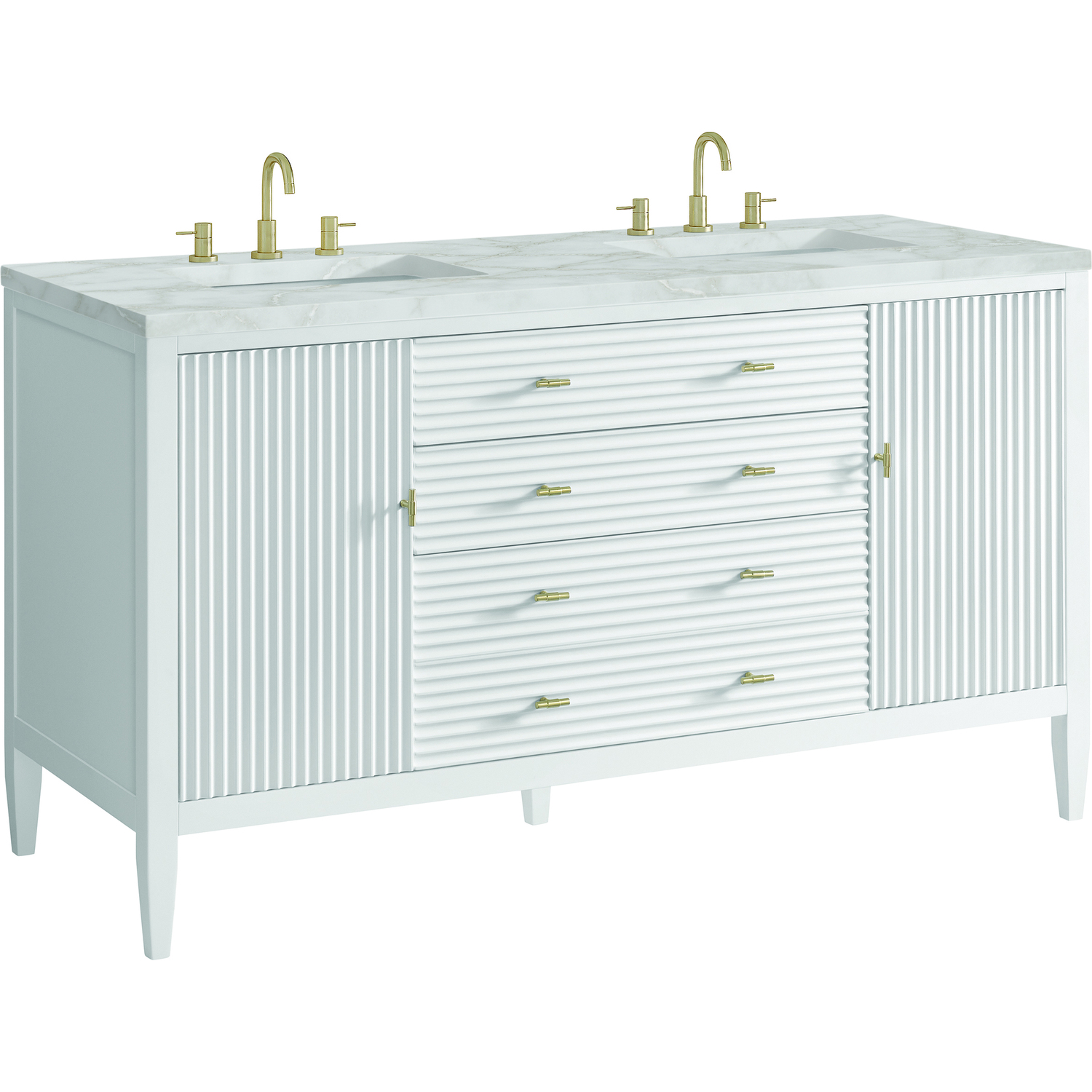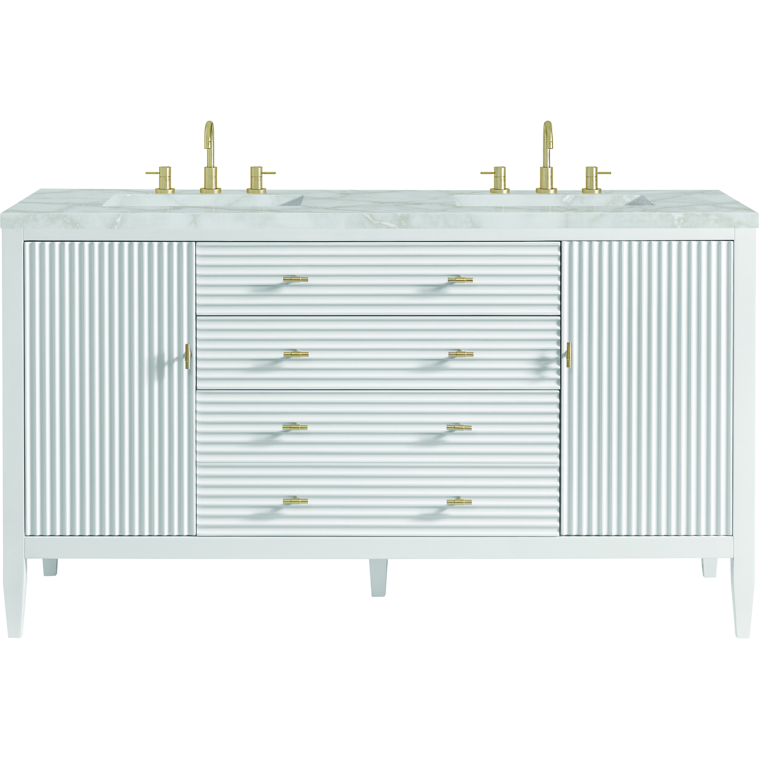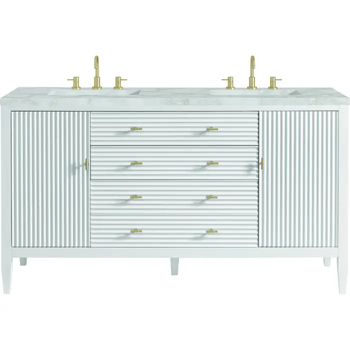 The 60" Myrrin Double Vanity features a minimalistic silhouette with fluted details, resulting in a blend of classical elegance and contemporary design. The deeply fluted panels run perpendicular on the doors and drawers, adding sophistication and visual interest to the design. Toggle-style knobs in Champagne Brass provide a luxe accent to the rich Bright White finish. The two-door cabinet opens to a spacious interior with a single shelf and a convenient USB/Electric power outlet. Two traditional drawers and a tip-out lend additional storage. The finish is accented by the neutral background of the Victorian Silver Silestone top, boasting champagne metallic accents which seamlessly complete the look.Vanity set includes a 3cm eased edge Victorian Silver Silestone top, two white porcelain rectangular sinks and mounting brackets for easy installation. Top is pre-drilled for two 8" widespread faucets. Faucets not included.Constructed with a solid wood frame and plywood panelsTwo 120-volt UL rated electric outlets with USB ports and bamboo organizer includedIncludes two soft-close doors that open to an interior shelf, one soft-close tip out and two full-extension drawers that feature soft-close undermount glides.Toggle style door pulls in Champagne Brass finishThe drawer boxes feature English Dovetail joinery, and our signature brushed aluminum laminate drawer liners for easy cleaning.Includes one removable Bamboo drawer organizer.Cabinets are sealed with a premium finish for superior moisture and UV resistance.The deeply fluted panels of the Myrrin collection, framed in a sleek, minimalistic silhouette, bring an harmonious blend of classical elegance and contemporary design. The geometric play on the contrasting panels not only adds visual interest but also opens to reveal ample storage and organization. Offered in 4 sizes and 3 choices of finishes, each is complemented by Champagne Brass toggle-style knobs for a luxurious finishing touch.1 year warranty against manufacturer's defects. We will repair or replace any defective product, if the product is defective in material or workmanship at our discretion. No warranty is expressed or implied regarding damages resulting from consumer misuse.