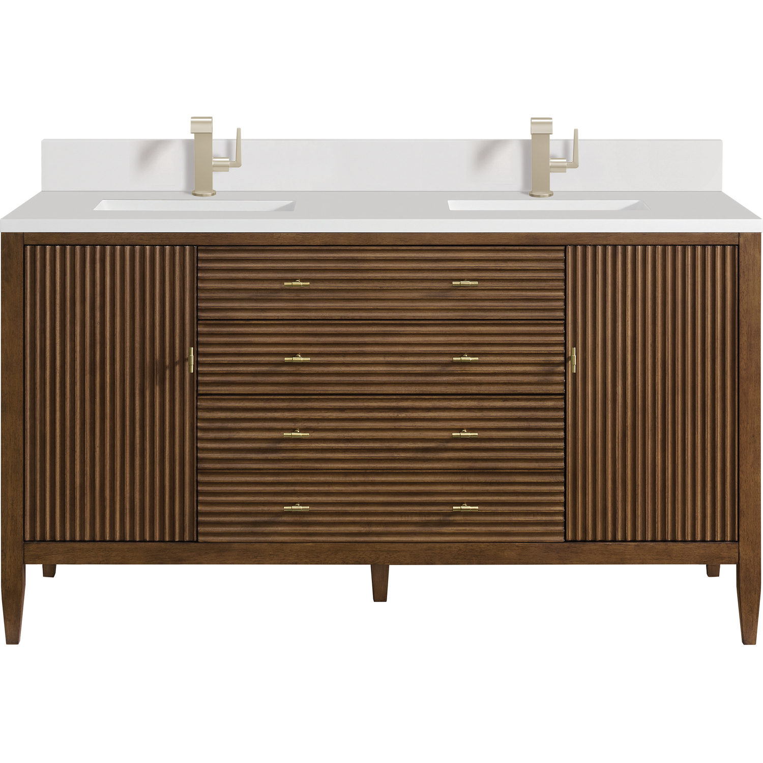 The 60" Myrrin Double Vanity features a minimalistic silhouette with fluted details, resulting in a blend of classical elegance and contemporary design. The deeply fluted panels run perpendicular on the doors and drawers, adding sophistication and visual interest to the design. Toggle-style knobs in Champagne Brass provide a luxe accent to the rich Mid-Century Walnut finish. The two-door cabinet opens to a spacious interior with a single shelf and a convenient USB/Electric power outlet. Two traditional drawers and a tip-out lend additional storage. With the addition of a classic White Zeus Silestone top with backsplash and undermount sink, this vanity is a seamless integration of modern design and functionality.Vanity set includes a 3cm eased edge White Zeus Silestone top with matching backsplash, two white porcelain rectangular sinks and mounting brackets for easy installation. Top is pre-drilled for two single hole faucets. Faucets not included.Constructed with a solid wood frame with Walnut veneers over plywood and sealed with our premium moisture and UV resistant finishesTwo 120-volt UL rated electric outlets with USB ports and bamboo organizer includedIncludes two soft-close doors that open to an interior shelf, one soft-close tip out and two full-extension drawers that feature soft-close undermount glides.Toggle style door pulls in Champagne Brass finishThe drawer boxes feature English Dovetail joinery, and our signature brushed aluminum laminate drawer liners for easy cleaning.Includes one removable Bamboo drawer organizer.Cabinets are sealed with a premium finish for superior moisture and UV resistance.Matching White Zeus 3cm Silestone backsplash included.Faucets sold separatelyThe deeply fluted panels of the Myrrin collection, framed in a sleek, minimalistic silhouette, bring an harmonious blend of classical elegance and contemporary design. The geometric play on the contrasting panels not only adds visual interest but also opens to reveal ample storage and organization. Offered in 4 sizes and 3 choices of finishes, each is complemented by Champagne Brass toggle-style knobs for a luxurious finishing touch.1 year warranty against manufacturer's defects. We will repair or replace any defective product, if the product is defective in material or workmanship at our discretion. No warranty is expressed or implied regarding damages resulting from consumer misuse.