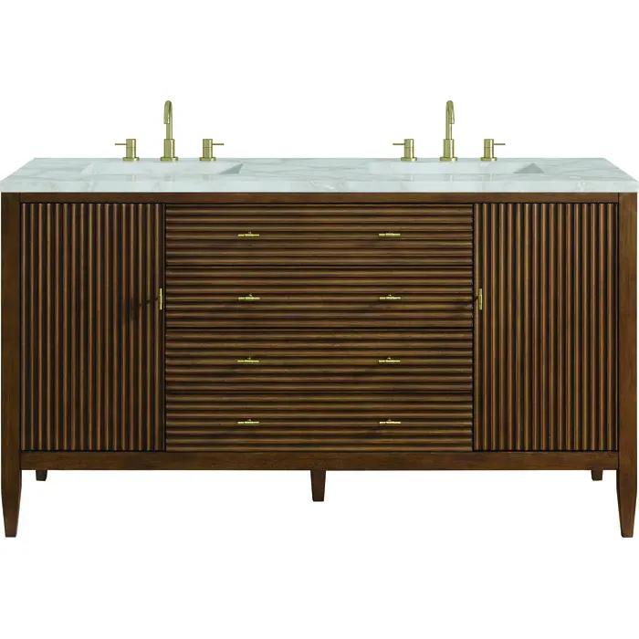 Featuring fluted detailing and a sleek silhouette, the Myrrin 60” Double Vanity brings Mid-Century charm and modern utility to your bathroom. Finished in a rich Mid-Century Walnut and complemented by Champagne Brass T-shaped knobs, Myrrin offers generous storage. The two cabinet doors each open to reveal a spacious interior with a single shelf and a convenient USB/120V power unit for everyday convenience, with two full-extension drawers (one double-deep) and one top-row tip-out drawer for additional storage. Completed with an elegant Victorian Silver Silestone® top with dual undermount sinks, this vanity is a seamless integration of modern design and functionality. This unit is enabled with FreePower wireless charging; featuring a single-device charger seamlessly embedded into the countertop, indicated by a light-up halo in between the sinks. Designed for modern living, FreePower offers convenient, integrated, wireless charging when and where you need it.FreePower Wireless Charging; single-device unit in between sinksTwo-door cabinet, each opening to an internal shelf, with two full extension drawers (one double-deep) and one top-row tip-out drawerDrawer boxes feature English Dovetail joinery with premium, soft-close undermount drawer slides; doors feature soft-close, adjustable door hingesCabinet features a multi-stage premium finish coat to offer UV and moisture resistanceMid-Century Walnut finish with Champagne Brass T-knobsCountertop is pre-drilled for 8" widespread faucet(s); our 3cm eased edge countertops come with white porcelain rectangular sink(s) that ship separately and include mounting brackets for easy installationIntegrated 120V outlet with USB portsDrawers lined with our signature brushed aluminum laminate for easy cleaningRemovable bamboo drawer organizer includedMatching stone backsplash available as add-on purchaseFreestanding vanityFaucet sold separatelyThe fluted panels and minimalistic silhouette of the Myrrin Collection bring a harmonious blend of classical elegance and contemporary design to any space. The geometric play of the contrasting panels adds visual drama and allows the light to accentuate this dramatic design. Available in three finishes and adorned with T-knobs in Champagne Brass, the Myrrin is the perfect statement piece for any bathroom.1 year warranty against manufacturer's defects. We will repair or replace any defective product, if the product is defective in material or workmanship at our discretion. No warranty is expressed or implied regarding damages resulting from consumer misuse.