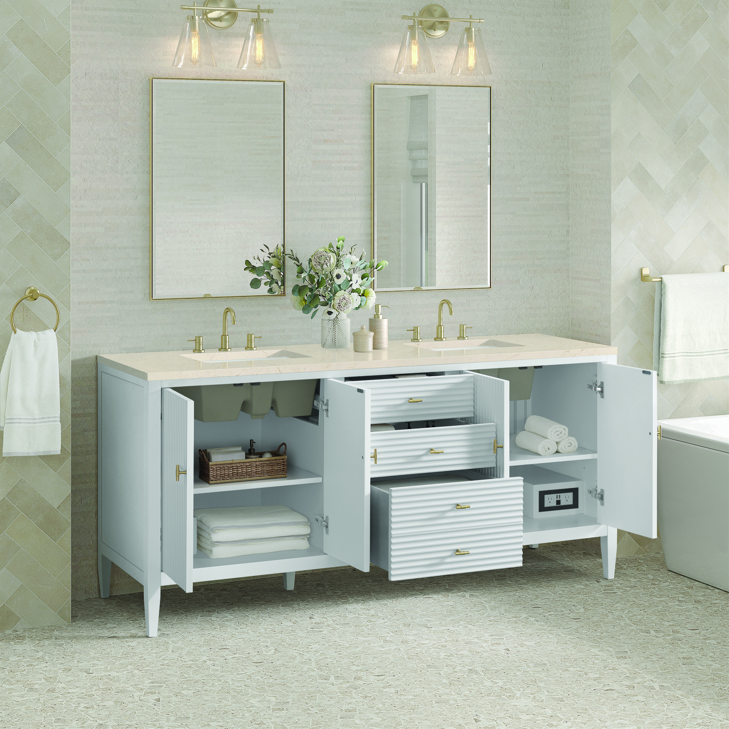 The 72" Myrrin Double Vanity features a minimalistic silhouette with fluted details, resulting in a blend of classical elegance and contemporary design. The deeply fluted panels run perpendicular on the doors and drawers, adding sophistication and visual interest to the design. Toggle-style knobs in Champagne Brass provide a luxe accent to the rich Bright White finish. The four-door cabinet opens to a spacious interior with a single shelf and convenient USB/Electric power outlets. Three drawers lend additional storage. The Eternal Marfil Silestone top by Cosentino incorporates classic, warm tones. Finally, an undermount rectangular sink completes this striking look.Vanity set includes a 3cm eased edge Eternal Marfil Silestone top, two white porcelain rectangular sinks and mounting brackets for easy installation. Top is pre-drilled for two 8" widespread faucets. Faucets not included.Constructed with a solid wood frame and plywood panelsTwo 120-volt UL rated electric outlets with USB ports and bamboo organizer includedIncludes four soft-close doors that each pair open to an interior shelf and three full-extension drawers that feature soft-close undermount glides.Toggle style door pulls in Champagne Brass finish.The drawer boxes feature English Dovetail joinery, and our signature brushed aluminum laminate drawer liners for easy cleaning.Includes one removable Bamboo drawer organizer.Cabinets are sealed with a premium finish for superior moisture and UV resistance.The deeply fluted panels of the Myrrin collection, framed in a sleek, minimalistic silhouette, bring an harmonious blend of classical elegance and contemporary design. The geometric play on the contrasting panels not only adds visual interest but also opens to reveal ample storage and organization. Offered in 4 sizes and 3 choices of finishes, each is complemented by Champagne Brass toggle-style knobs for a luxurious finishing touch.1 year warranty against manufacturer's defects. We will repair or replace any defective product, if the product is defective in material or workmanship at our discretion. No warranty is expressed or implied regarding damages resulting from consumer misuse.