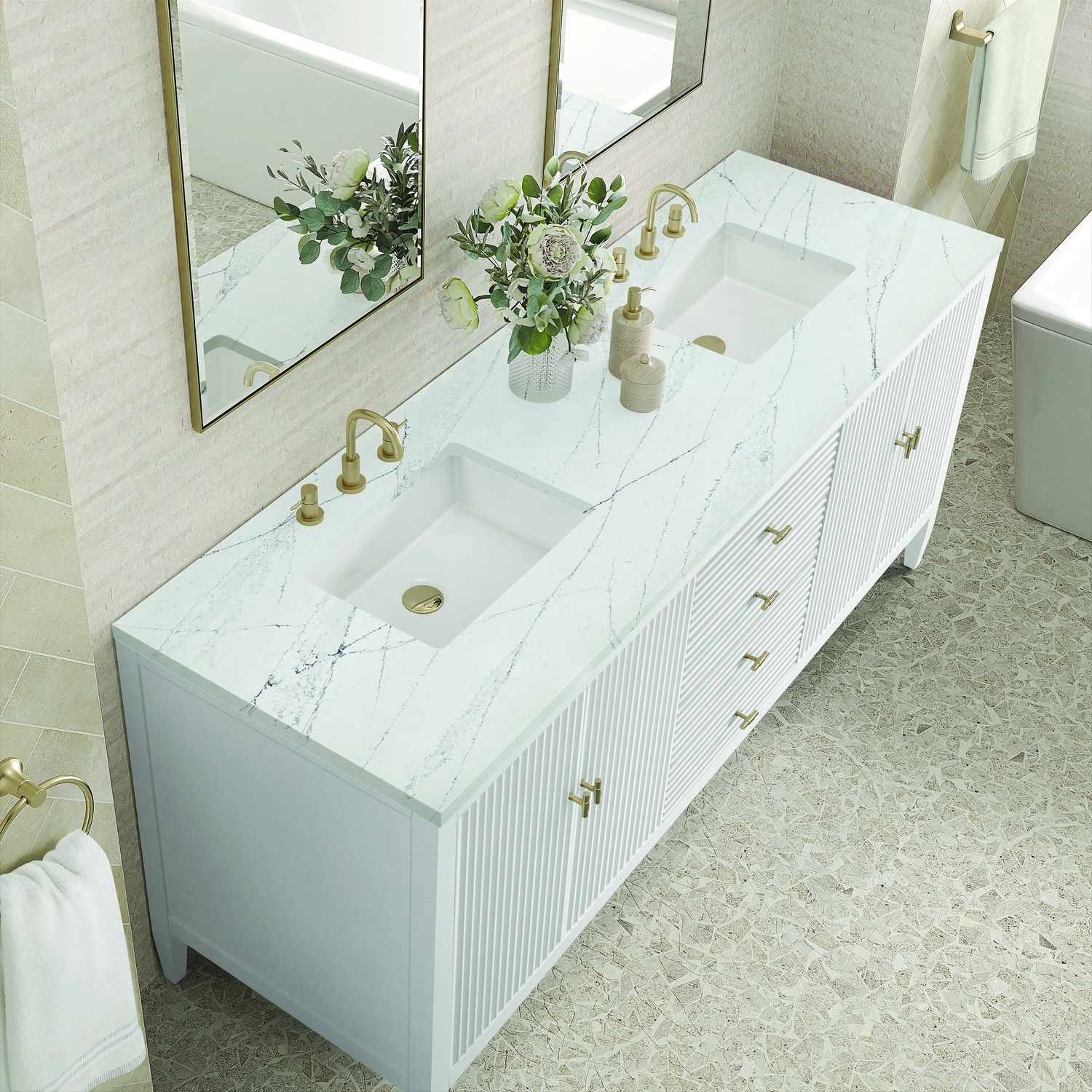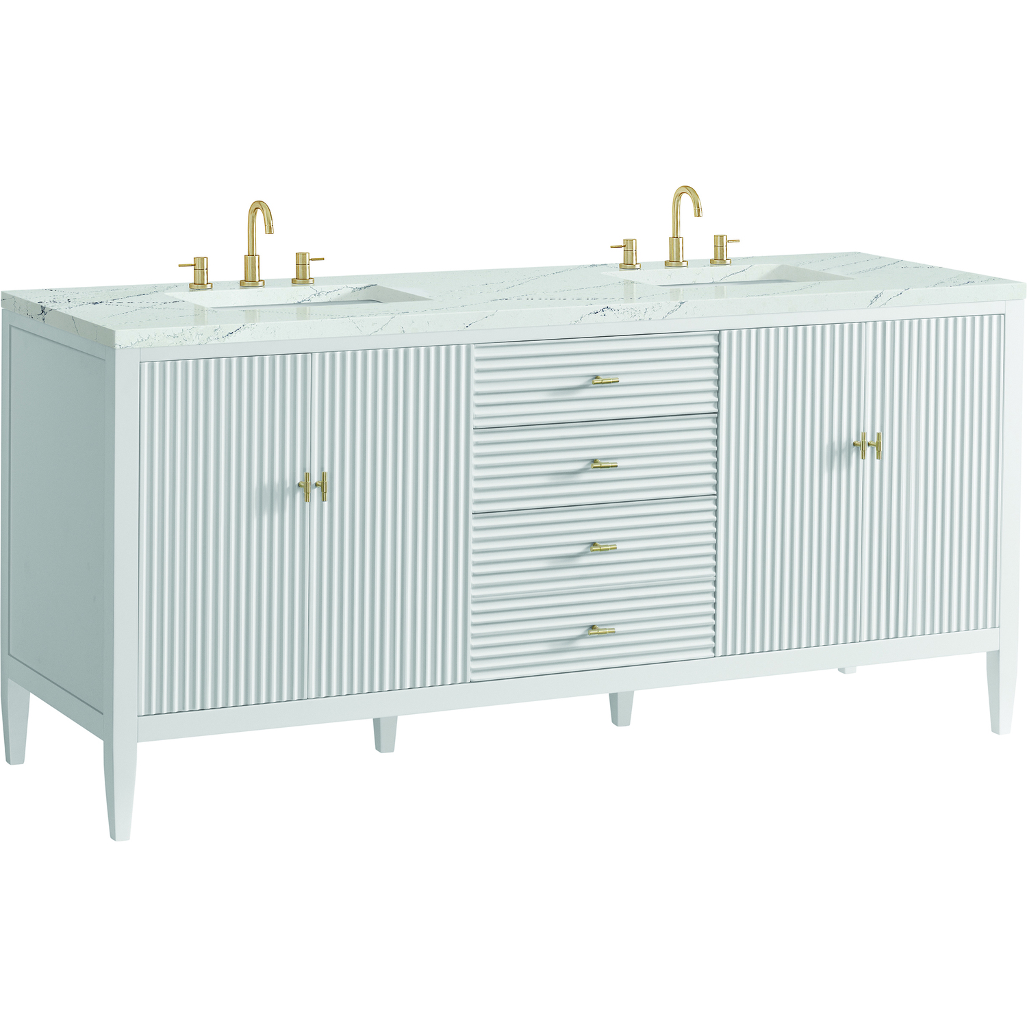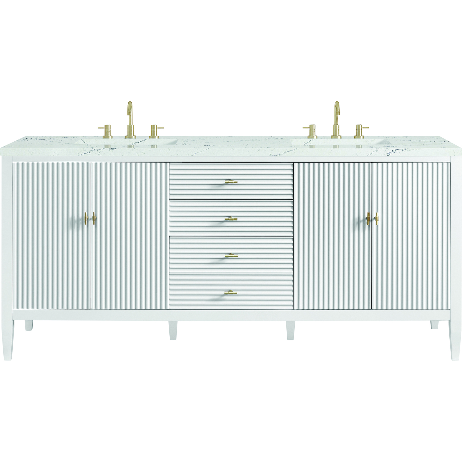 The 72" Myrrin Double Vanity features a minimalistic silhouette with fluted details, resulting in a blend of classical elegance and contemporary design. The deeply fluted panels run perpendicular on the doors and drawers, adding sophistication and visual interest to the design. Toggle-style knobs in Champagne Brass provide a luxe accent to the rich Bright White finish. The four-door cabinet opens to a spacious interior with a single shelf and convenient USB/Electric power outlets. Three drawers lend additional storage. The addition of an Ethereal Noctis Silestone top by Cosentino with undermount rectangular sink completes this timeless bathroom centerpiece with its modern, intricate black and gray nuances which add contrast and elegance to the white background.Vanity set includes a 3cm eased edge Ethereal Noctis Silestone top, two white porcelain rectangular sinks and mounting brackets for easy installation. Top is pre-drilled for two 8" widespread faucets. Faucets not included.Constructed with a solid wood frame and plywood panelsTwo 120-volt UL rated electric outlets with USB ports and bamboo organizer includedIncludes four soft-close doors that each pair open to an interior shelf and three full-extension drawers that feature soft-close undermount glides.Toggle style door pulls in Champagne Brass finish.The drawer boxes feature English Dovetail joinery, and our signature brushed aluminum laminate drawer liners for easy cleaning.Includes one removable Bamboo drawer organizer.Cabinets are sealed with a premium finish for superior moisture and UV resistance.The deeply fluted panels of the Myrrin collection, framed in a sleek, minimalistic silhouette, bring an harmonious blend of classical elegance and contemporary design. The geometric play on the contrasting panels not only adds visual interest but also opens to reveal ample storage and organization. Offered in 4 sizes and 3 choices of finishes, each is complemented by Champagne Brass toggle-style knobs for a luxurious finishing touch.1 year warranty against manufacturer's defects. We will repair or replace any defective product, if the product is defective in material or workmanship at our discretion. No warranty is expressed or implied regarding damages resulting from consumer misuse.