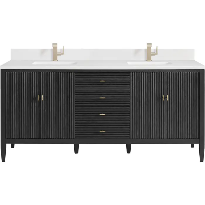 The 72" Myrrin Double Vanity features a minimalistic silhouette with fluted details, resulting in a blend of classical elegance and contemporary design. The deeply fluted panels run perpendicular on the doors and drawers, adding sophistication and visual interest to the design. Toggle-style knobs in Champagne Brass provide a luxe accent to the sophisticated Carbon Oak finish. The four-door cabinet opens to a spacious interior with a single shelf and convenient USB/Electric power outlets. Three drawers lend additional storage. With the addition of an classic White Zeus Silestone top with backsplash and undermount sink, this vanity is a seamless integration of modern design and functionality.Vanity set includes a 3cm eased edge White Zeus Silestone top with matching backsplash, two white porcelain rectangular sinks and mounting brackets for easy installation. Top is pre-drilled for two single hole faucets. Faucets not included.Constructed with a solid Ash wood frame and Ash veneers over plywood panels and sealed with our premium moisture and UV resistant coatingsTwo 120-volt UL rated electric outlets with USB ports and bamboo organizer includedIncludes four soft-close doors that each pair open to an interior shelf and three full-extension drawers that feature soft-close undermount glides.Toggle style door pulls in Champagne Brass finish.The drawer boxes feature English Dovetail joinery, and our signature brushed aluminum laminate drawer liners for easy cleaning.Includes one removable Bamboo drawer organizer.Cabinets are sealed with a premium finish for superior moisture and UV resistance.Matching White Zeus 3cm Silestone backsplash included.Faucets sold separatelyThe deeply fluted panels of the Myrrin collection, framed in a sleek, minimalistic silhouette, bring an harmonious blend of classical elegance and contemporary design. The geometric play on the contrasting panels not only adds visual interest but also opens to reveal ample storage and organization. Offered in 4 sizes and 3 choices of finishes, each is complemented by Champagne Brass toggle-style knobs for a luxurious finishing touch.1 year warranty against manufacturer's defects. We will repair or replace any defective product, if the product is defective in material or workmanship at our discretion. No warranty is expressed or implied regarding damages resulting from consumer misuse.