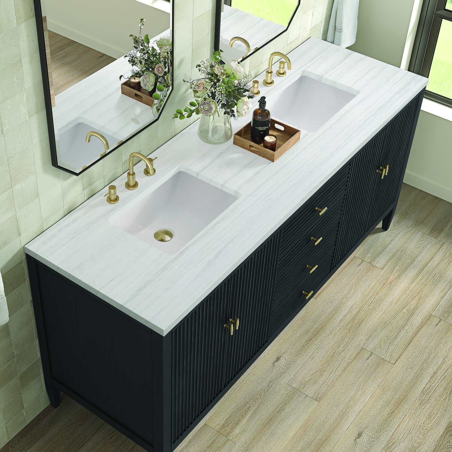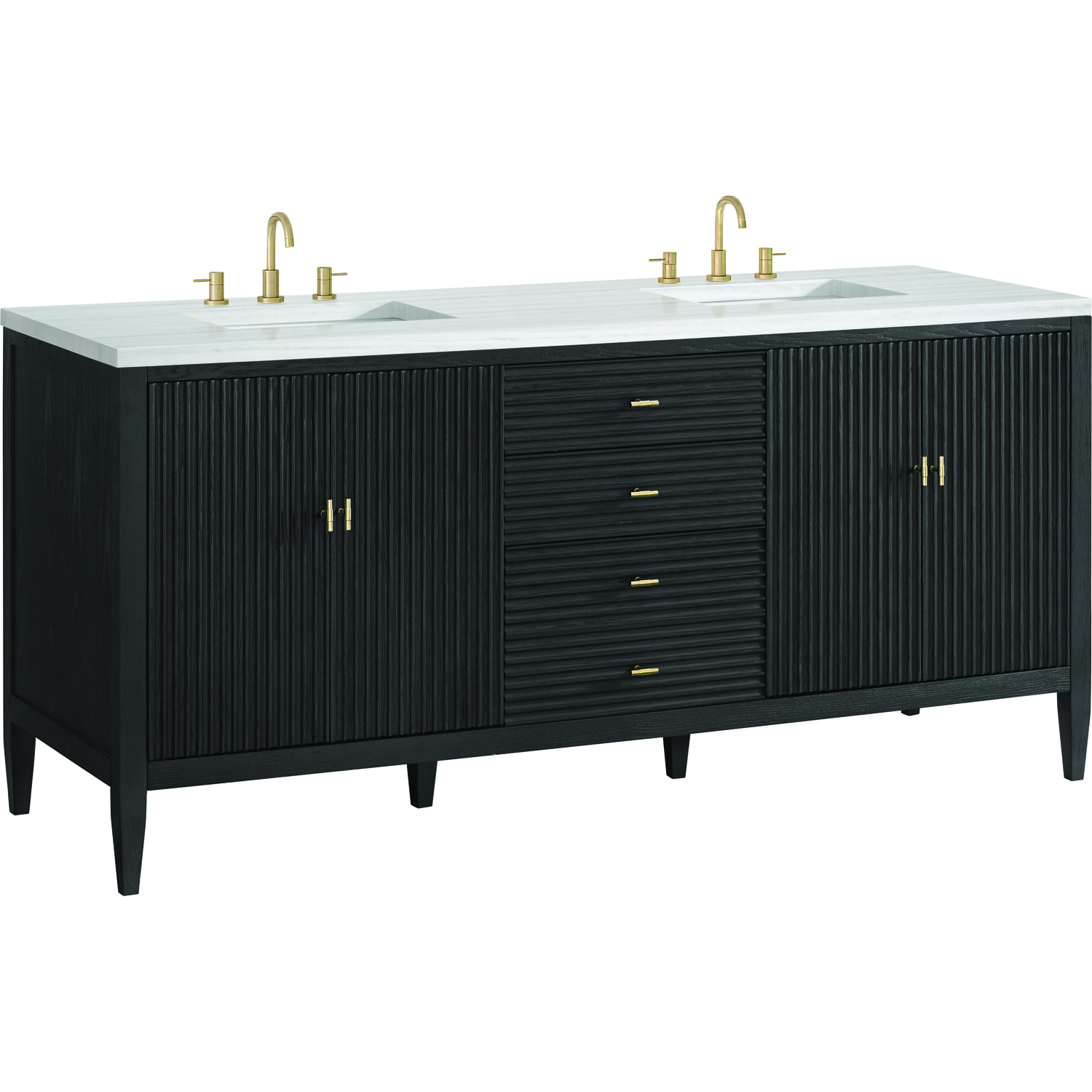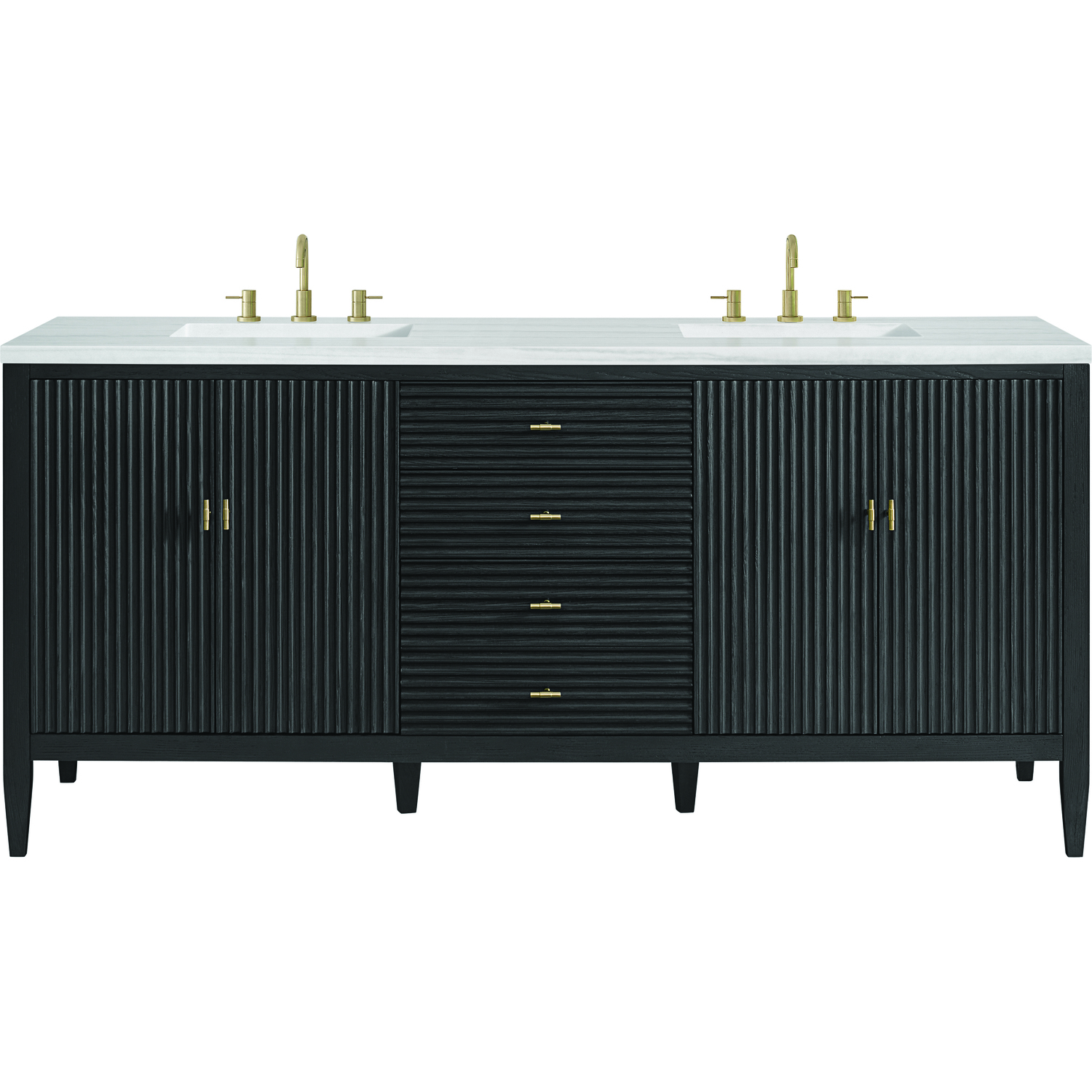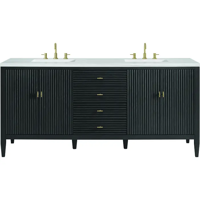 The 72" Myrrin Double Vanity features a minimalistic silhouette with fluted details, resulting in a blend of classical elegance and contemporary design. The deeply fluted panels run perpendicular on the doors and drawers, adding sophistication and visual interest to the design. Toggle-style knobs in Champagne Brass provide a luxe accent to the sophisticated Carbon Oak finish. The four-door cabinet opens to a spacious interior with a single shelf and convenient USB/Electric power outlets. Three drawers lend additional storage. Completing this beautiful vanity is a 3 cm solid surface Arctic Fall vanity top, which displays horizontal grey veining, giving you the look of classic marble with the benefits of modern technology.Vanity set includes a 3cm eased edge Arctic Fall Solid Surface top with two undermount white porcelain rectangular sinks uninstalled and includes mounting brackets for easy installation. Solid Surface tops are beautifully consistent and have low porosity Constructed with a solid Ash wood frame and Ash veneers over plywood panels and sealed with our premium moisture and UV resistant coatingsTwo 120-volt UL rated electric outlets with USB ports and bamboo organizer includedIncludes four soft-close doors that each pair open to an interior shelf and three full-extension drawers that feature soft-close undermount glides.Toggle style door pulls in Champagne Brass finish.The drawer boxes feature English Dovetail joinery, and our signature brushed aluminum laminate drawer liners for easy cleaning.Includes one removable Bamboo drawer organizer.Cabinets are sealed with a premium finish for superior moisture and UV resistance.The deeply fluted panels of the Myrrin collection, framed in a sleek, minimalistic silhouette, bring an harmonious blend of classical elegance and contemporary design. The geometric play on the contrasting panels not only adds visual interest but also opens to reveal ample storage and organization. Offered in 4 sizes and 3 choices of finishes, each is complemented by Champagne Brass toggle-style knobs for a luxurious finishing touch.1 year warranty against manufacturer's defects. We will repair or replace any defective product, if the product is defective in material or workmanship at our discretion. No warranty is expressed or implied regarding damages resulting from consumer misuse.