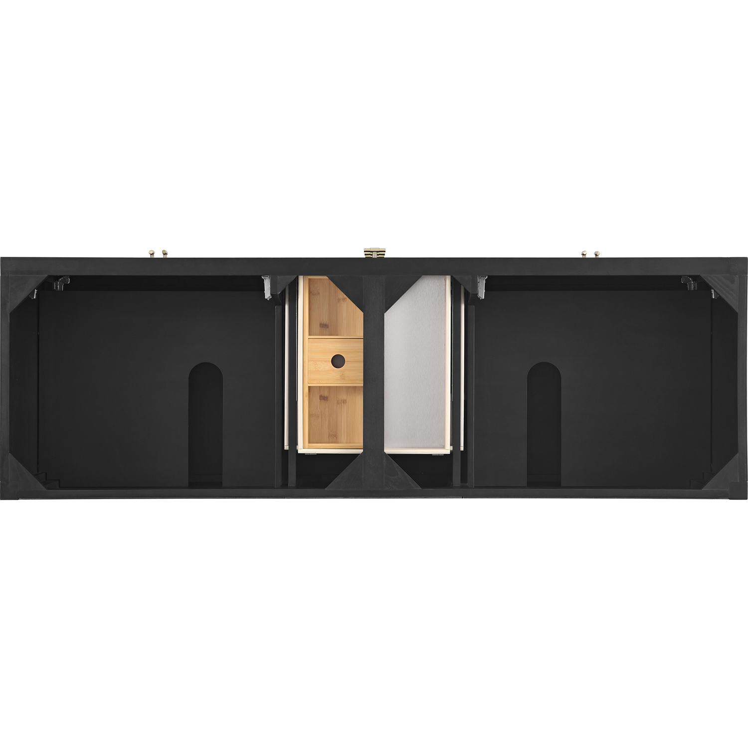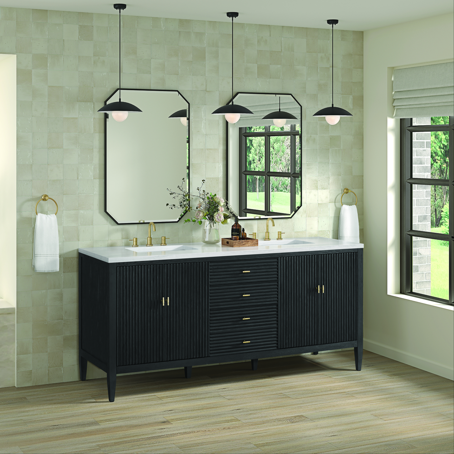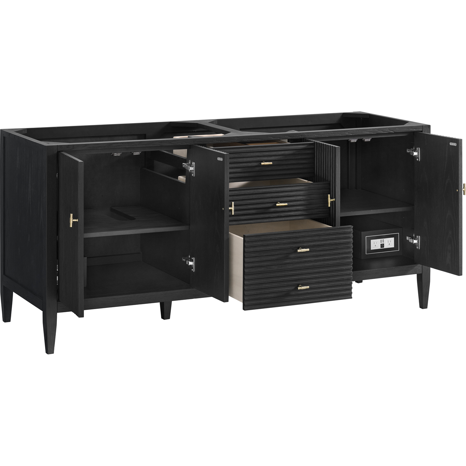 The 72" Myrrin Double Vanity features a minimalistic silhouette with fluted details, resulting in a blend of classical elegance and contemporary design. The deeply fluted panels run perpendicular on the doors and drawers, adding sophistication and visual interest to the design. Toggle-style knobs in Champagne Brass provide a luxe accent to the sophisticated Carbon Oak finish. The four-door cabinet opens to a spacious interior with a single shelf and convenient USB/Electric power outlets. Three drawers lend additional storage. Completing this beautiful vanity is a 3 cm solid surface Arctic Fall vanity top, which displays horizontal grey veining, giving you the look of classic marble with the benefits of modern technology.Vanity set includes a 3cm eased edge Arctic Fall Solid Surface top with two undermount white porcelain rectangular sinks uninstalled and includes mounting brackets for easy installation. Solid Surface tops are beautifully consistent and have low porosity Constructed with a solid Ash wood frame and Ash veneers over plywood panels and sealed with our premium moisture and UV resistant coatingsTwo 120-volt UL rated electric outlets with USB ports and bamboo organizer includedIncludes four soft-close doors that each pair open to an interior shelf and three full-extension drawers that feature soft-close undermount glides.Toggle style door pulls in Champagne Brass finish.The drawer boxes feature English Dovetail joinery, and our signature brushed aluminum laminate drawer liners for easy cleaning.Includes one removable Bamboo drawer organizer.Cabinets are sealed with a premium finish for superior moisture and UV resistance.The deeply fluted panels of the Myrrin collection, framed in a sleek, minimalistic silhouette, bring an harmonious blend of classical elegance and contemporary design. The geometric play on the contrasting panels not only adds visual interest but also opens to reveal ample storage and organization. Offered in 4 sizes and 3 choices of finishes, each is complemented by Champagne Brass toggle-style knobs for a luxurious finishing touch.1 year warranty against manufacturer's defects. We will repair or replace any defective product, if the product is defective in material or workmanship at our discretion. No warranty is expressed or implied regarding damages resulting from consumer misuse.