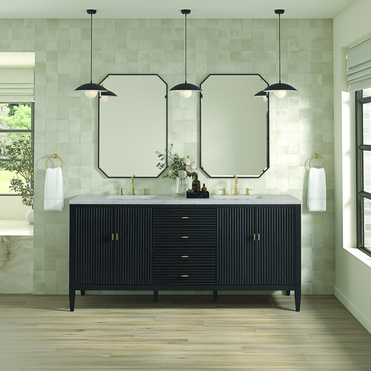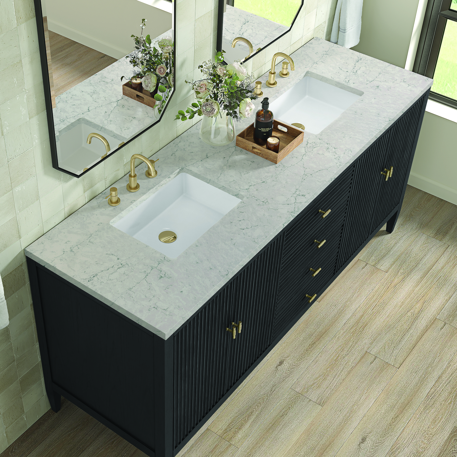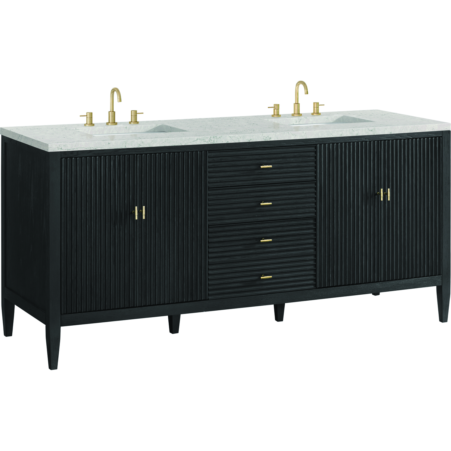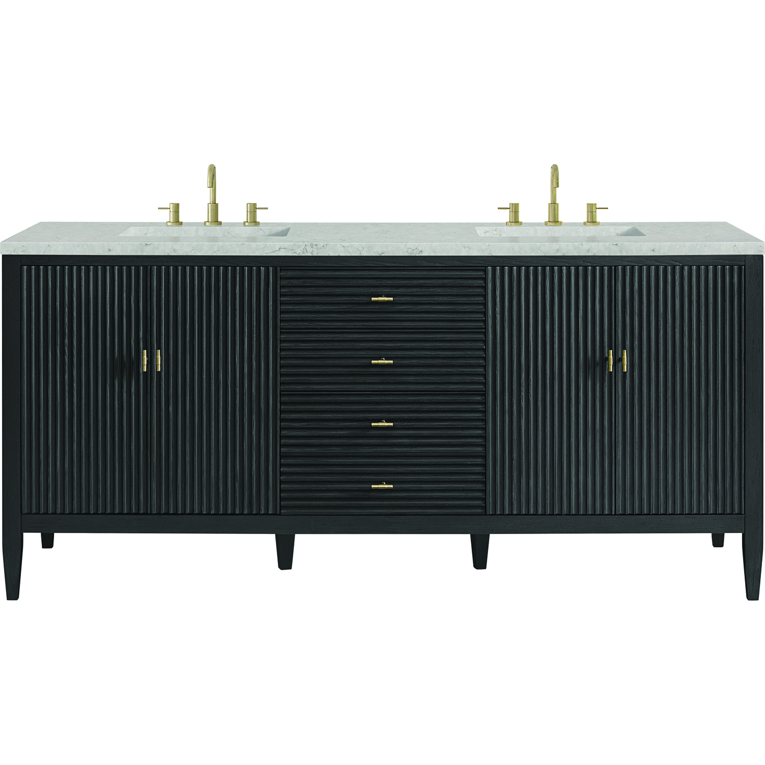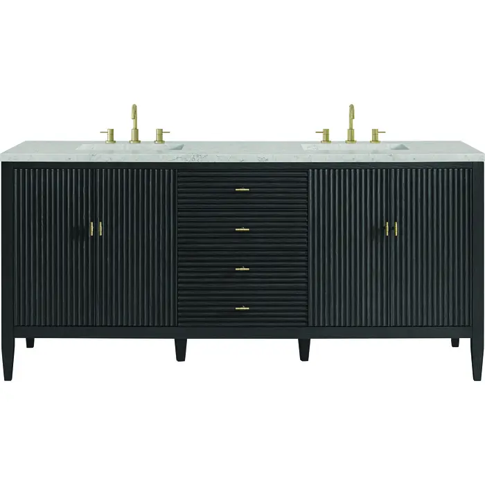 The 72" Myrrin Double Vanity features a minimalistic silhouette with fluted details, resulting in a blend of classical elegance and contemporary design. The deeply fluted panels run perpendicular on the doors and drawers, adding sophistication and visual interest to the design. Toggle-style knobs in Champagne Brass provide a luxe accent to the sophisticated Carbon Oak finish. The four-door cabinet opens to a spacious interior with a single shelf and convenient USB/Electric power outlets. Three drawers lend additional storage. Completing the look is the Eternal Jasmine Pearl Silestone top by Cosentino, featuring an elegant white background with subtle marbleized swirls and dark blue-gray veining patterns.Vanity set includes a 3cm eased edge Eternal Jasmine Pearl Silestone top, two white porcelain rectangular sinks and mounting brackets for easy installation. Top is pre-drilled for two 8" widespread faucets. Faucets not included.Constructed with a solid Ash wood frame and Ash veneers over plywood panels and sealed with our premium moisture and UV resistant coatingsTwo 120-volt UL rated electric outlets with USB ports and bamboo organizer includedIncludes four soft-close doors that each pair open to an interior shelf and three full-extension drawers that feature soft-close undermount glides.Toggle style door pulls in Champagne Brass finish.The drawer boxes feature English Dovetail joinery, and our signature brushed aluminum laminate drawer liners for easy cleaning.Includes one removable Bamboo drawer organizer.Cabinets are sealed with a premium finish for superior moisture and UV resistance.The deeply fluted panels of the Myrrin collection, framed in a sleek, minimalistic silhouette, bring an harmonious blend of classical elegance and contemporary design. The geometric play on the contrasting panels not only adds visual interest but also opens to reveal ample storage and organization. Offered in 4 sizes and 3 choices of finishes, each is complemented by Champagne Brass toggle-style knobs for a luxurious finishing touch.1 year warranty against manufacturer's defects. We will repair or replace any defective product, if the product is defective in material or workmanship at our discretion. No warranty is expressed or implied regarding damages resulting from consumer misuse.