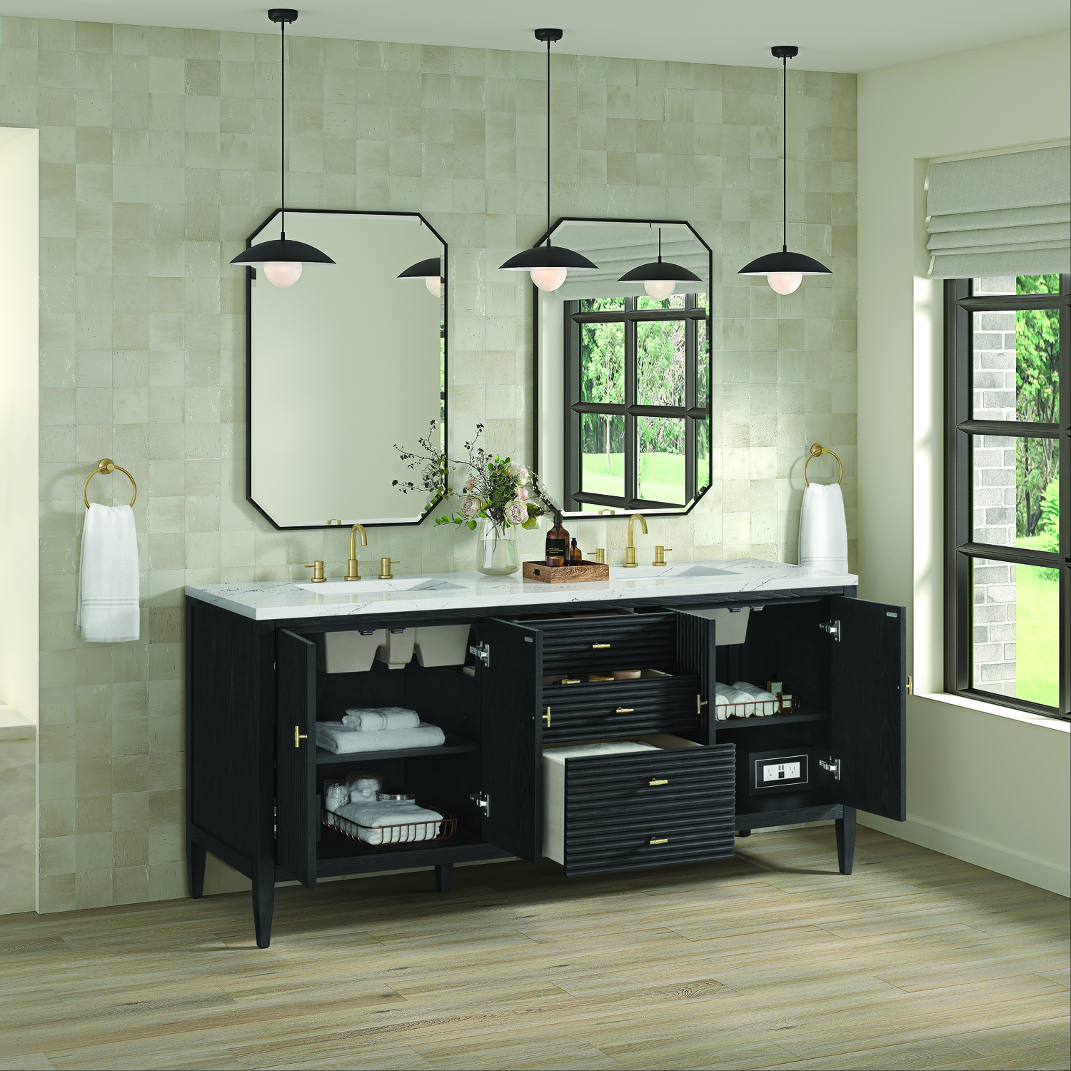 The 72" Myrrin Double Vanity features a minimalistic silhouette with fluted details, resulting in a blend of classical elegance and contemporary design. The deeply fluted panels run perpendicular on the doors and drawers, adding sophistication and visual interest to the design. Toggle-style knobs in Champagne Brass provide a luxe accent to the sophisticated Carbon Oak finish. The four-door cabinet opens to a spacious interior with a single shelf and convenient USB/Electric power outlets. Three drawers lend additional storage. The addition of an Ethereal Noctis Silestone top by Cosentino with undermount rectangular sink completes this timeless bathroom centerpiece with its modern, intricate black and gray nuances which add contrast and elegance to the white background.Vanity set includes a 3cm eased edge Eternal Marfil Silestone top, two white porcelain rectangular sinks and mounting brackets for easy installation. Top is pre-drilled for two 8" widespread faucets. Faucets not included.Constructed with a solid Ash wood frame and Ash veneers over plywood panels and sealed with our premium moisture and UV resistant coatingsTwo 120-volt UL rated electric outlets with USB ports and bamboo organizer includedIncludes four soft-close doors that each pair open to an interior shelf and three full-extension drawers that feature soft-close undermount glides.Toggle style door pulls in Champagne Brass finish.The drawer boxes feature English Dovetail joinery, and our signature brushed aluminum laminate drawer liners for easy cleaning.Includes one removable Bamboo drawer organizer.Cabinets are sealed with a premium finish for superior moisture and UV resistance.The deeply fluted panels of the Myrrin collection, framed in a sleek, minimalistic silhouette, bring an harmonious blend of classical elegance and contemporary design. The geometric play on the contrasting panels not only adds visual interest but also opens to reveal ample storage and organization. Offered in 4 sizes and 3 choices of finishes, each is complemented by Champagne Brass toggle-style knobs for a luxurious finishing touch.1 year warranty against manufacturer's defects. We will repair or replace any defective product, if the product is defective in material or workmanship at our discretion. No warranty is expressed or implied regarding damages resulting from consumer misuse.