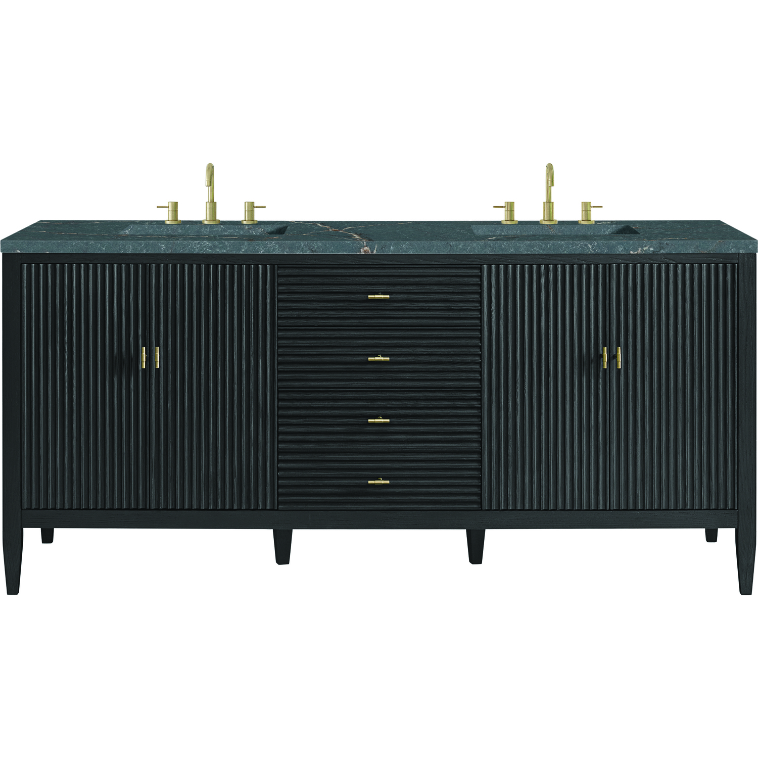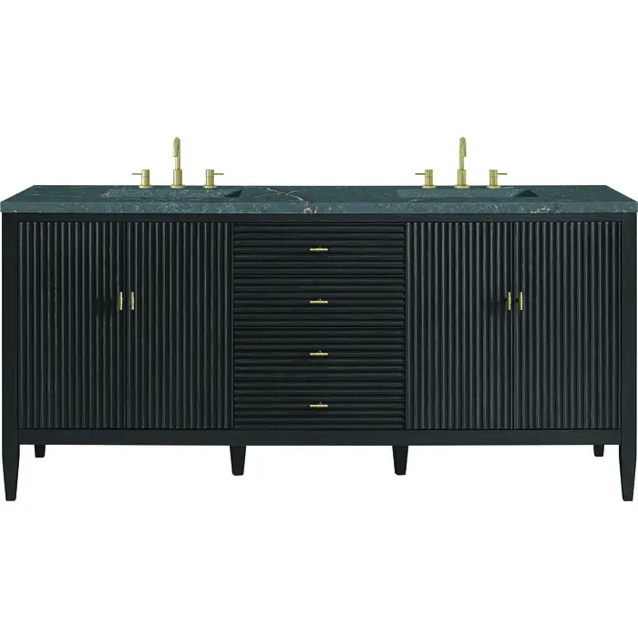Featuring fluted detailing and a sleek silhouette, the Myrrin 72” Double Vanity brings Mid-Century charm and modern utility to your bathroom. Finished in a rich Carbon Oak and complemented by Champagne Brass T-shaped knobs, Myrrin offers generous storage. The two double-door cabinets each open to reveal a spacious interior with a single shelf and a convenient USB/120V power unit for everyday convenience, with three full-extension drawers (one double-deep) lending additional storage. The finish and hardware accents are enhanced by the Parisien Blue Silestone® top, offering a deep bluish hue with broad and intricate neutral veins highlighted by fine coppery accents. This unit is enabled with FreePower wireless charging; featuring a two-device charger seamlessly embedded into the countertop, indicated by a light-up halo in between the sinks. Designed for modern living, FreePower offers convenient, integrated, wireless charging when and where you need it.FreePower Wireless Charging; two-device unit in between sinksFour-door cabinet, each set of doors opens to an internal shelf, with three full-extension drawers (one double-deep)Drawer boxes feature English Dovetail joinery with premium, soft-close undermount drawer slides; doors feature soft-close, adjustable door hingesCabinet features a multi-stage premium finish coat to offer UV and moisture resistanceCarbon Oak finish with Champagne Brass T-knobsCountertop is pre-drilled for 8" widespread faucet(s); our 3cm eased edge countertops come with white porcelain rectangular sink(s) that ship separately and include mounting brackets for easy installationIntegrated 120V outlet with USB portsDrawers lined with our signature brushed aluminum laminate for easy cleaningRemovable bamboo drawer organizer includedMatching stone backsplash available as add-on purchaseFreestanding vanityFaucet sold separatelyThe fluted panels and minimalistic silhouette of the Myrrin Collection bring a harmonious blend of classical elegance and contemporary design to any space. The geometric play of the contrasting panels adds visual drama and allows the light to accentuate this dramatic design. Available in three finishes and adorned with T-knobs in Champagne Brass, the Myrrin is the perfect statement piece for any bathroom.1 year warranty against manufacturer's defects. We will repair or replace any defective product, if the product is defective in material or workmanship at our discretion. No warranty is expressed or implied regarding damages resulting from consumer misuse.