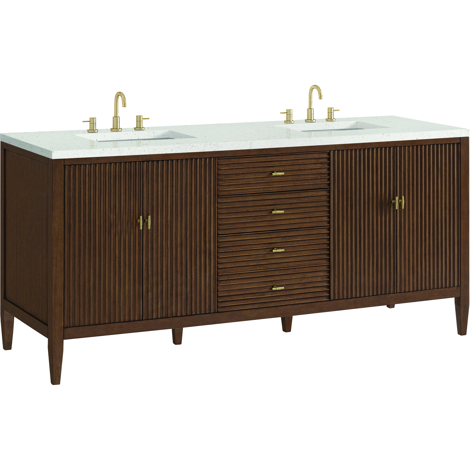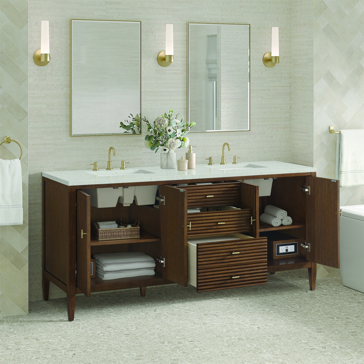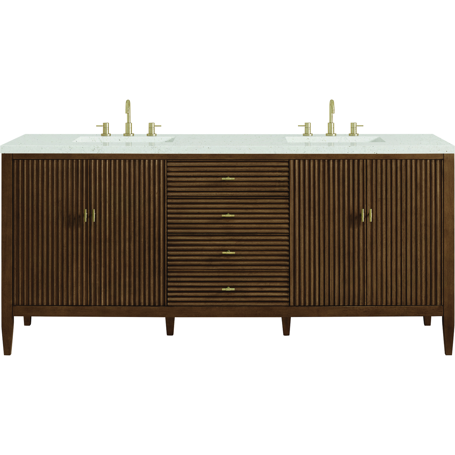 The 72" Myrrin Double Vanity features a minimalistic silhouette with fluted details, resulting in a blend of classical elegance and contemporary design. The deeply fluted panels run perpendicular on the doors and drawers, adding sophistication and visual interest to the design. Toggle-style knobs in Champagne Brass provide a luxe accent to the rich Mid-Century Walnut finish. The four-door cabinet opens to a spacious interior with a single shelf and convenient USB/Electric power outlets. Three drawers lend additional storage. The Lime Delight Silestone top lends warm, textured beige tones to perfectly complement the finish on the vanity. The Lime Delight Silestone top lends warm, textured beige tones to perfectly complement the finish on the vanity.Vanity set includes a 3cm eased edge Limestone Delight Silestone top with two undermount white porcelain rectangular sinks that ship uninstalled and includes mounting brackets for easy installation. Top is pre-drilled for two 8" widespread faucets. FaucetConstructed with a solid wood frame with Walnut veneers over plywood and sealed with our premium moisture and UV resistant finishesTwo 120-volt UL rated electric outlets with USB ports and bamboo organizer includedIncludes four soft-close doors that each pair open to an interior shelf and three full-extension drawers that feature soft-close undermount glides.Toggle style door pulls in Champagne Brass finish.The drawer boxes feature English Dovetail joinery, and our signature brushed aluminum laminate drawer liners for easy cleaning.Includes one removable Bamboo drawer organizer.Cabinets are sealed with a premium finish for superior moisture and UV resistance.The deeply fluted panels of the Myrrin collection, framed in a sleek, minimalistic silhouette, bring an harmonious blend of classical elegance and contemporary design. The geometric play on the contrasting panels not only adds visual interest but also opens to reveal ample storage and organization. Offered in 4 sizes and 3 choices of finishes, each is complemented by Champagne Brass toggle-style knobs for a luxurious finishing touch.1 year warranty against manufacturer's defects. We will repair or replace any defective product, if the product is defective in material or workmanship at our discretion. No warranty is expressed or implied regarding damages resulting from consumer misuse.