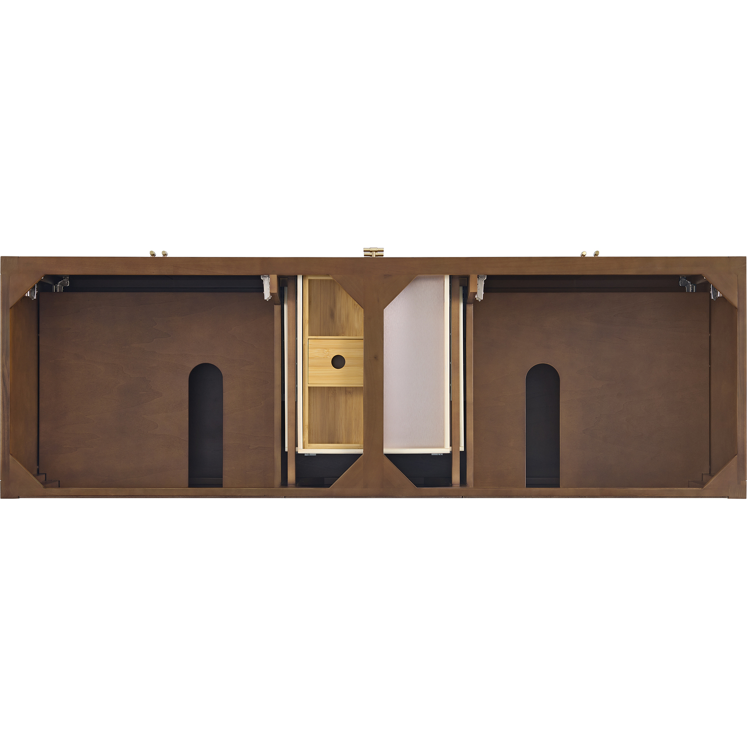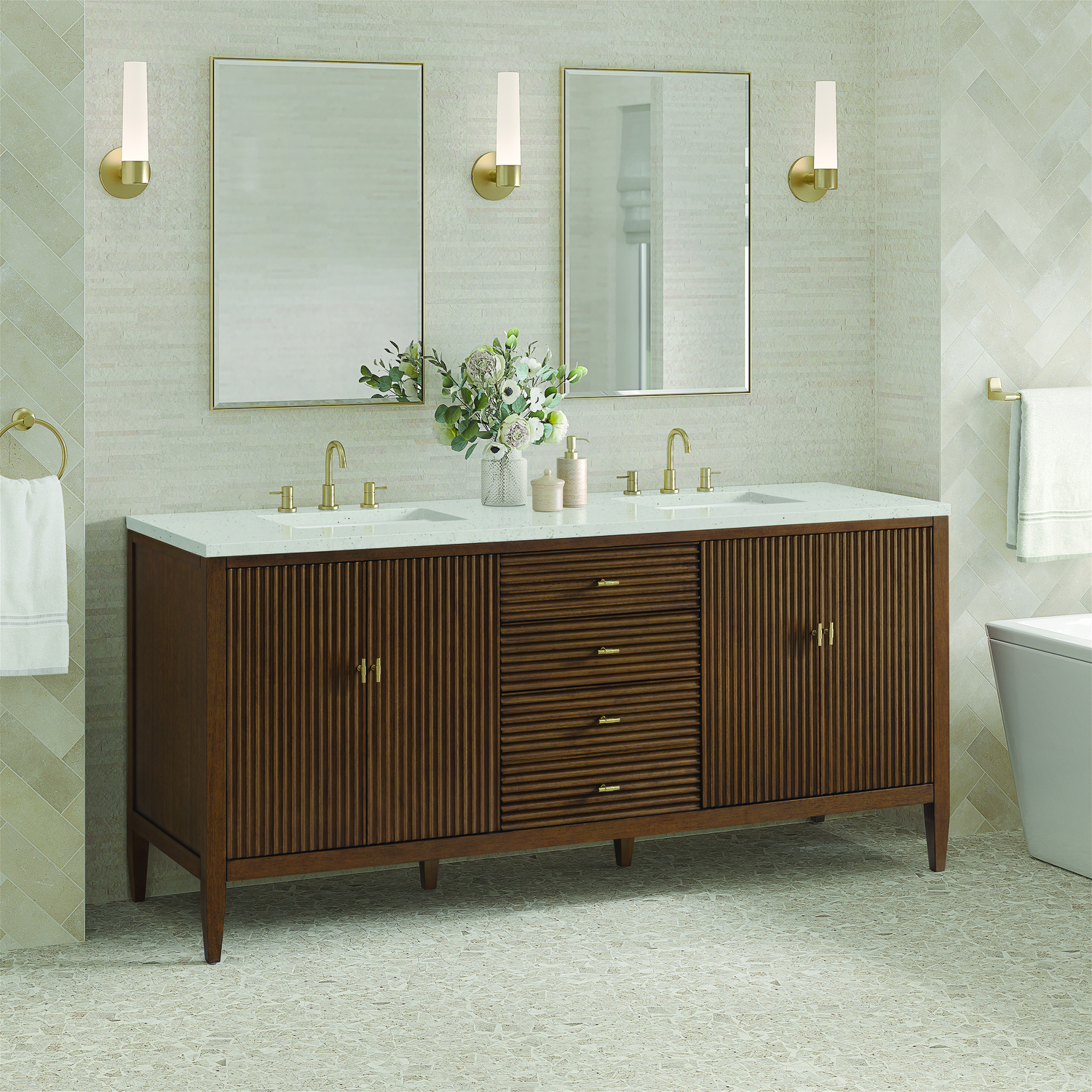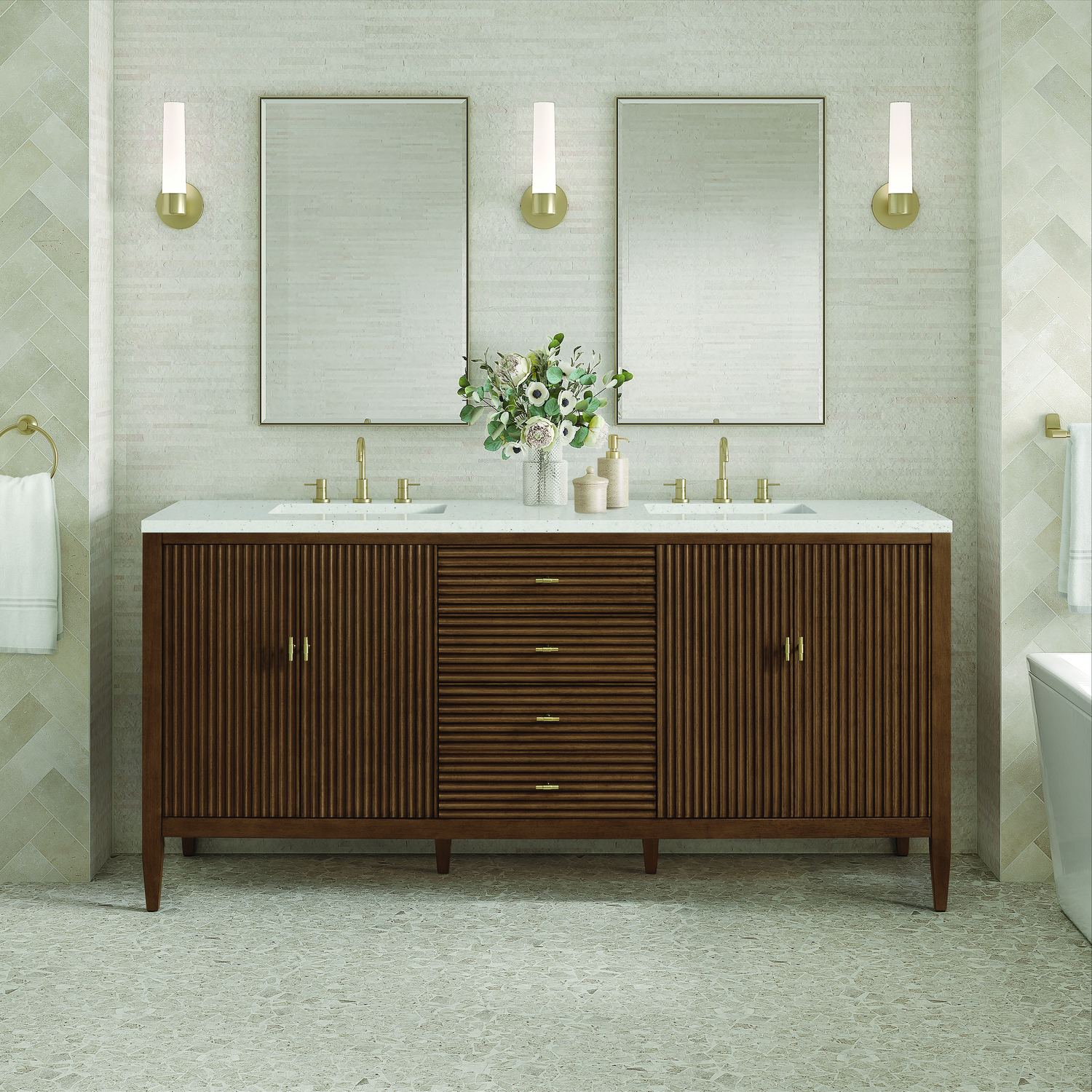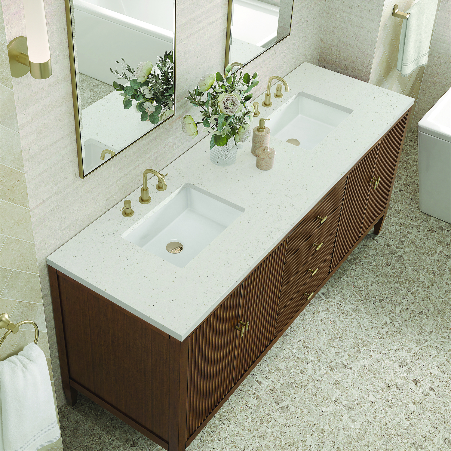 The 72" Myrrin Double Vanity features a minimalistic silhouette with fluted details, resulting in a blend of classical elegance and contemporary design. The deeply fluted panels run perpendicular on the doors and drawers, adding sophistication and visual interest to the design. Toggle-style knobs in Champagne Brass provide a luxe accent to the rich Mid-Century Walnut finish. The four-door cabinet opens to a spacious interior with a single shelf and convenient USB/Electric power outlets. Three drawers lend additional storage. The Lime Delight Silestone top lends warm, textured beige tones to perfectly complement the finish on the vanity. The Lime Delight Silestone top lends warm, textured beige tones to perfectly complement the finish on the vanity.Vanity set includes a 3cm eased edge Limestone Delight Silestone top with two undermount white porcelain rectangular sinks that ship uninstalled and includes mounting brackets for easy installation. Top is pre-drilled for two 8" widespread faucets. FaucetConstructed with a solid wood frame with Walnut veneers over plywood and sealed with our premium moisture and UV resistant finishesTwo 120-volt UL rated electric outlets with USB ports and bamboo organizer includedIncludes four soft-close doors that each pair open to an interior shelf and three full-extension drawers that feature soft-close undermount glides.Toggle style door pulls in Champagne Brass finish.The drawer boxes feature English Dovetail joinery, and our signature brushed aluminum laminate drawer liners for easy cleaning.Includes one removable Bamboo drawer organizer.Cabinets are sealed with a premium finish for superior moisture and UV resistance.The deeply fluted panels of the Myrrin collection, framed in a sleek, minimalistic silhouette, bring an harmonious blend of classical elegance and contemporary design. The geometric play on the contrasting panels not only adds visual interest but also opens to reveal ample storage and organization. Offered in 4 sizes and 3 choices of finishes, each is complemented by Champagne Brass toggle-style knobs for a luxurious finishing touch.1 year warranty against manufacturer's defects. We will repair or replace any defective product, if the product is defective in material or workmanship at our discretion. No warranty is expressed or implied regarding damages resulting from consumer misuse.