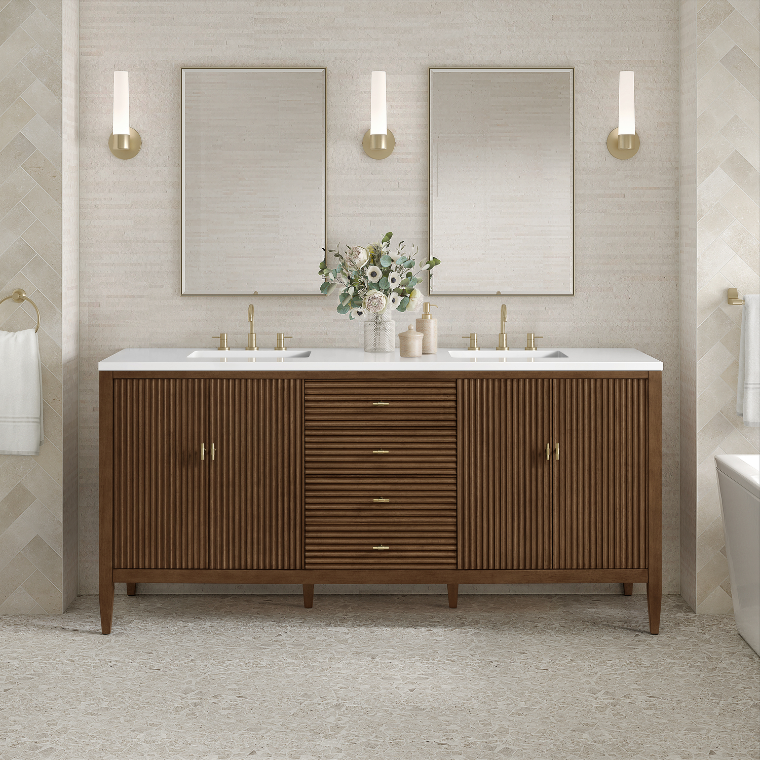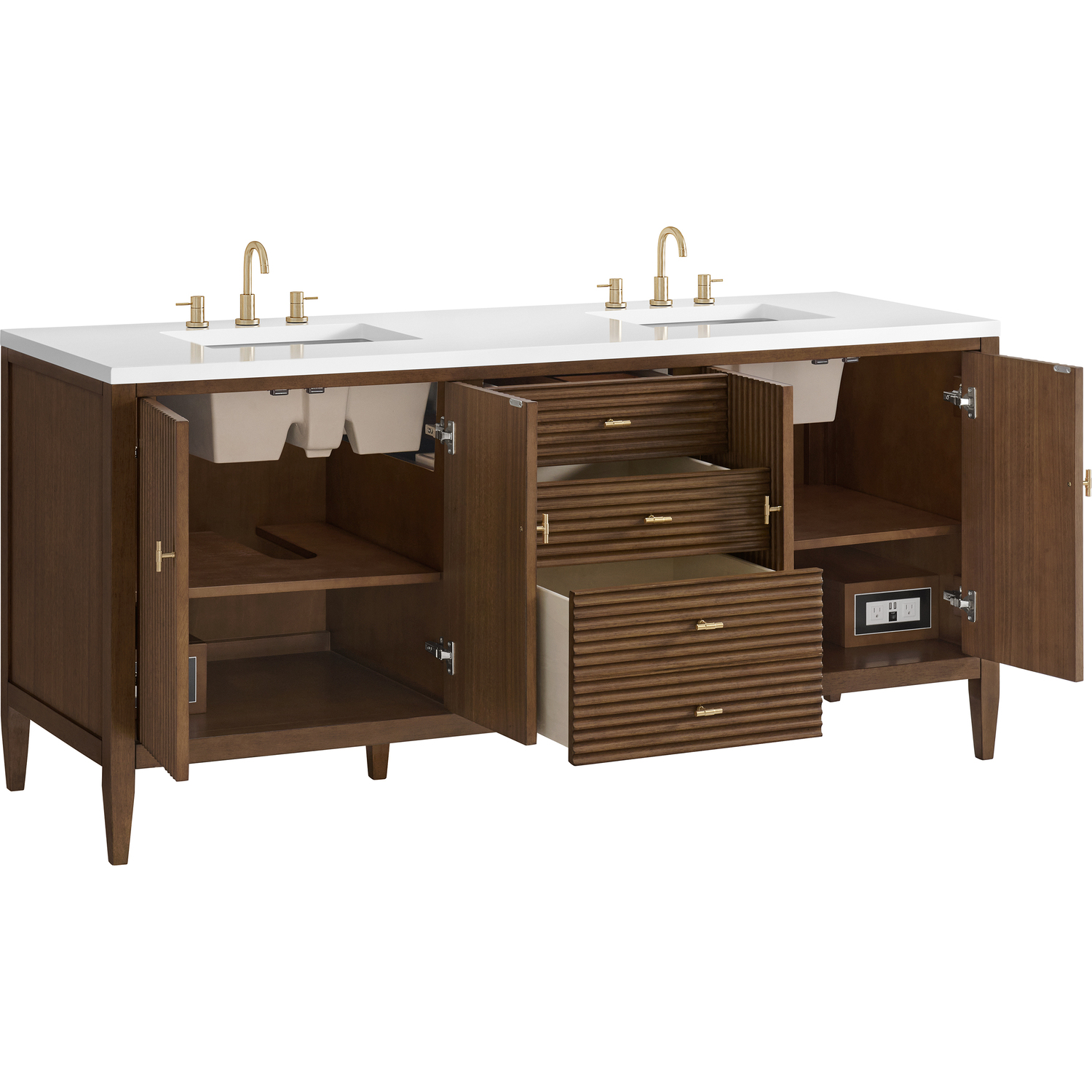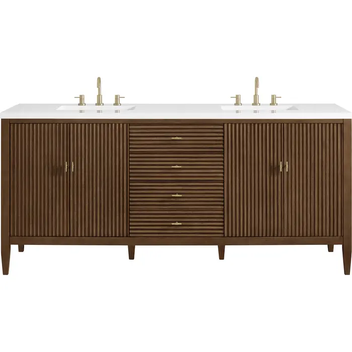 The 72" Myrrin Double Vanity features a minimalistic silhouette with fluted details, resulting in a blend of classical elegance and contemporary design. The deeply fluted panels run perpendicular on the doors and drawers, adding sophistication and visual interest to the design. Toggle-style knobs in Champagne Brass provide a luxe accent to the rich Mid-Century Walnut finish. The four-door cabinet opens to a spacious interior with a single shelf and convenient USB/Electric power outlets. Three drawers lend additional storage. With the addition of a classic White Zeus Silestone top and undermount sink, this vanity is a seamless integration of modern design and functionality.Vanity set includes a 3cm eased edge White Zeus Silestone top, two white porcelain rectangular sinks and mounting brackets for easy installation. Top is pre-drilled for two 8" widespread faucets. Faucets not included.Constructed with a solid wood frame with Walnut veneers over plywood and sealed with our premium moisture and UV resistant finishesTwo 120-volt UL rated electric outlets with USB ports and bamboo organizer includedIncludes four soft-close doors that each pair open to an interior shelf and three full-extension drawers that feature soft-close undermount glides.Toggle style door pulls in Champagne Brass finish.The drawer boxes feature English Dovetail joinery, and our signature brushed aluminum laminate drawer liners for easy cleaning.Includes one removable Bamboo drawer organizer.Cabinets are sealed with a premium finish for superior moisture and UV resistance.The deeply fluted panels of the Myrrin collection, framed in a sleek, minimalistic silhouette, bring an harmonious blend of classical elegance and contemporary design. The geometric play on the contrasting panels not only adds visual interest but also opens to reveal ample storage and organization. Offered in 4 sizes and 3 choices of finishes, each is complemented by Champagne Brass toggle-style knobs for a luxurious finishing touch.1 year warranty against manufacturer's defects. We will repair or replace any defective product, if the product is defective in material or workmanship at our discretion. No warranty is expressed or implied regarding damages resulting from consumer misuse.