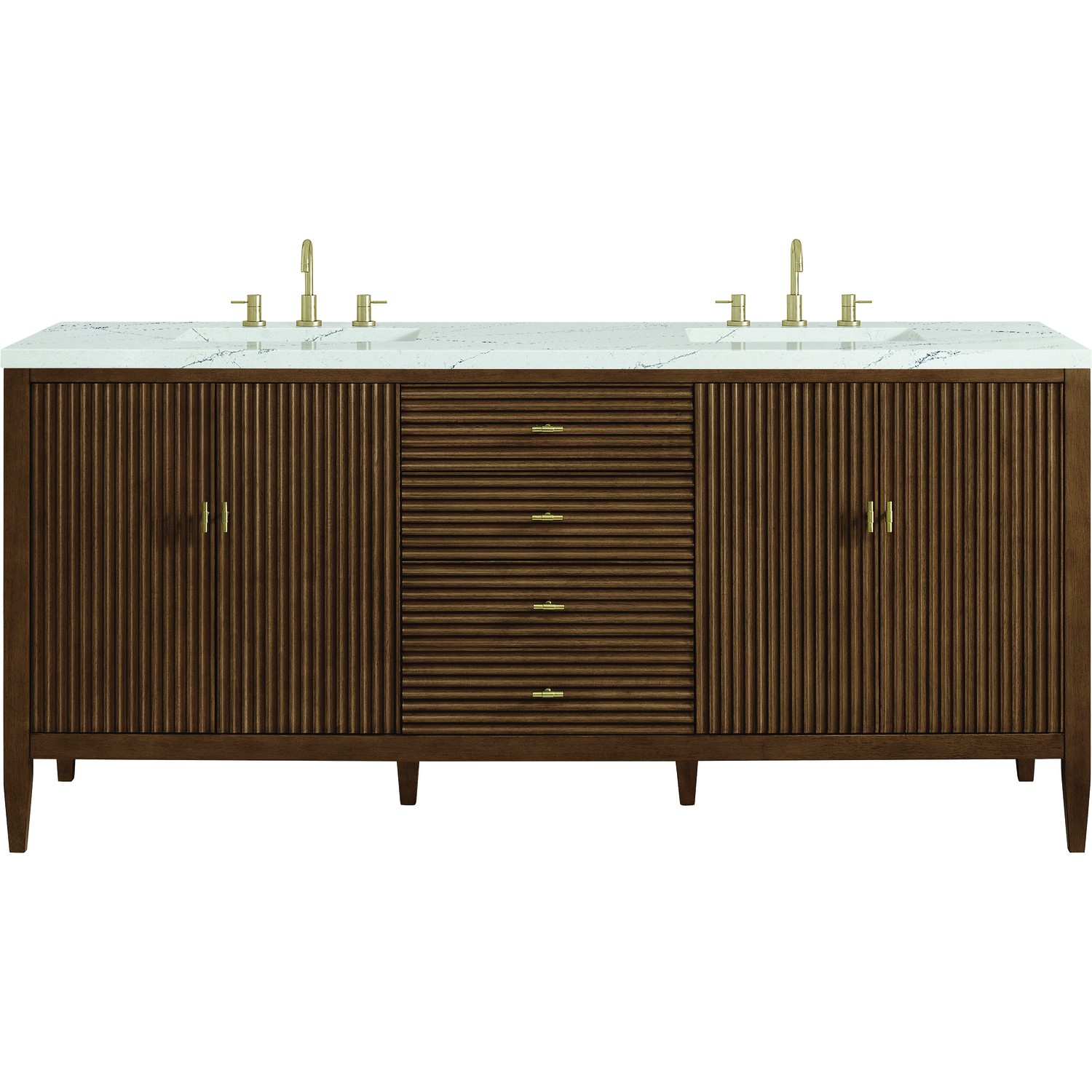 Featuring fluted detailing and a sleek silhouette, the Myrrin 72” Double Vanity brings Mid-Century charm and modern utility to your bathroom. Finished in a rich Mid-Century Walnut and complemented by Champagne Brass T-shaped knobs, Myrrin offers generous storage. The two double-door cabinets each open to reveal a spacious interior with a single shelf and a convenient USB/120V power unit for everyday convenience, with three full-extension drawers (one double-deep) lending additional storage. The finish and hardware accents are enhanced by the modern Ethereal Noctis Silestone® top with dual undermount sinks. This unit is enabled with FreePower wireless charging; featuring a two-device charger seamlessly embedded into the countertop, indicated by a light-up halo in between the sinks. Designed for modern living, FreePower offers convenient, integrated, wireless charging when and where you need it.FreePower Wireless Charging; two-device unit in between sinksFour-door cabinet, each set of doors opens to an internal shelf, with three full-extension drawers (one double-deep)Drawer boxes feature English Dovetail joinery with premium, soft-close undermount drawer slides; doors feature soft-close, adjustable door hingesCabinet features a multi-stage premium finish coat to offer UV and moisture resistanceMid-Century Walnut finish with Champagne Brass T-knobsCountertop is pre-drilled for 8" widespread faucet(s); our 3cm eased edge countertops come with white porcelain rectangular sink(s) that ship separately and include mounting brackets for easy installationIntegrated 120V outlet with USB portsDrawers lined with our signature brushed aluminum laminate for easy cleaningRemovable bamboo drawer organizer includedMatching stone backsplash available as add-on purchaseFreestanding vanityFaucet sold separatelyThe fluted panels and minimalistic silhouette of the Myrrin Collection bring a harmonious blend of classical elegance and contemporary design to any space. The geometric play of the contrasting panels adds visual drama and allows the light to accentuate this dramatic design. Available in three finishes and adorned with T-knobs in Champagne Brass, the Myrrin is the perfect statement piece for any bathroom.1 year warranty against manufacturer's defects. We will repair or replace any defective product, if the product is defective in material or workmanship at our discretion. No warranty is expressed or implied regarding damages resulting from consumer misuse.