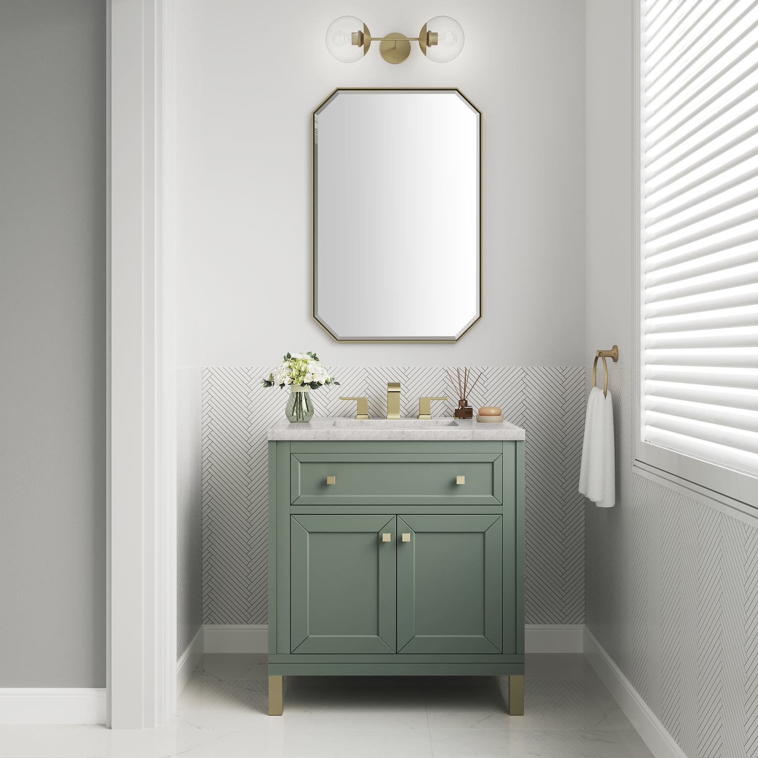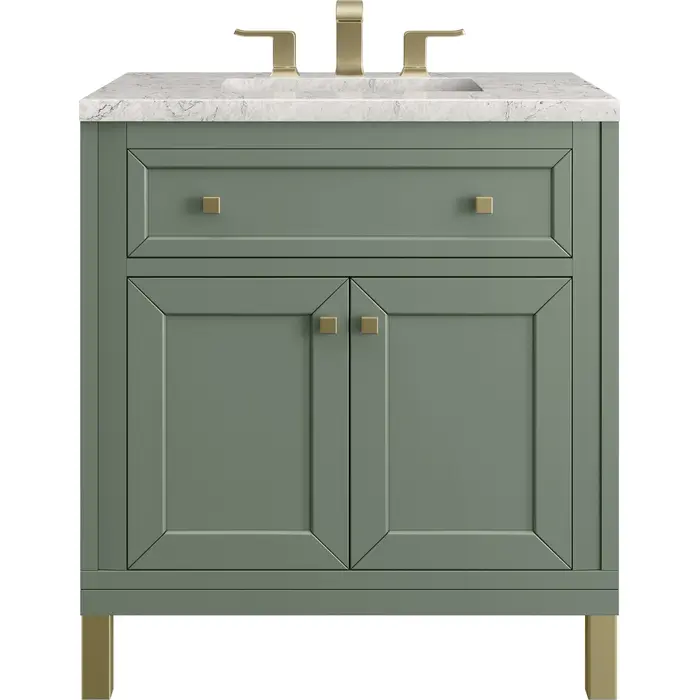 The sophisticated details and clean lines of the Chicago 30" Single Vanity by James Martin Vanities make it the perfect choice for any bathroom. Featuring a Smokey Celadon finish, this vanity offers ample storage with its two-door cabinet, adjustable interior shelf, and top-row tip-out drawer. Champagne Brass knobs and legs add a contemporary touch; or choose to forego the metal legs for a modern wall-mounted installation. The addition of a beautiful Eternal Jasmine Pearl Silestone® top with undermount sink completes the look.Two-door cabinet with adjustable interior shelf and top-row tip-out drawerDoors feature soft-close, adjustable door hingesCabinet features a multi-stage premium finish coat to offer UV and moisture resistanceSmokey Celadon finish with Champagne Brass hardwareCountertop is pre-drilled for an 8" widespread faucet; our 3cm eased edge countertops come with white porcelain rectangular sink(s) that ship separately and include mounting brackets for easy installationCrafted from solid kiln-dried PoplarDual-mounted: can be installed freestanding or floatingFaucet sold separatelyJames Martin Vanities top-selling Chicago Collection is distinctly contemporary, bringing both form and function to your bathroom with clean lines and ample storage. With three available finishes and multiple hardware options, the Chicago collection can be customized to your preferences by choosing to install as a freestanding or floating vanity.1 year warranty against manufacturer's defects. We will repair or replace any defective product, if the product is defective in material or workmanship at our discretion. No warranty is expressed or implied regarding damages resulting from consumer misuse.