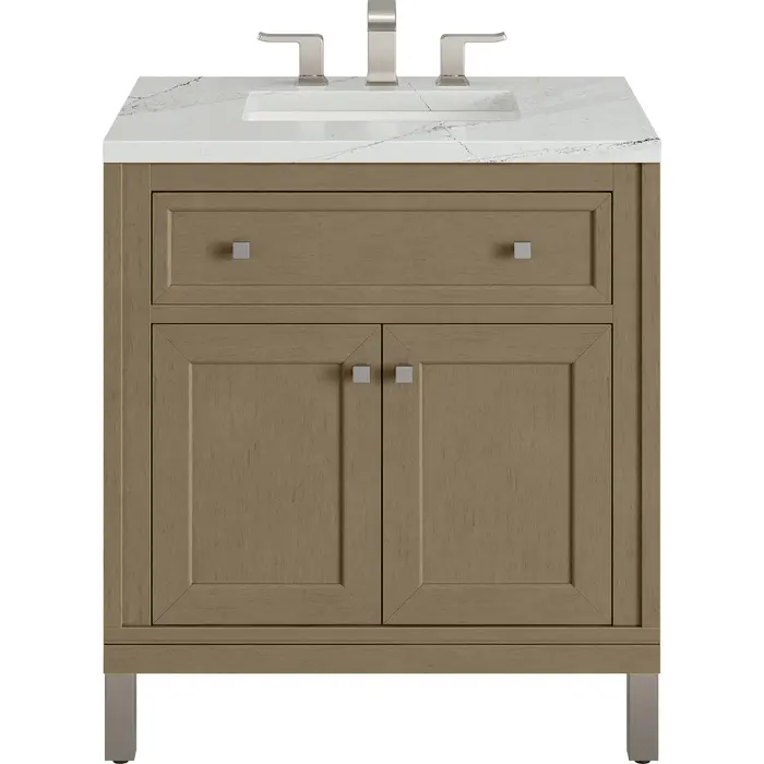 The sophisticated details and clean lines of the Chicago 30" Single Vanity by James Martin Vanities make it the perfect choice for any bathroom. Featuring a Walnut Whisper finish, this vanity offers ample storage with its two-door cabinet, adjustable interior shelf, and top-row tip-out drawer. Brushed Nickel knobs and legs add a contemporary touch; or choose to forego the metal legs for a modern wall-mounted installation. The addition of a stunning Ethereal Noctis Silestone® top with undermount sink completes the look.Two-door cabinet with adjustable interior shelf and top-row tip-out drawerDoors feature soft-close, adjustable door hingesCabinet features a multi-stage premium finish coat to offer UV and moisture resistanceWalnut Whisper finish with Satin Nickel hardwareCountertop is pre-drilled for an 8" widespread faucet; our 3cm eased edge countertops come with white porcelain rectangular sink(s) that ship separately and include mounting brackets for easy installationCrafted from solid kiln-dried PoplarDual-mounted: can be installed freestanding or floatingFaucet sold separatelyJames Martin Vanities top-selling Chicago Collection is distinctly contemporary, bringing both form and function to your bathroom with clean lines and ample storage. With three available finishes and multiple hardware options, the Chicago collection can be customized to your preferences by choosing to install as a freestanding or floating vanity.1 year warranty against manufacturer's defects. We will repair or replace any defective product, if the product is defective in material or workmanship at our discretion. No warranty is expressed or implied regarding damages resulting from consumer misuse.