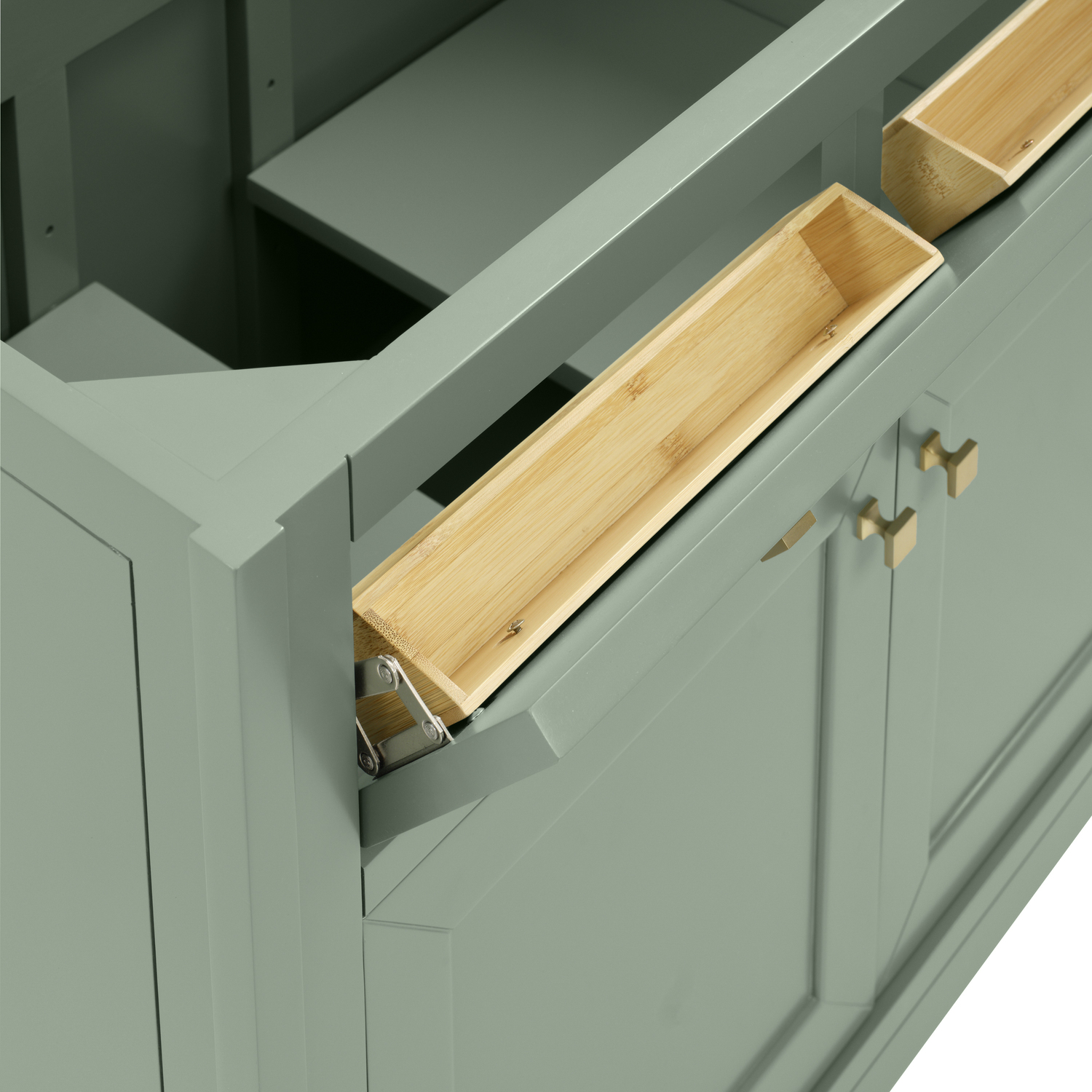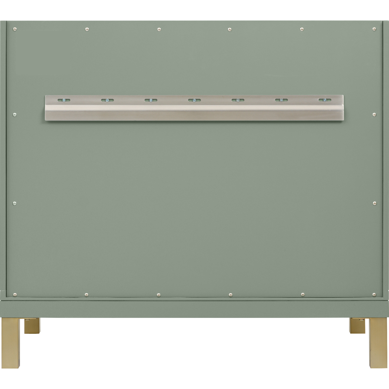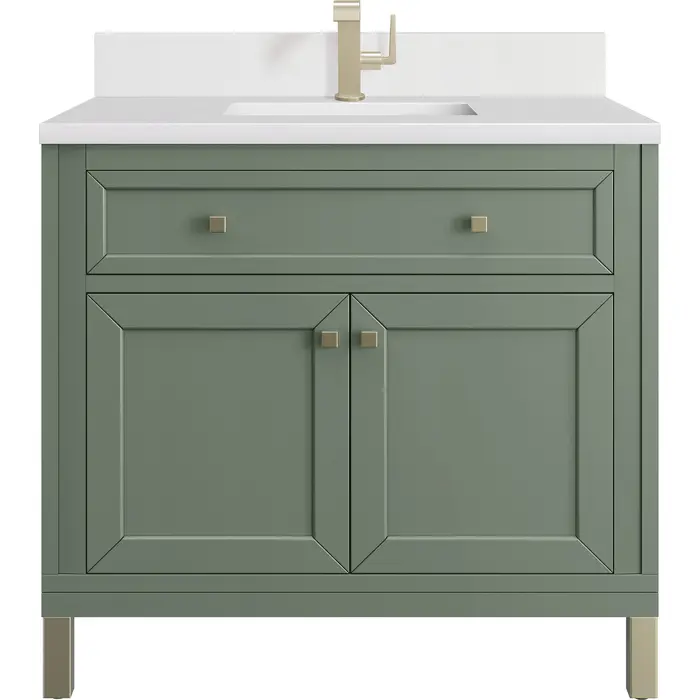 The sophisticated details and clean lines of the Chicago 36" Single Vanity by James Martin Vanities make it the perfect choice for any bathroom. Featuring a Smokey Celadon finish, this vanity offers ample storage with its two-door cabinet, adjustable interior shelf, and top-row tip-out drawer. Champagne Brass knobs and legs add a contemporary touch; or choose to forego the metal legs for a modern wall-mounted installation. A classic White Zeus Silestone® top and backsplash with undermount sink completes the look with a contemporary touch.Two-door cabinet with adjustable interior shelf and top-row tip-out drawerDoors feature soft-close, adjustable door hingesCabinet features a multi-stage premium finish coat to offer UV and moisture resistanceSmokey Celadon finish with Champagne Brass hardwareCountertop is pre-drilled for a single-hole faucet; our 3cm eased edge countertops come with white porcelain rectangular sink(s) that ship separately and include mounting brackets for easy installationCrafted from solid kiln-dried PoplarDual-mounted: can be installed freestanding or floatingFaucet sold separatelyJames Martin Vanities top-selling Chicago Collection is distinctly contemporary, bringing both form and function to your bathroom with clean lines and ample storage. With three available finishes and multiple hardware options, the Chicago collection can be customized to your preferences by choosing to install as a freestanding or floating vanity.1 year warranty against manufacturer's defects. We will repair or replace any defective product, if the product is defective in material or workmanship at our discretion. No warranty is expressed or implied regarding damages resulting from consumer misuse.