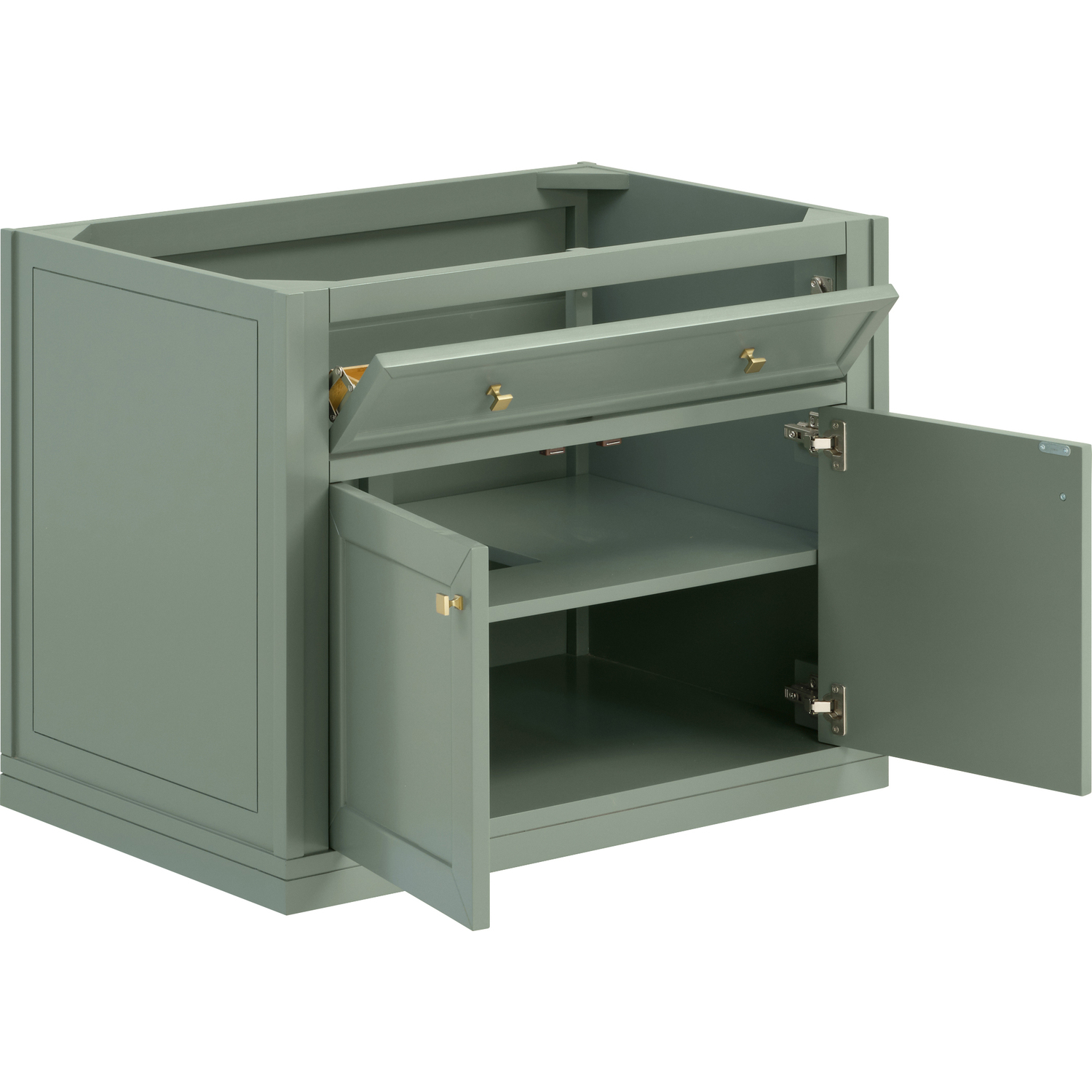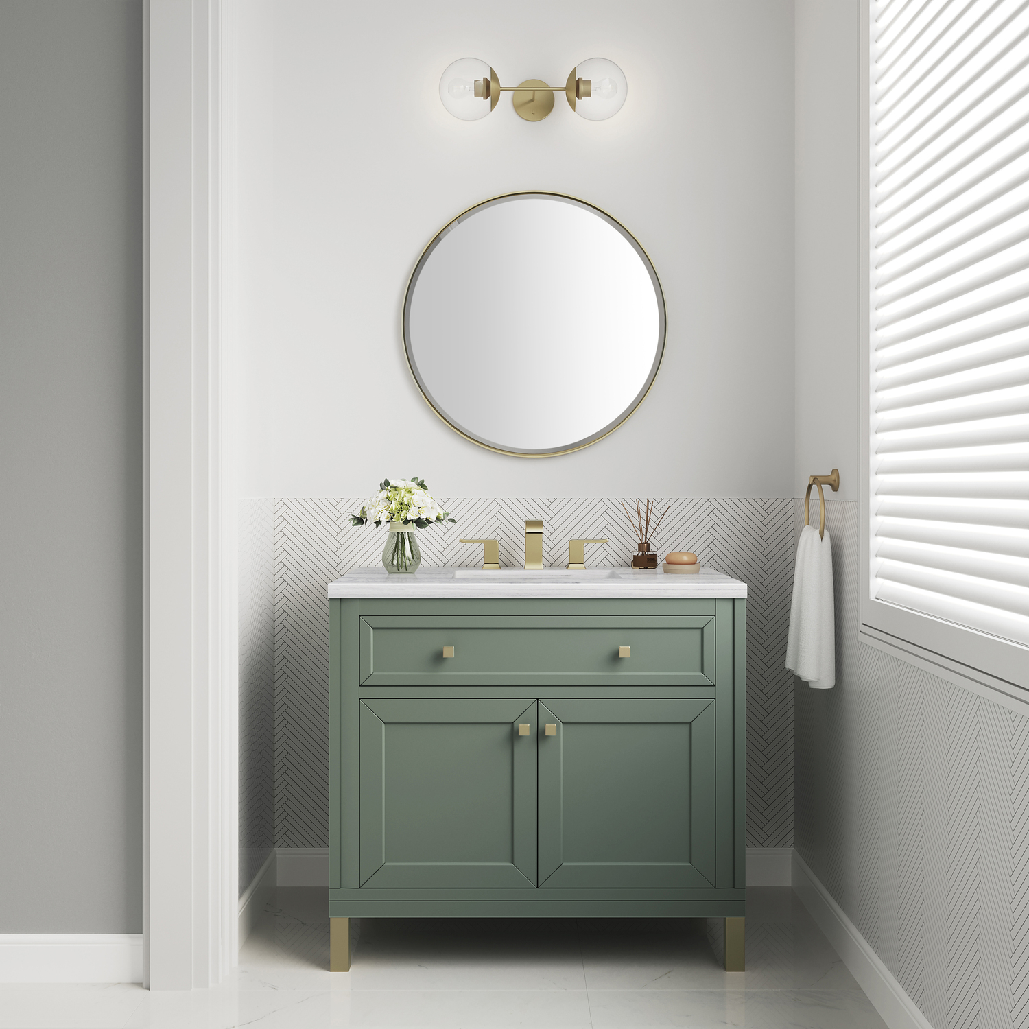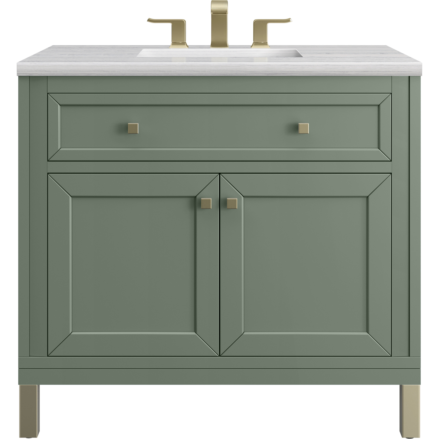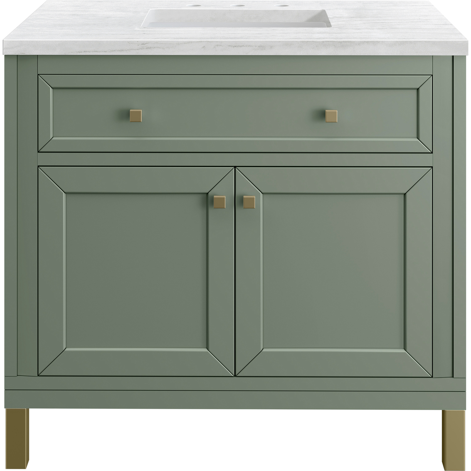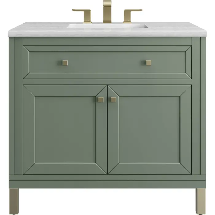 The sophisticated details and clean lines of the Chicago 36" Single Vanity by James Martin Vanities make it the perfect choice for any bathroom. Featuring a Smokey Celadon finish, this vanity offers ample storage with its two-door cabinet, adjustable interior shelf, and top-row tip-out drawer. Champagne Brass knobs and legs add a contemporary touch; or choose to forego the metal legs for a modern wall-mounted installation. The addition of a modern Arctic Fall Solid Surface top with undermount sink completes the look.Two-door cabinet with adjustable interior shelf and top-row tip-out drawerDoors feature soft-close, adjustable door hingesCabinet features a multi-stage premium finish coat to offer UV and moisture resistanceSmokey Celadon finish with Champagne Brass hardwareCountertop is pre-drilled for an 8" widespread faucet; our 3cm eased edge countertops come with white porcelain rectangular sink(s) that ship separately and include mounting brackets for easy installationCrafted from solid kiln-dried PoplarDual-mounted: can be installed freestanding or floatingFaucet sold separatelyJames Martin Vanities top-selling Chicago Collection is distinctly contemporary, bringing both form and function to your bathroom with clean lines and ample storage. With three available finishes and multiple hardware options, the Chicago collection can be customized to your preferences by choosing to install as a freestanding or floating vanity.1 year warranty against manufacturer's defects. We will repair or replace any defective product, if the product is defective in material or workmanship at our discretion. No warranty is expressed or implied regarding damages resulting from consumer misuse.
