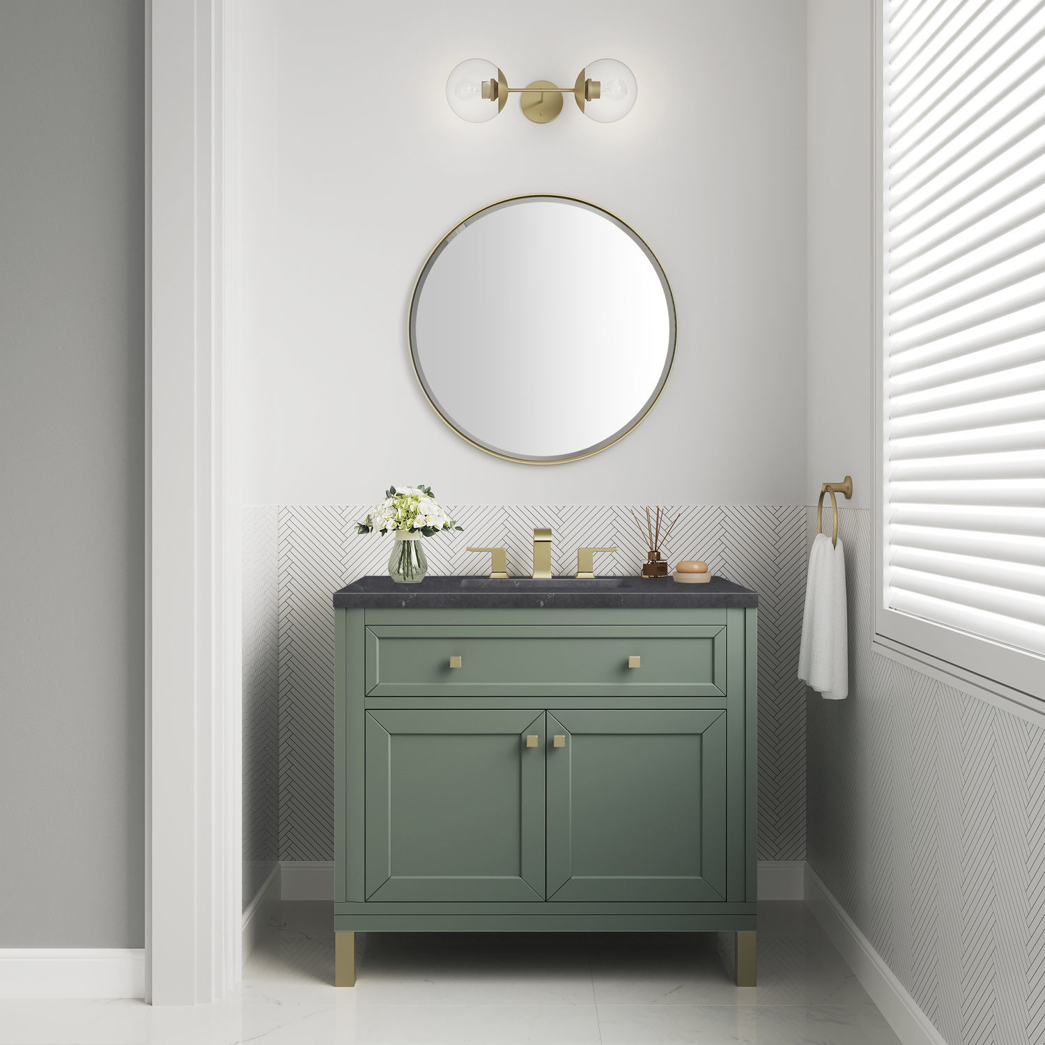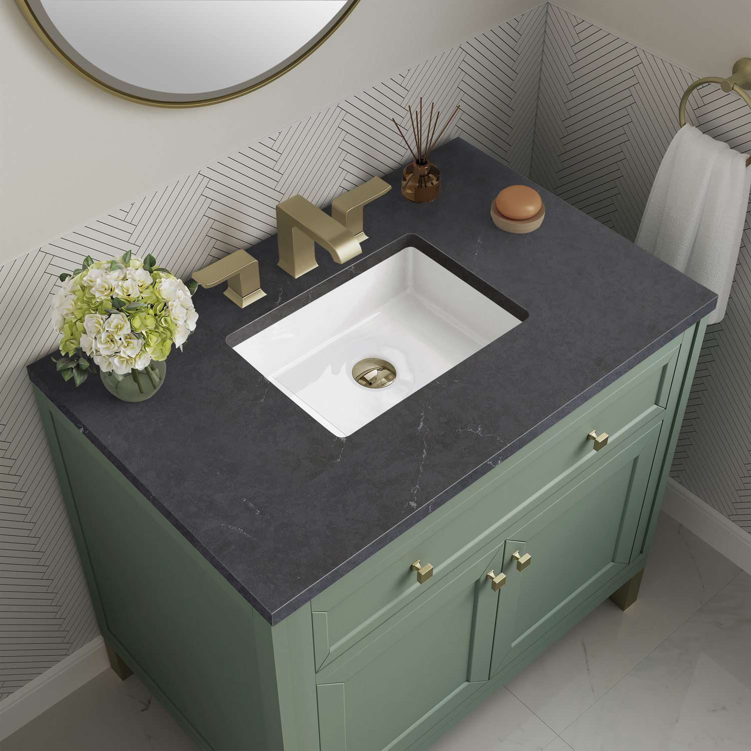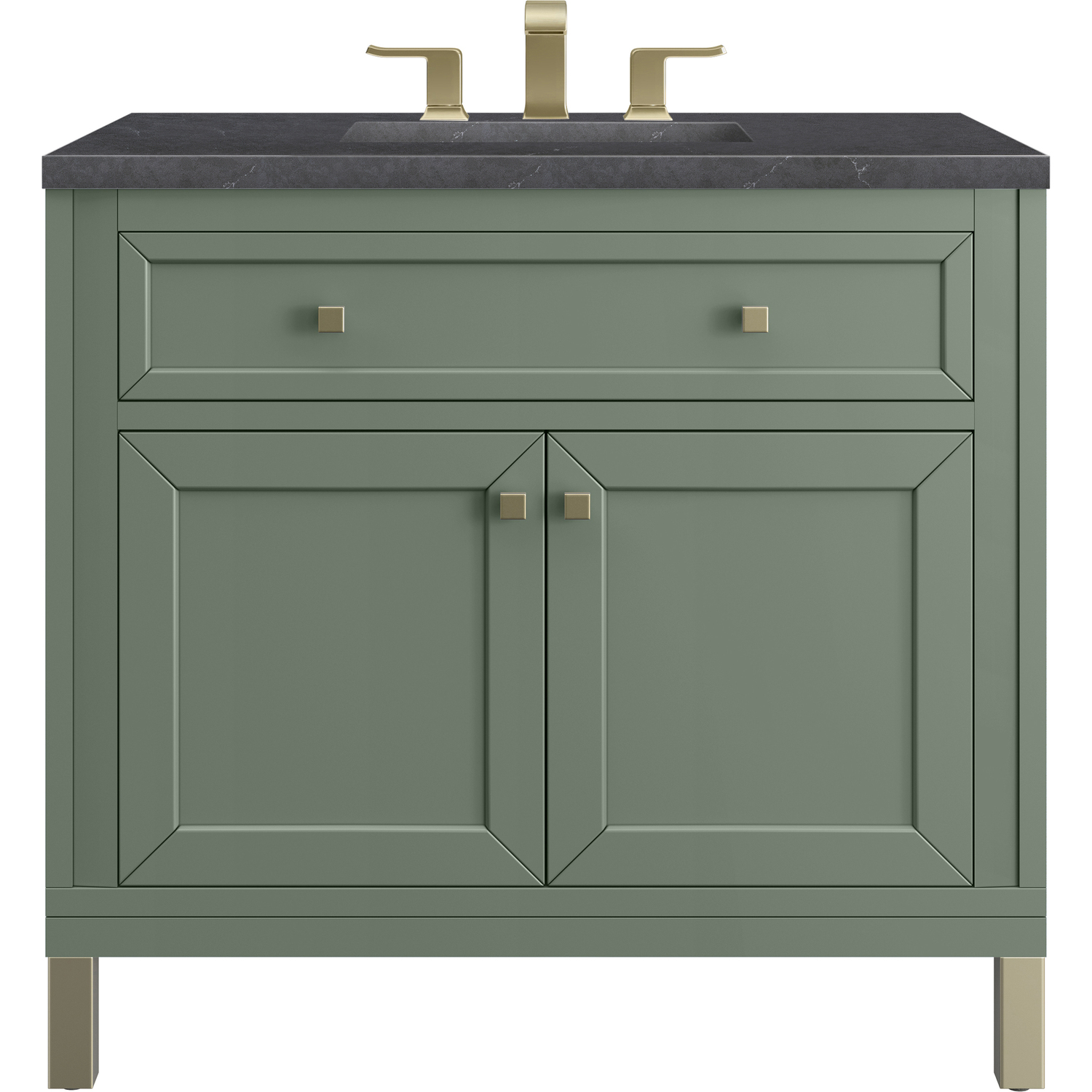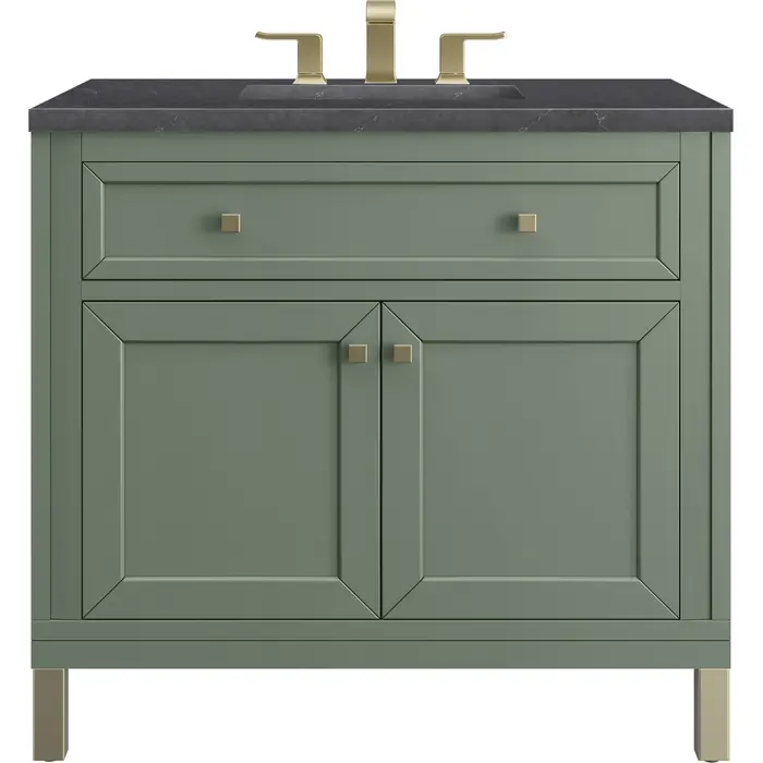 The sophisticated details and clean lines of the Chicago 36" Single Vanity by James Martin Vanities make it the perfect choice for any bathroom. Featuring a Smokey Celadon finish, this vanity offers ample storage with its two-door cabinet, adjustable interior shelf, and top-row tip-out drawer. Champagne Brass knobs and legs add a contemporary touch; or choose to forego the metal legs for a modern wall-mounted installation. The addition of a matte Charcoal Soapstone Silestone® top with undermount sink completes the look.Two-door cabinet with adjustable interior shelf and top-row tip-out drawerDoors feature soft-close, adjustable door hingesCabinet features a multi-stage premium finish coat to offer UV and moisture resistanceSmokey Celadon finish with Champagne Brass hardwareCountertop is pre-drilled for an 8" widespread faucet; our 3cm eased edge countertops come with white porcelain rectangular sink(s) that ship separately and include mounting brackets for easy installationCrafted from solid kiln-dried PoplarDual-mounted: can be installed freestanding or floatingFaucet sold separatelyJames Martin Vanities top-selling Chicago Collection is distinctly contemporary, bringing both form and function to your bathroom with clean lines and ample storage. With three available finishes and multiple hardware options, the Chicago collection can be customized to your preferences by choosing to install as a freestanding or floating vanity.1 year warranty against manufacturer's defects. We will repair or replace any defective product, if the product is defective in material or workmanship at our discretion. No warranty is expressed or implied regarding damages resulting from consumer misuse.