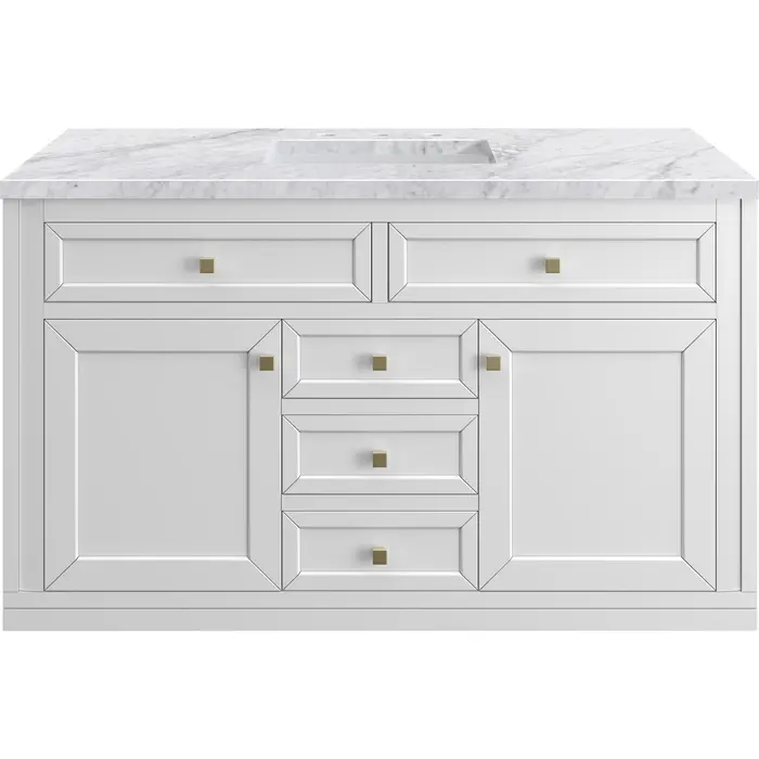 The sophisticated details and clean lines of the Chicago 48" Single Vanity by James Martin Vanities make it the perfect choice for any bathroom. Featuring a Glossy White finish, this vanity offers ample storage with its two single-door cabinets, adjustable interior shelves, and four drawers (three standard; one double-deep). Champagne Brass knobs and legs add a contemporary touch; or choose to forego the metal legs for a modern wall-mounted installation. The addition of a Carrara White Marble top with undermount sink completes the look.Two single-door cabinets with adjustable interior shelves; four drawers (three standard drawers and one double-deep drawer on bottom row)Drawer boxes feature English Dovetail joinery with premium, soft-close undermount drawer slides; doors feature soft-close, adjustable door hingesCabinet features a multi-stage premium finish coat to offer UV and moisture resistanceGlossy White finish with Champagne Brass hardwareCountertop is pre-drilled for an 8" widespread faucet; our 3cm eased edge countertops come with white porcelain rectangular sink(s) that ship separately and include mounting brackets for easy installationCrafted from solid kiln-dried PoplarDrawers lined with our signature brushed aluminum laminate for easy cleaningDual-mounted: can be installed freestanding or floatingFaucet sold separatelyJames Martin Vanities top-selling Chicago Collection is distinctly contemporary, bringing both form and function to your bathroom with clean lines and ample storage. With three available finishes and multiple hardware options, the Chicago collection can be customized to your preferences by choosing to install as a freestanding or floating vanity.1 year warranty against manufacturer's defects. We will repair or replace any defective product, if the product is defective in material or workmanship at our discretion. No warranty is expressed or implied regarding damages resulting from consumer misuse.