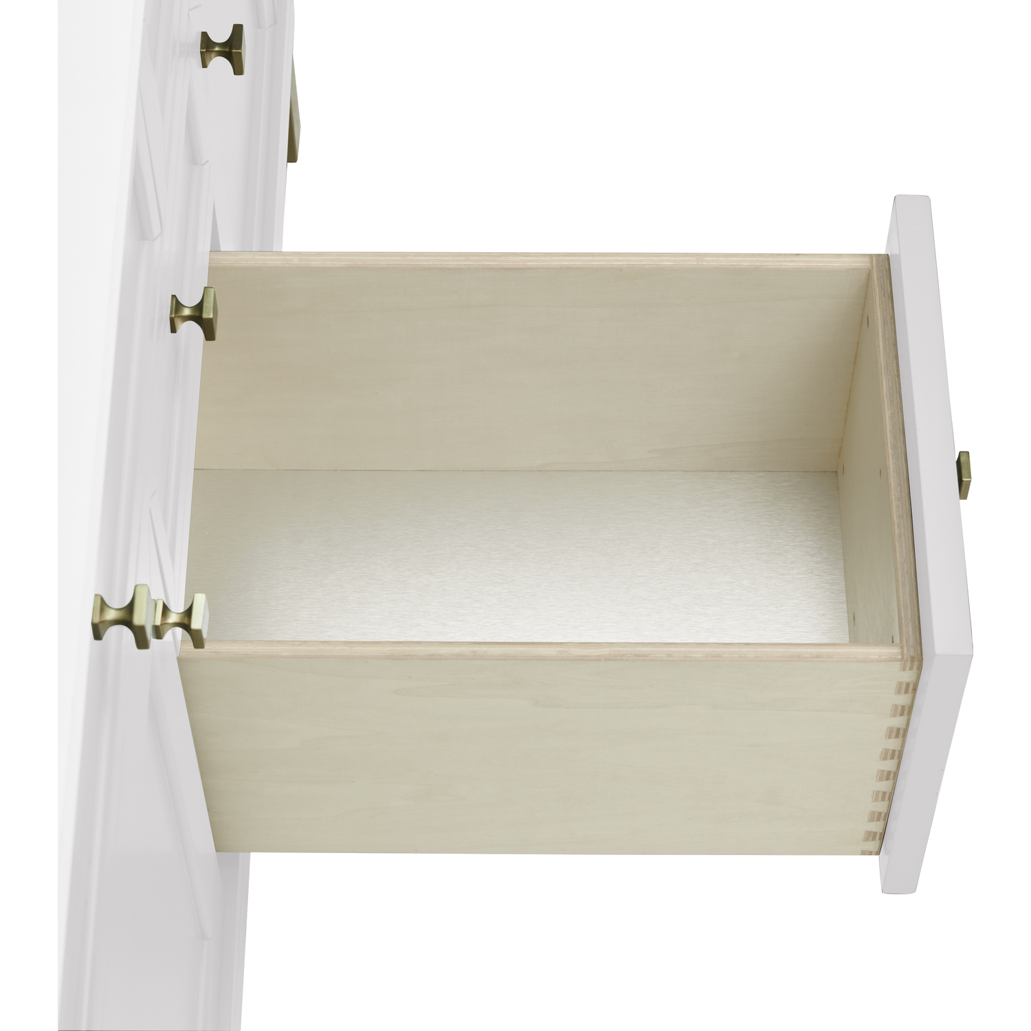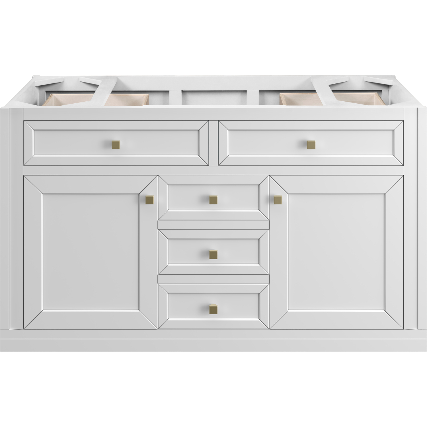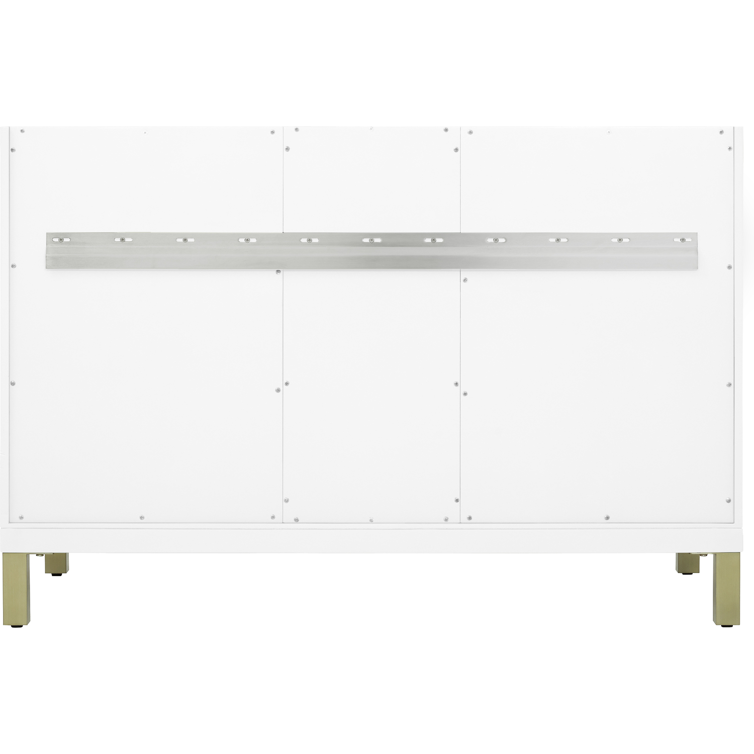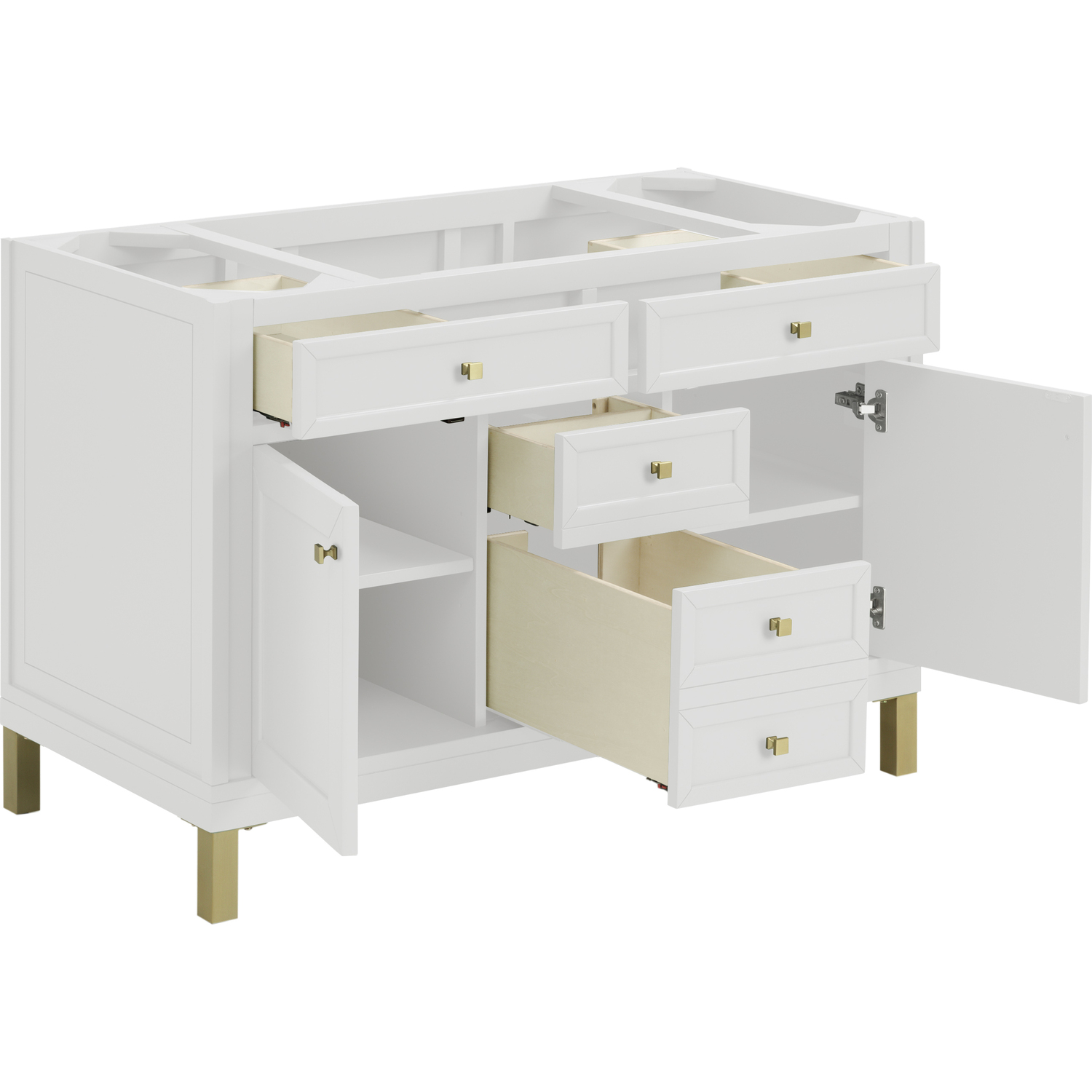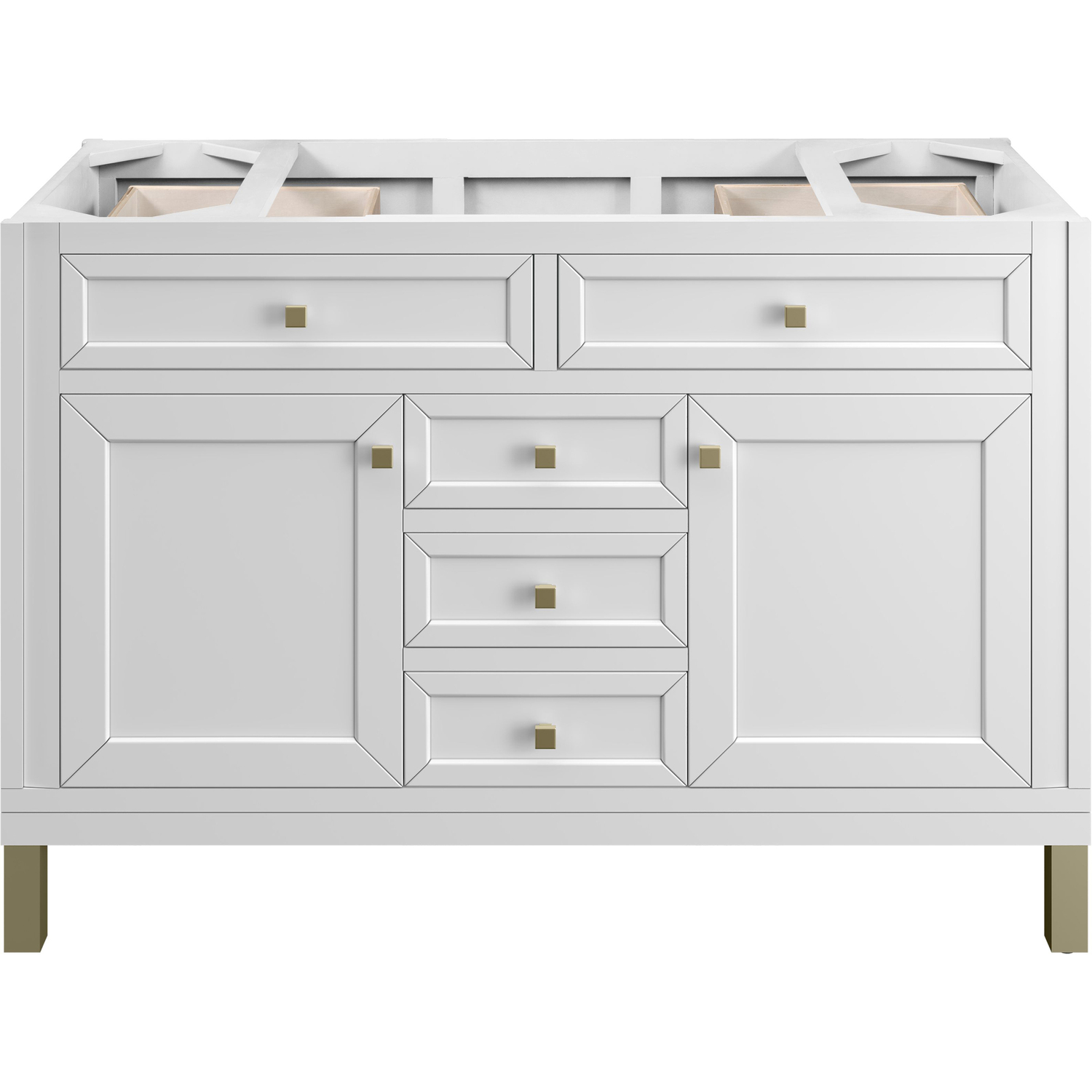 The sophisticated details and clean lines of the Chicago 48" Single Vanity by James Martin Vanities make it the perfect choice for any bathroom. Featuring a Glossy White finish, this vanity offers ample storage with its two single-door cabinets, adjustable interior shelves, and four drawers (three standard; one double-deep). Champagne Brass knobs and legs add a contemporary touch; or choose to forego the metal legs for a modern wall-mounted installation. Complete the look with one of our 3 cm tops.Two single-door cabinets with adjustable interior shelves; four drawers (three standard drawers and one double-deep drawer on bottom row)Drawer boxes feature English Dovetail joinery with premium, soft-close undermount drawer slides; doors feature soft-close, adjustable door hingesCabinet features a multi-stage premium finish coat to offer UV and moisture resistanceGlossy White finish with Champagne Brass hardwareCabinet only; select one of our countertops to complete the vanityCrafted from solid kiln-dried PoplarDrawers lined with our signature brushed aluminum laminate for easy cleaningDual-mounted: can be installed freestanding or floatingFaucet sold separatelyJames Martin Vanities top-selling Chicago Collection is distinctly contemporary, bringing both form and function to your bathroom with clean lines and ample storage. With three available finishes and multiple hardware options, the Chicago collection can be customized to your preferences by choosing to install as a freestanding or floating vanity.1 year warranty against manufacturer's defects. We will repair or replace any defective product, if the product is defective in material or workmanship at our discretion. No warranty is expressed or implied regarding damages resulting from consumer misuse.