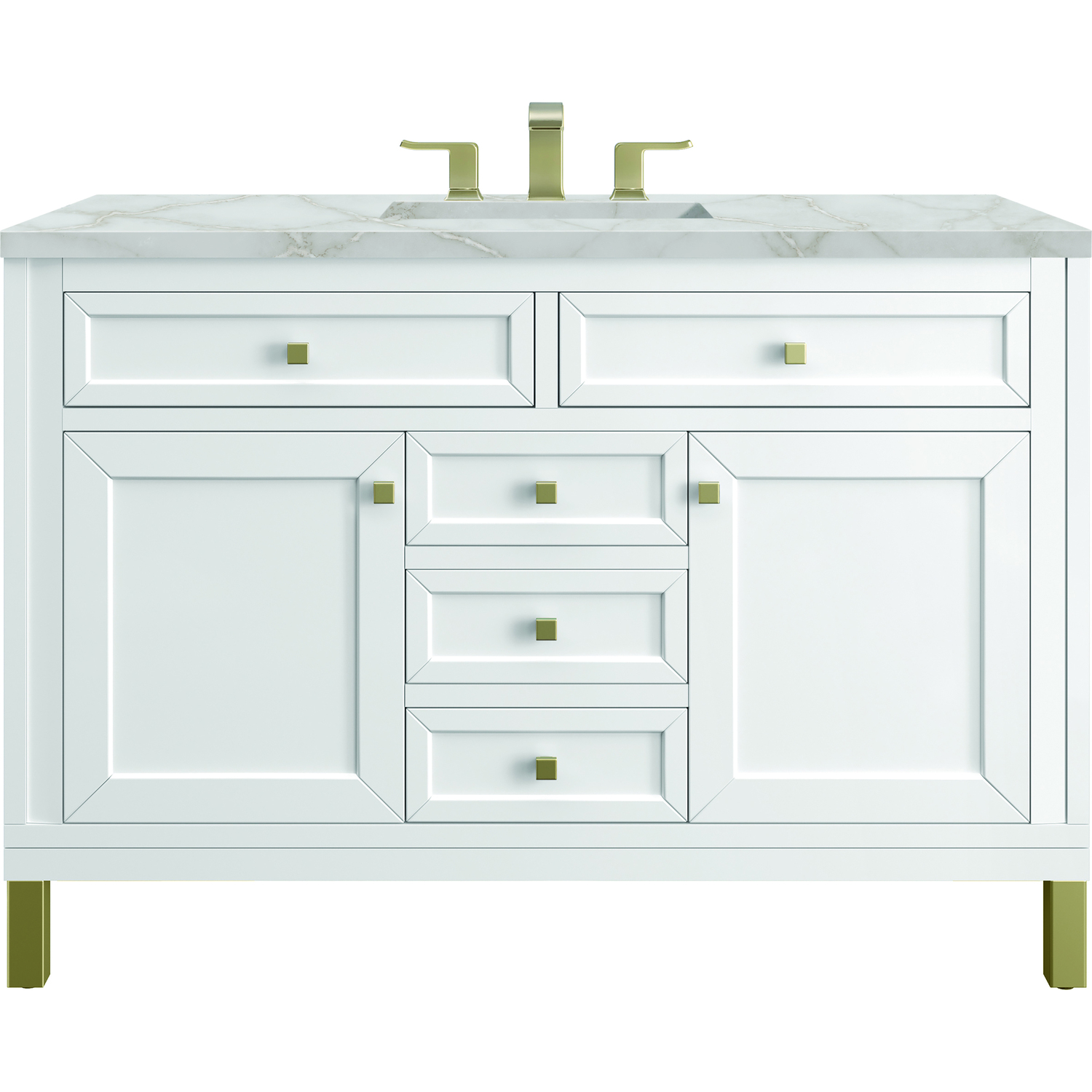 The sophisticated details and clean lines of the Chicago 48" Single Vanity by James Martin Vanities make it the perfect choice for any bathroom. Featuring a Glossy White finish, this vanity offers ample storage with its two single-door cabinets, adjustable interior shelves, and four drawers (three standard; one double-deep). Champagne Brass knobs and legs add a contemporary touch; or choose to forego the metal legs for a modern wall-mounted installation. The addition of a beautiful Victorian Silver Silestone® top with undermount sink completes the look. This unit is enabled with FreePower wireless charging; featuring a single-device charger seamlessly embedded into the countertop, indicated by a light-up halo to the left of the sink. Designed for modern living, FreePower offers convenient, integrated, wireless charging when and where you need it.FreePower Wireless Charging; single-device unit left of sinkTwo-door cabinet with four full-extension drawers (one double-deep)Drawer boxes feature English Dovetail joinery with premium, soft-close undermount drawer slides; doors feature soft-close, adjustable door hingesCabinet features a multi-stage premium finish coat to offer UV and moisture resistanceGlossy White finish with Champagne Brass hardwareCountertop is pre-drilled for 8" widespread faucet(s); our 3cm eased edge countertops come with white porcelain rectangular sink(s) that ship separately and include mounting brackets for easy installationFaucet sold separatelyDrawers lined with our signature brushed aluminum laminate for easy cleaningDual-mounted: can be installed freestanding or floating with included French Cleat hardwareFaucet sold separatelyMatching stone backsplash available as add-on purchaseThe Chicago Collection is distinctly contemporary, bringing both form and function to your bathroom with clean lines and ample storage. With three available finishes and multiple hardware options, the Chicago collection can be customized to your preferences by choosing to install as a freestanding or floating vanity.1 year warranty against manufacturer's defects. We will repair or replace any defective product, if the product is defective in material or workmanship at our discretion. No warranty is expressed or implied regarding damages resulting from consumer misuse.