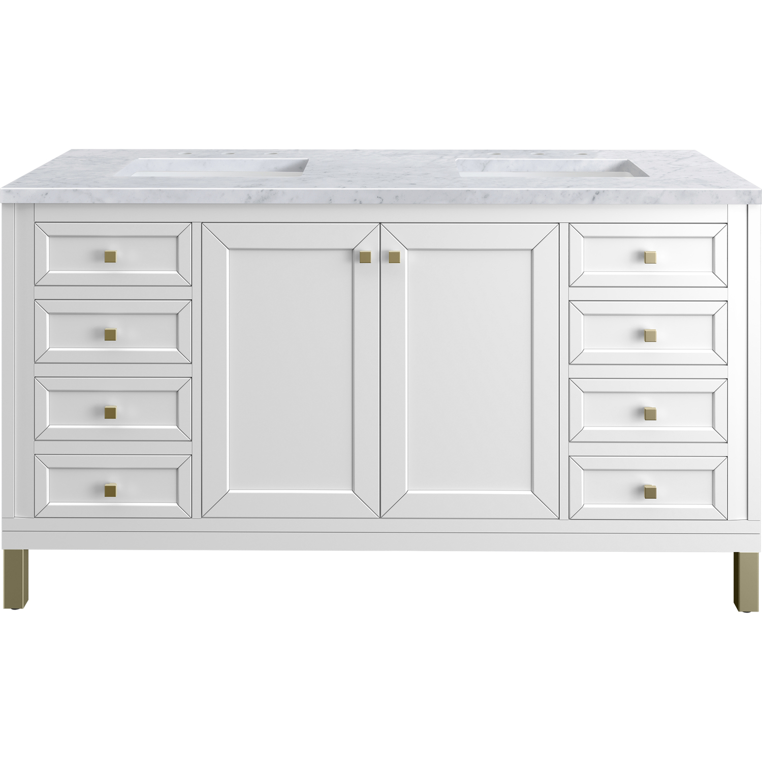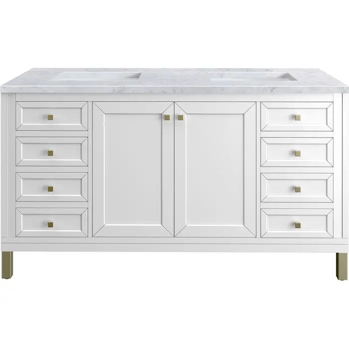 The sophisticated details and clean lines of the Chicago 60" Double Vanity by James Martin Vanities make it the perfect choice for any bathroom. Featuring a Glossy White finish, this vanity offers ample storage with its double-door cabinets, adjustable interior shelves, and six drawers (two tip-outs, two standard, two double-deep). Champagne Brass knobs and legs add a contemporary touch; or choose to forego the metal legs for a modern wall-mounted installation. The addition of a Carrara White Marble top with undermount sinks completes the look.Double-door cabinet with adjustable interior shelf; six drawers (two top-row tip-outs, two standard, and two double-deep drawers on bottom row)Drawer boxes feature English Dovetail joinery with premium, soft-close undermount drawer slides; doors feature soft-close, adjustable door hingesCabinet features a multi-stage premium finish coat to offer UV and moisture resistanceGlossy White finish with Champagne Brass hardwareCountertop is pre-drilled for an 8" widespread faucet; our 3cm eased edge countertops come with white porcelain rectangular sink(s) that ship separately and include mounting brackets for easy installationCrafted from solid kiln-dried PoplarDrawers lined with our signature brushed aluminum laminate for easy cleaningDual-mounted: can be installed freestanding or floatingFaucet sold separatelyJames Martin Vanities top-selling Chicago Collection is distinctly contemporary, bringing both form and function to your bathroom with clean lines and ample storage. With three available finishes and multiple hardware options, the Chicago collection can be customized to your preferences by choosing to install as a freestanding or floating vanity.1 year warranty against manufacturer's defects. We will repair or replace any defective product, if the product is defective in material or workmanship at our discretion. No warranty is expressed or implied regarding damages resulting from consumer misuse.