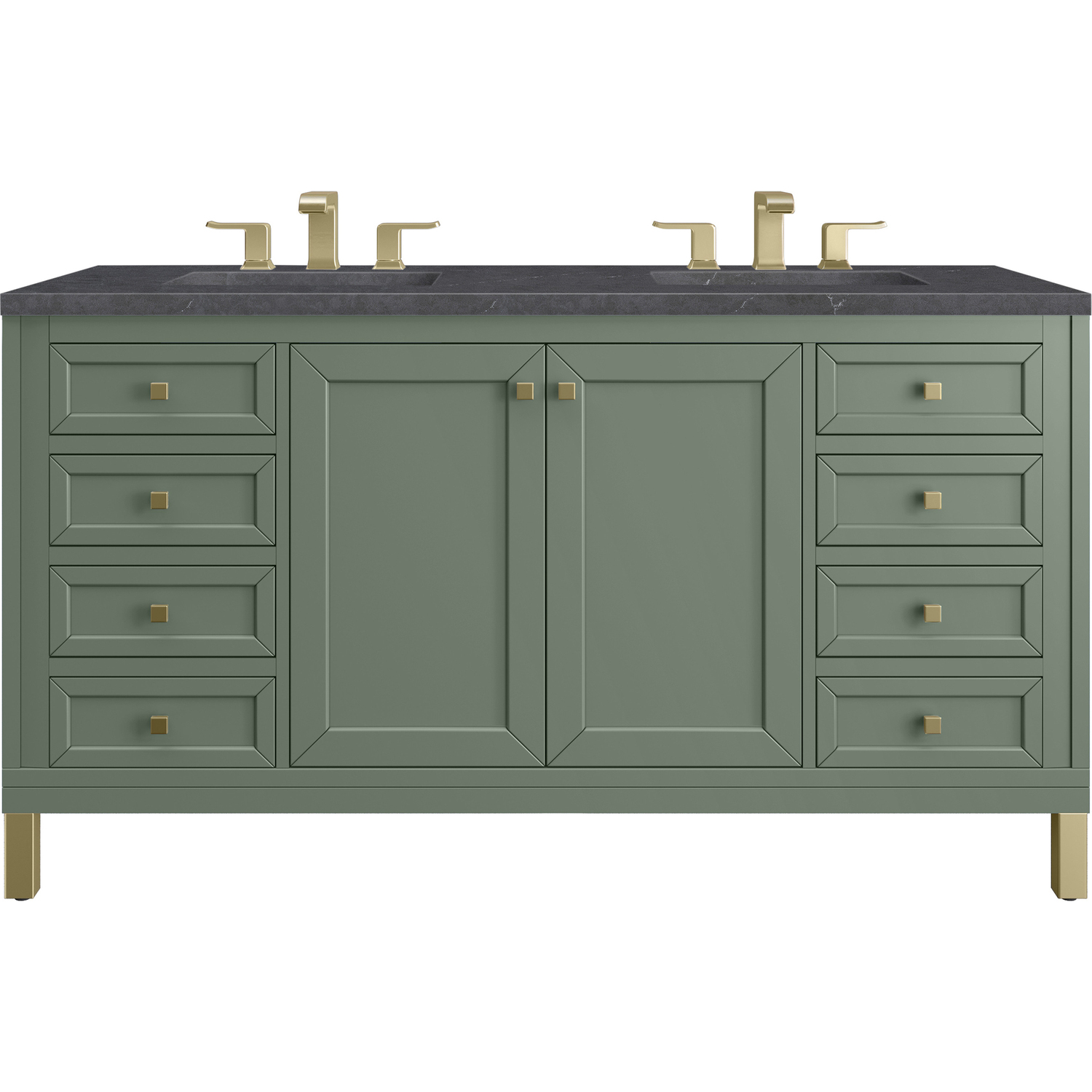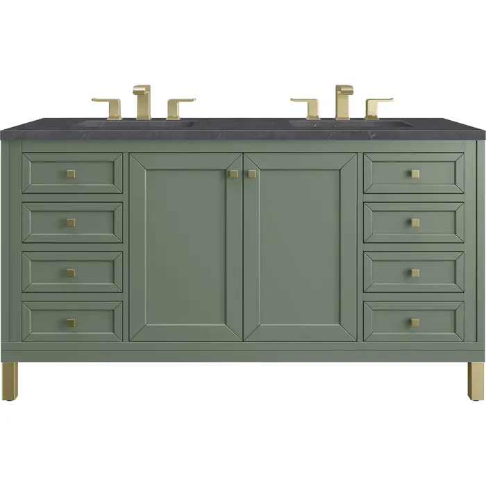 The sophisticated details and clean lines of the Chicago 60" Double Vanity by James Martin Vanities make it the perfect choice for any bathroom. Featuring a Smokey Celadon finish, this vanity offers ample storage with its double-door cabinets, adjustable interior shelves, and six drawers (two tip-outs, two standard, two double-deep). Champagne Brass knobs and legs add a contemporary touch; or choose to forego the metal legs for a modern wall-mounted installation. The addition of a matte Charcoal Soapstone Silestone® top with undermount sinks completes the look.Double-door cabinet with adjustable interior shelf; six drawers (two top-row tip-outs, two standard, and two double-deep drawers on bottom row)Drawer boxes feature English Dovetail joinery with premium, soft-close undermount drawer slides; doors feature soft-close, adjustable door hingesCabinet features a multi-stage premium finish coat to offer UV and moisture resistanceSmokey Celadon finish with Champagne Brass hardwareCountertop is pre-drilled for 8" widespread faucets; our 3cm eased edge countertops come with white porcelain rectangular sink(s) that ship separately and include mounting brackets for easy installationCrafted from solid kiln-dried PoplarDrawers lined with our signature brushed aluminum laminate for easy cleaningDual-mounted: can be installed freestanding or floatingFaucet sold separatelyJames Martin Vanities top-selling Chicago Collection is distinctly contemporary, bringing both form and function to your bathroom with clean lines and ample storage. With three available finishes and multiple hardware options, the Chicago collection can be customized to your preferences by choosing to install as a freestanding or floating vanity.1 year warranty against manufacturer's defects. We will repair or replace any defective product, if the product is defective in material or workmanship at our discretion. No warranty is expressed or implied regarding damages resulting from consumer misuse.